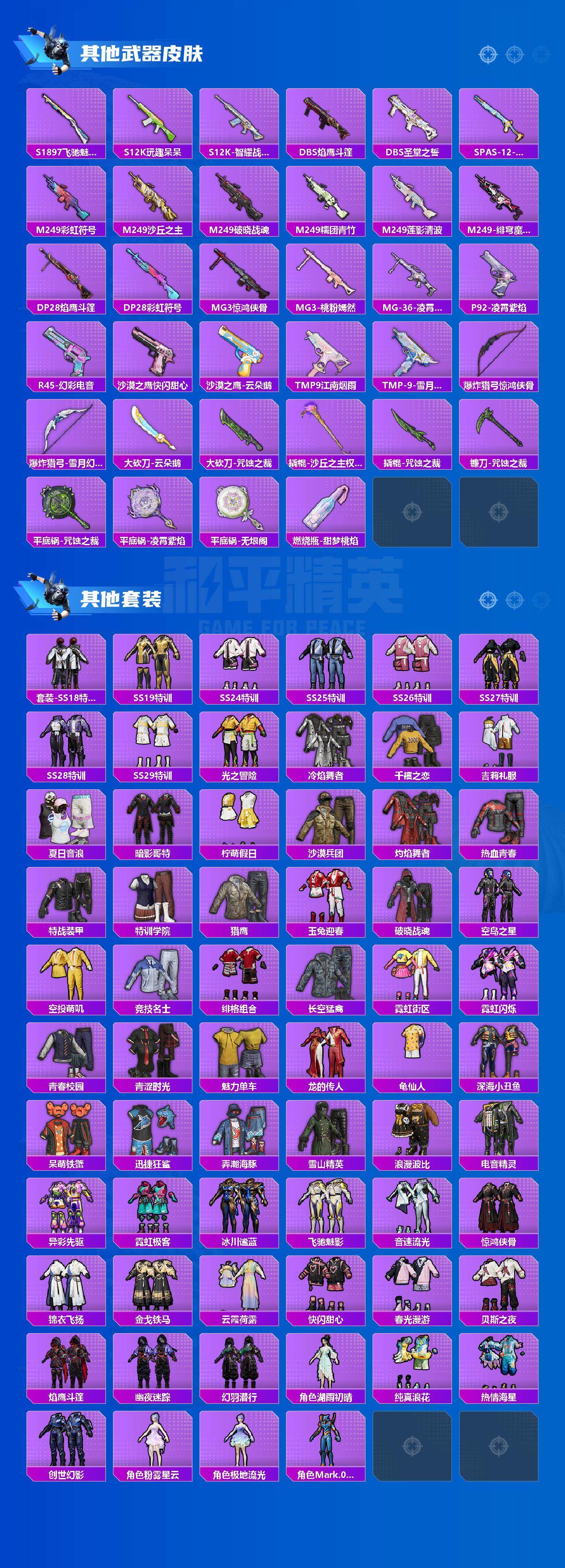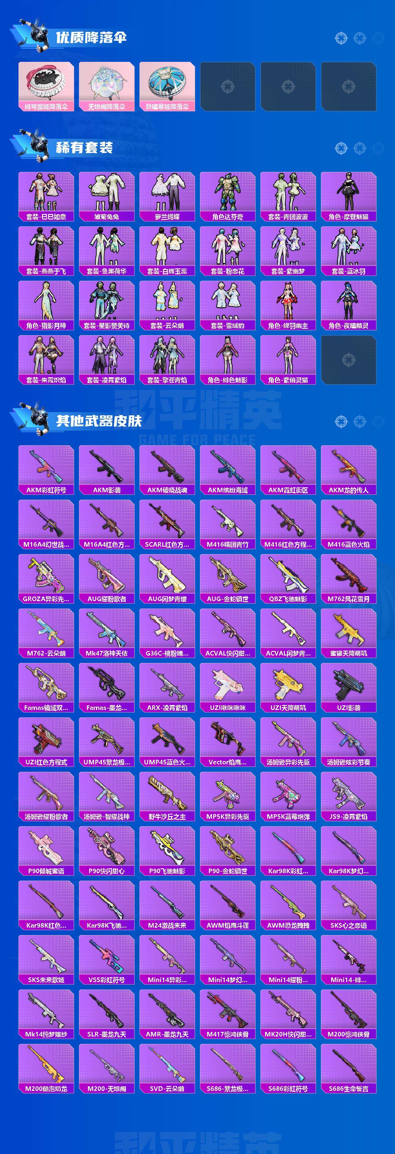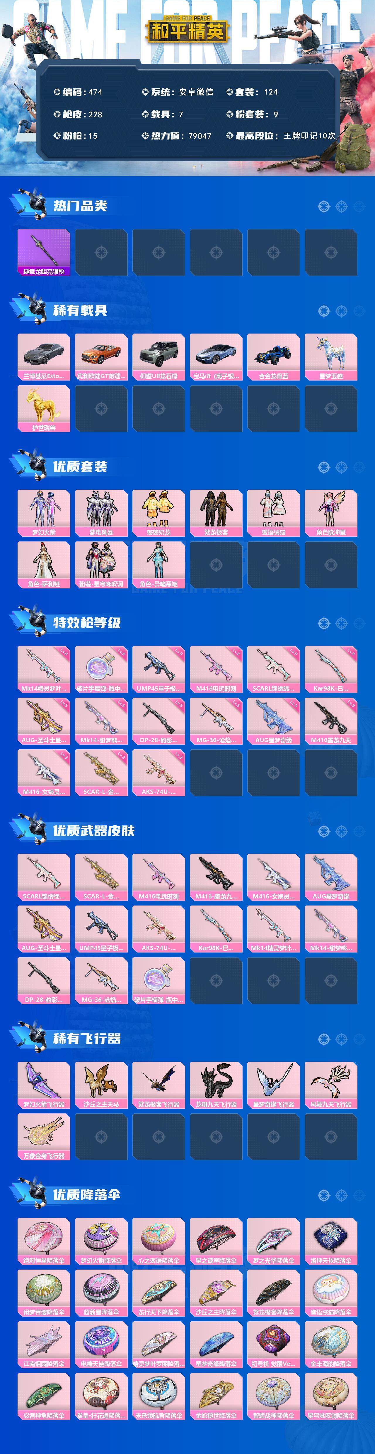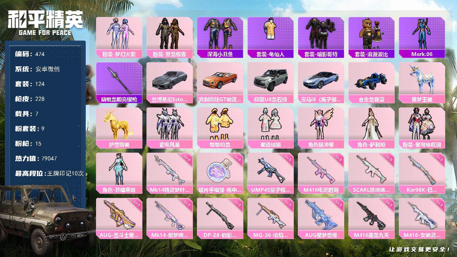 [14410226]安卓 微信-9粉装-15特效呛-7载具-9粉色飞行器-79047热力值-10王牌印记-124套装-228呛皮 【热门品类】:粉装-梦幻火箭,粉装-繁龙极客,套装-深海小丑鱼,套装-龟仙人,套装-暗影哥特,套装-浪漫波比,角色-mark.06,撬棍-龙胆亮银呛 【粉色载具】:兰博基尼estoque(银翼灰),宾利欧陆gt敞篷(火焰橘),仰望u8(龙石绿),宝马i8(离子银),合金龙骨(蓝),星梦玉骢,护世瑞兽 【粉色套装】:粉装-梦幻火箭,粉装-紫电风暴,粉装-憨憨奶龙,粉装-繁龙极客,粉装-蜜语绒猫,角色-脉冲星,角色-萨利娅,粉装-星穹咏叹调,角色-异瞳寒姬 【粉色呛皮等级】:scar-l-锦绣绵绵五级,scar-l-金蛇镇世三级,m416-电玩时刻五级,m416-墨龙九天三级,m416-女娲灵识三级,aug-星梦奇缘三级,aug-圣斗士星矢五级,ump45-量子极限五级,aks-74u-星穹咏叹调三级,kar98k-巳巳如意五级,mk14-精灵梦叶罗丽六级,mk14-甜梦熊击五级,dp-28-豹影疾电五级,mg-36-沧焰双生五级,破片手留单-瓶中星球六级 【粉色呛皮】:scar-l-锦绣绵绵,scar-l-金蛇镇世,m416-电玩时刻,m416-墨龙九天,m416-女娲灵识,aug-星梦奇缘,aug-圣斗士星矢,ump45-量子极限,aks-74u-星穹咏叹调,kar98k-巳巳如意,mk14-精灵梦叶罗丽,mk14-甜梦熊击,dp-28-豹影疾电,mg-36-沧焰双生,破片手留单-瓶中星球 【粉色飞行器】:梦幻火箭飞行器,沙丘之主天马,繁龙极客飞行器,龙翔九天飞行器,星梦奇缘飞行器,凤舞九天飞行器,万象金身飞行器 【粉色降落伞】:绝对恒星降落伞,梦幻火箭降落伞,心之恋语降落伞,星之彼岸降落伞,梦之光华降落伞,洛神天依降落伞,闲梦青缨降落伞,超新星降落伞,龙行天下降落伞,沙丘之主降落伞,繁龙极客降落伞,蜜语绒猫降落伞,江南烟雨降落伞,电糖天使降落伞,精灵梦叶罗丽降落伞,星梦奇缘降落伞,初号机 觉醒ver.降落伞,金丰海韵降落伞,忍者神龟降落伞,拳皇·狂花道降落伞,未来领航者降落伞,金蛇镇世降落伞,智耀战神降落伞,星穹咏叹调降落伞,绯穹魔姬降落伞,无垠阁降落伞,异瞳寒姬降落伞 【稀有套装】:套装-龟仙