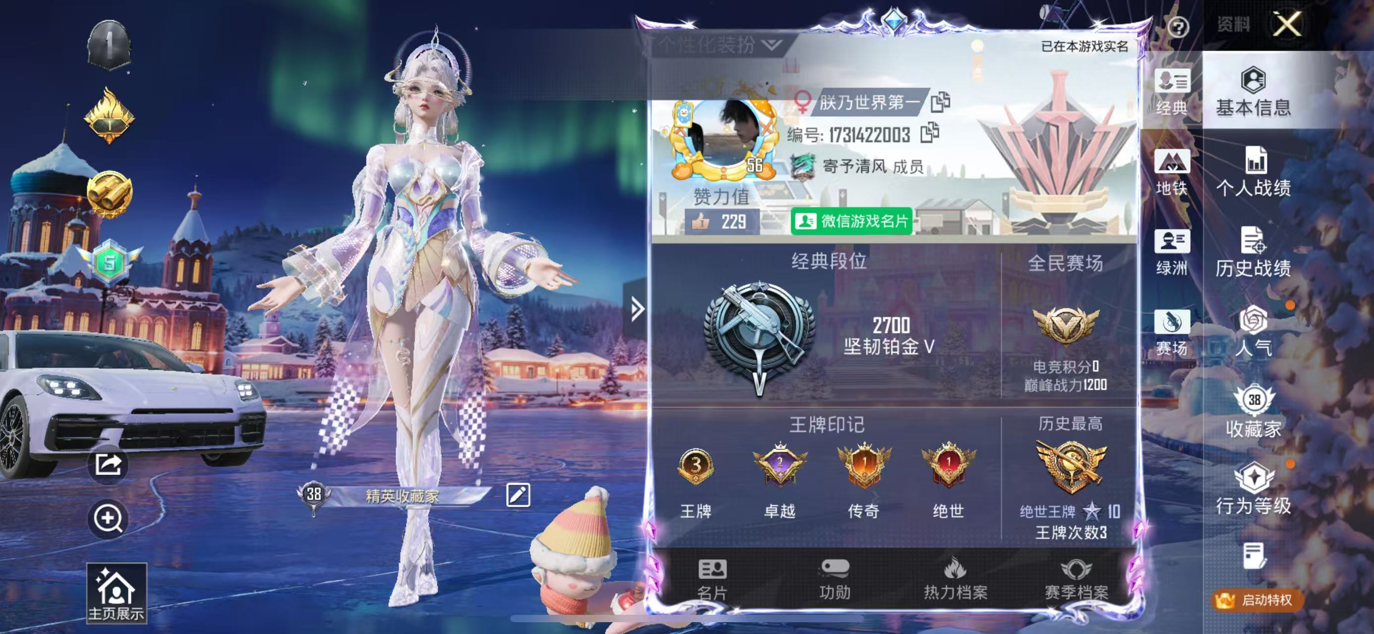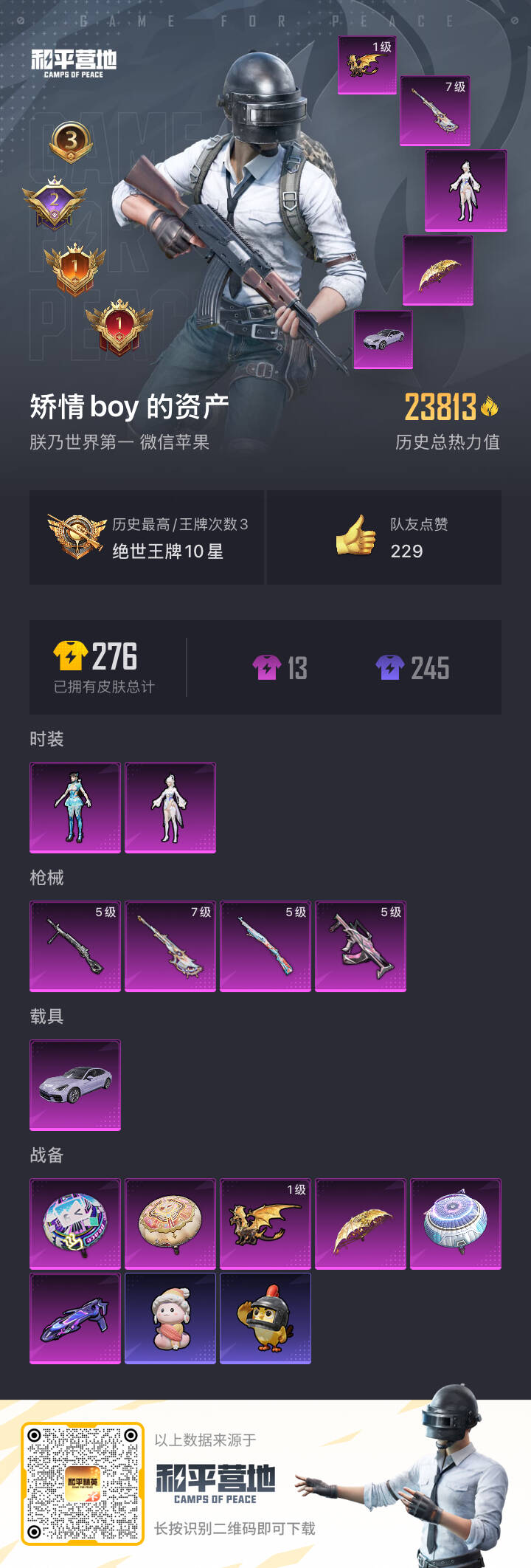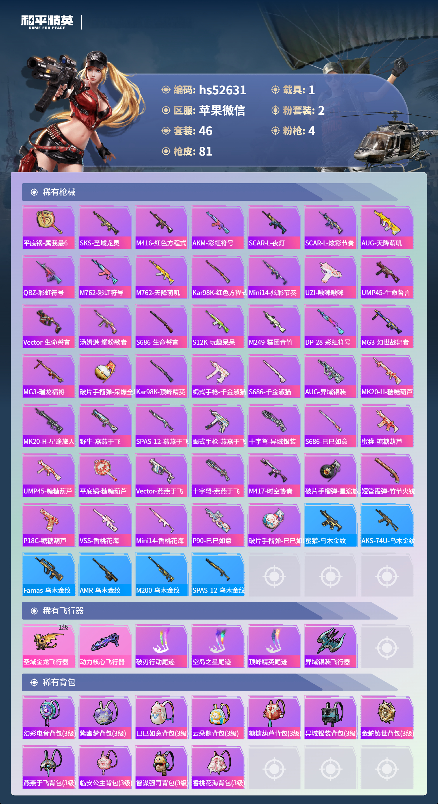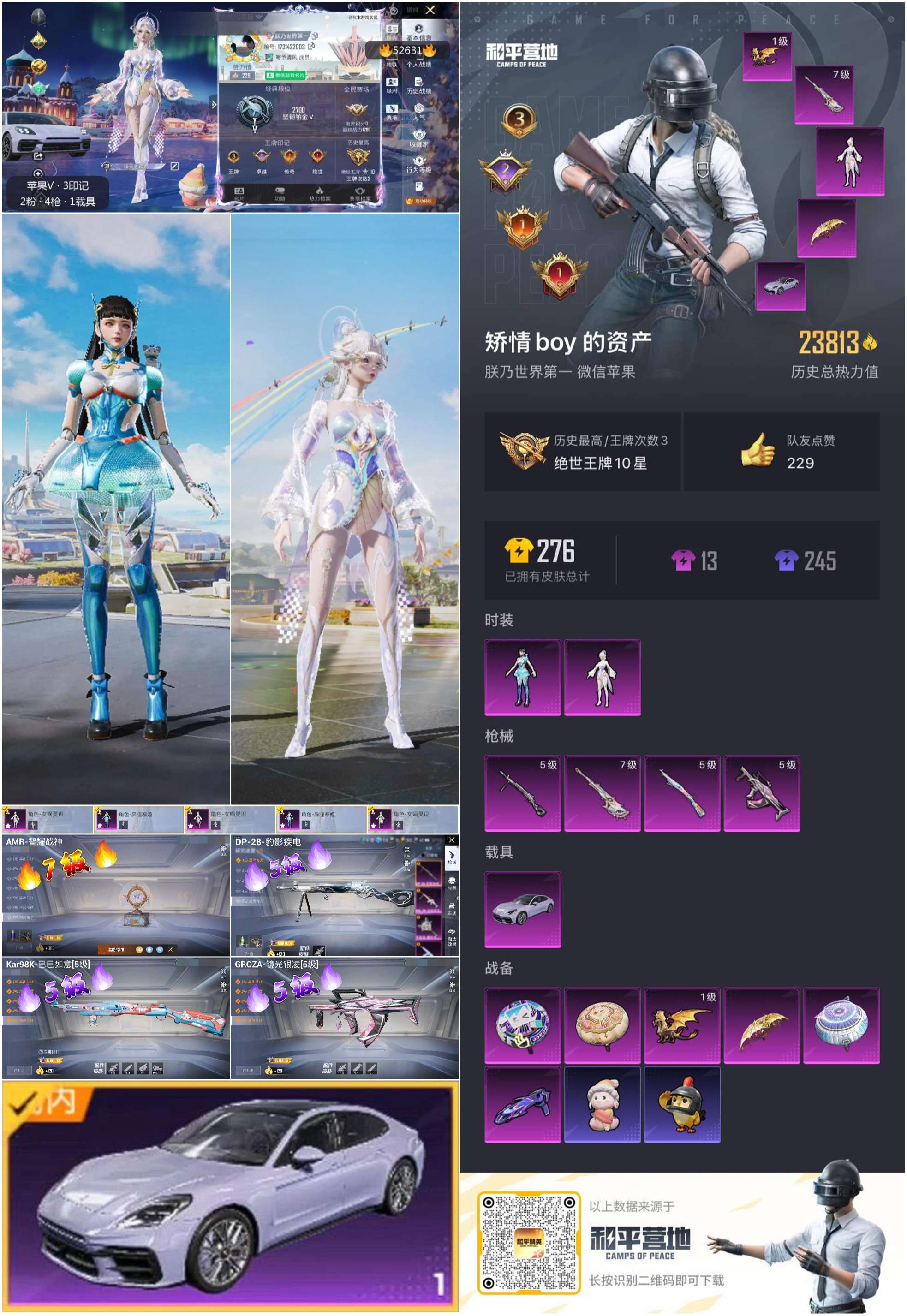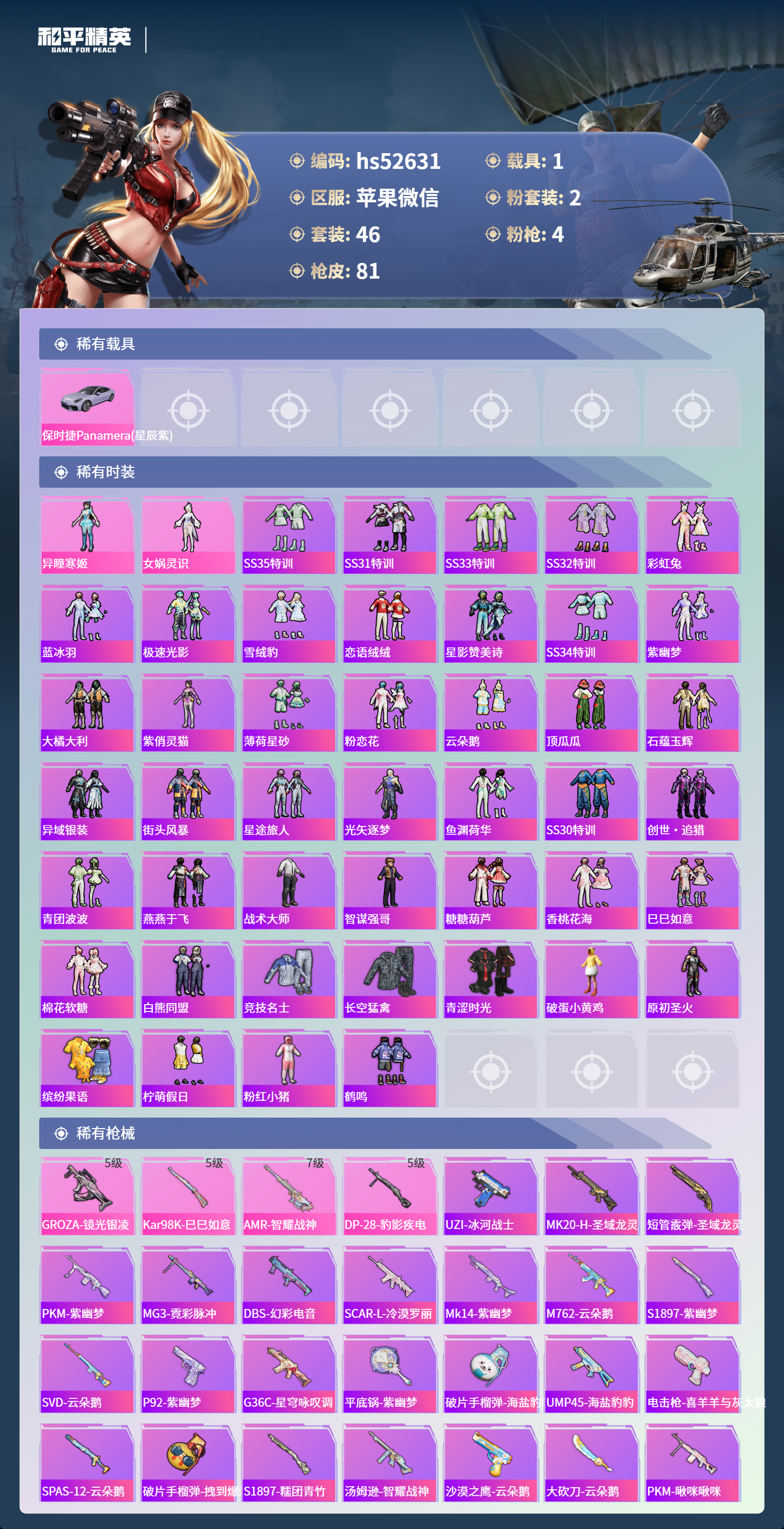 hs52631 苹果微信-3王牌印记-2粉装-4特效呛-1载具-23813热力值-46套装-81呛皮-2卓越印记-1传奇印记【2粉装】角色-女娲灵识角色-异瞳寒姬【4特效呛】groza-镜光银凌/5级amr-智耀战神/7级dp-28-豹影疾电/5级kar98k-巳巳如意/5级【1稀有载具】保时捷panamera星辰紫【46稀有时装】异瞳寒姬ss35特训ss31特训ss33