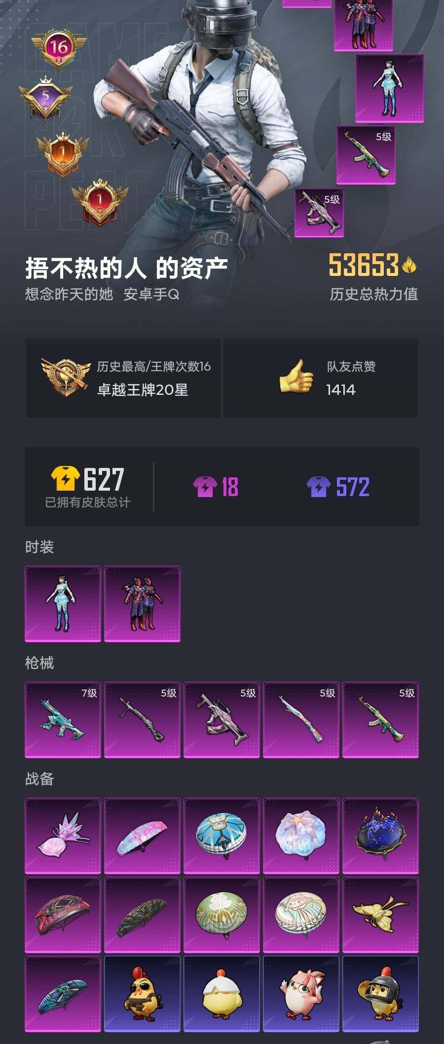 6071-2粉装-5特效呛-0载具-2粉色飞行器-53653热力值-16王牌印记-145套装-173呛皮 【热门品类】:套装-浪漫天命,套装-龟仙人,套装-暗影哥特 【粉色套装】:粉装-星之彼岸,角色-异瞳寒姬 【粉色呛皮等级】:akm-绿萝繁花五级,groza-镜光银凌五级,蜜獾-异瞳