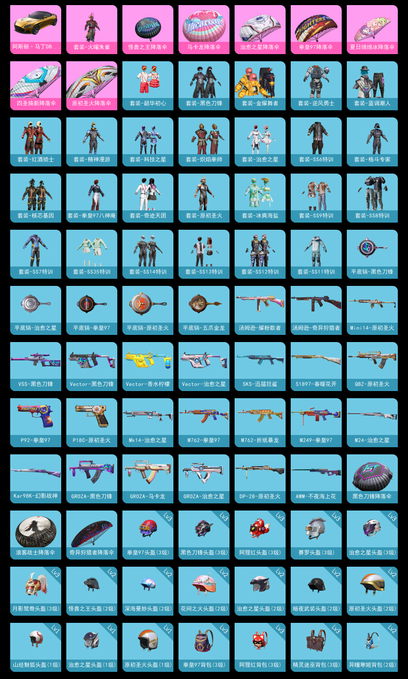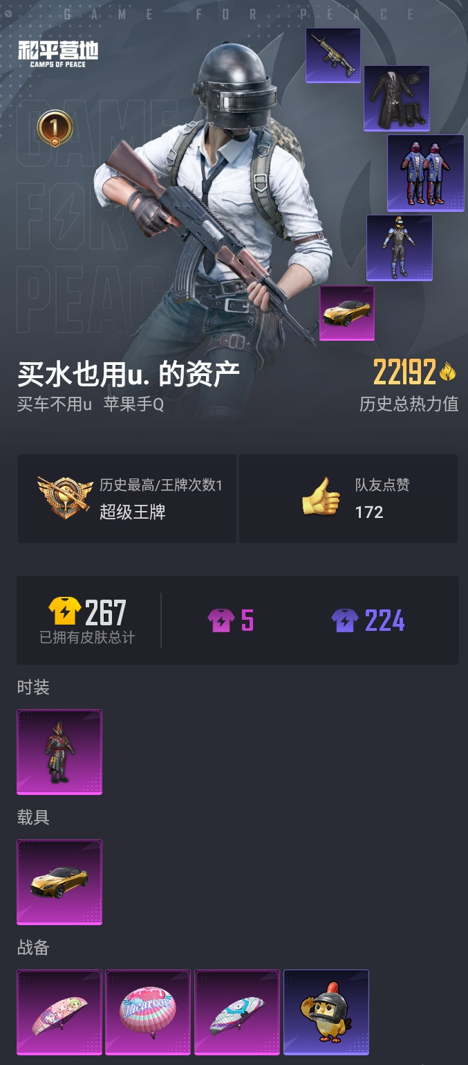【和平精英】【lyhp16930】2w2热力值 1粉装1载具 金马丁 黄金龙骨 1粉装,0特效呛,1载具,历史最高段位:超级王牌 王牌印记1次 热力值:22192,68套装,69呛械,66装备,43战备;套装:套装-火曜朱雀,套装-特训学院,套装-青年教官,套装-红色运动,套装-黄色运动,套装-蓝色运动,套装-白色伏地魔,套装-黑色伏地魔,套装-冰川格斗者,套装-深海格斗者,套装-深蓝色名流,套装-酒红色名流,套装-湖蓝色名流,套装-猛禽,套装-棕色飞行服,套装-长空猛禽,套装-竞技勇士朋克,套装-时尚圣诞,套装-冷焰舞者,套装-刚毅裁决者,套装-特战装甲,套装-战地督导,套装-突袭者,套装-龙腾端午,套装-燃烧卡路里,套装-街头潮人,套装-魅力单车,套装-风行保卫者,套装-沙漠兵团,套装-丛林猎人,套装-传奇侦探,套装-幻世战舞者,套装-金耀舞者,套装-蓝调潮人,套装-甜蜜熊情侣,套装-冰川特警,套装-疯狂小兔子,套装-圣诞大吉,套装-红酒骑士,套装-北国孤狼,套装-ss6特训,套装-拳皇97八神庵,套装-炽焰拳师,套装-格斗专家,套装-奇迹天团,套装-跃动心情,套装-ss7特训,套装-黑色刀锋,套装-核芯基因,套装-精神漫游,套装-霓虹街区,套装-ss8特训,套装-萌黄之夏,套装-夏日音浪,套装-ss9特训,套装-牛气满满,套装-韶华初心,套装-ss11特训,套装-原初圣火,套装-逆风勇士,套装-ss12特训,套装-牛气冲天,套装-治愈之星,套装-科技之星,套装-ss13特训,套装-冰爽海盐,套装-ss14特训,套装-ss35特训;呛皮:groza-生命誓言,groza-黑色刀锋,groza-马卡龙,groza-治愈之星,groza-乌木金纹,q-原初圣火,q-乌木金纹,m762-折纸暴龙,m762-拳皇97,m762-牛气冲天,m762-乌木金纹,akm-灼热熔岩,akm-破晓战魂,akm-霓虹街区,akm-夜灯,akm-乌木金纹,scar-l-黄金龙骨,scar-l-炫彩节奏,scar-l-乌木金纹,m416-夜灯,m416-蓝色火焰,m416-乌木金纹,m16a4-乌木金纹,awm-不夜海上花,awm-乌木金纹,kar98k-幻影战神,kar98k-彩虹符号,win94-乌木金纹,m24-治愈之星,mini14-原初圣火,mini14-炫彩节奏,mini14-乌木金纹,sks-迅猛狂鲨,sks-夜灯,vss-黑色刀锋,vss-乌木金纹,mk14-治愈之星,vect-生命誓言,vect-黑色刀锋,vect-彩虹符号,vect-治愈之星,vect-香水柠檬,vect-乌木金纹,uzi-红色方程式,uzi-乌木金纹,汤姆逊-奇异狩猎者,汤姆逊-耀粉歌者,汤姆逊-乌木金纹,ump45-生命誓言,s12k-夜灯,s12k-乌木金纹,s686-生命誓言,s686-乌木金纹,s1897-春暖花开,dp-28-原初圣火,dp-28-乌木金纹,m249-拳皇97,m249-乌木金纹,mg3-幻世战舞者,p18c-原初圣火,p92-拳皇97,平底锅-时之沙漏,平底锅-五爪金龙,平底锅-拳皇97,平底锅-黑色刀锋,平底锅-缤纷糖果,平底锅-原初圣火,平底锅-治愈之星,撬棍-传奇侦探;载具:阿斯顿·马丁dbs金;降落伞:粉色滑翔尾迹; 详情看图