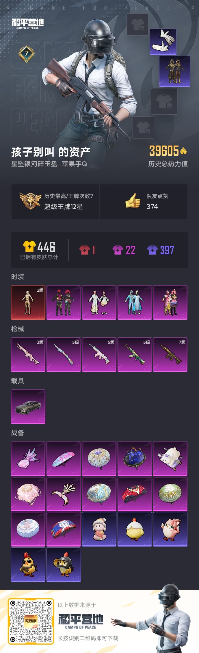 【和平精英】【txhp4641】4粉装,5特效呛,1载具,历史最高段位:超级王牌12星 王牌印记7次 热力值:39605,76套装,123呛械,156装备,74战备;套装:沙丘之主-图卡盟,套装-雪国幻梦,套装-缤纷油彩,套装-放客神游,套装-莲影清波,套装-帅气教官,套装-竞技名士,套装-长空猛禽,套装-海岛探路者,套装-贵族骑装,套装-特战英豪,套装-坚韧舞者,套装-金耀舞者,套装-蓝调潮人,套装-青涩时光,套装-缤纷果语,套装-冰川特警,套装-沙漠守护者,套装-粉红小猪,套装-破蛋小黄鸡,套装-疯狂小兔子,套装-霓虹街区,套装-战术大师,套装-耀粉歌者,套装-绯格组合,套装-神气柴柴,套装-懵萌河马,套装-青玉碎影,套装-ss24特训,套装-日照花林,套装-龟仙人,套装-涂山之恋,套装-ss25特训,套装-惊鸿侠骨,套装-锦衣飞扬,套装-晨曦薄雾,套装-绝对偶像,套装-香桃花海,套装-龙的传人,套装-冰河战士,套装-ss26特训,套装-快闪甜心,套装-春光漫游,套装-空岛之星,套装-贝斯之夜,玩偶服-菲菲,套装-ss27特训,套装-恋语绒绒,套装-老实芭蕉,套装-街头风暴,套装-ss29特训,角色-无面战甲,角色-摩登魅猫,套装-星途旅人,套装-ss30特训,套装-青团波波,套装-棉花软糖,套装-糖糖葫芦,套装-ss31特训,套装-鱼渊荷华,套装-燕燕于飞,套装-智谋强哥,套装-晶灵使者,角色-海琴烟,套装-紫幽梦,套装-晶辉守护,套装-ss33特训,套装-巳巳如意,套装-ss32特训,套装-蓝冰羽,套装-顶瓜瓜,套装-霓虹热舞,套装-炫彩糖果,套装-ss34特训,套装-ss35特训,套装-萌鸡速递;呛皮:aug-天降萌叽,aug-闲梦青缨,aug-异域银装,m762-奇异狩猎者,m762-甜心宝贝,m762-天降萌叽,5级scar-l-锦绣绵绵,scar-l-黄金龙骨,scar-l-夜灯,scar-l-炫彩节奏,scar-l-粉锦千层,scar-l-星途旅人,ac-val-乌木金纹,ac-val-闲梦青缨,ac-val-快闪甜心,蜜獾-糖糖葫芦,蜜獾-乌木金纹,g36c-懵萌河马,g36c-六号树人,m16a4-幻世战舞者,groza-懵萌河马,groza-无面战甲,5级akm-绿萝繁花,akm-霓虹街区,akm-沙漠守护者,akm-萝萝小趴兔,akm-龙的传人,famas-乌木金纹,7级m416-五爪金龙,m200-惊鸿侠骨,m200-乌木金纹,5级kar98k-巳巳如意,kar98k-彩虹符号,kar98k-顶峰精英,win94-粉樱探戈,win94-乌木金纹,awm-超新星,awm-盛世惊鸿,m24-奇异狩猎者,amr-妙红点点,amr-乌木金纹,莫辛纳甘-懵萌河马,mk20-h-快闪甜心,mk20-h-星途旅人,mk20-h-糖糖葫芦,mk20-h-乌木金纹,slr-沙漠守护者,vss-香桃花海,m417-惊鸿侠骨,mini14-炫彩节奏,mini14-香桃花海,3级mk14-盛世惊鸿,mk14-冰河战士,mk14-紫幽梦,sks-糯团青竹,野牛-天星战神,野牛-燕燕于飞,p90-甜蜜旋律,p90-快闪甜心,p90-巳巳如意,p90-乌木金纹,aks-74u-乌木金纹,ump45-夜灯,ump45-糖糖葫芦,uzi-天降萌叽,uzi-啾咪啾咪,uzi-盛世惊鸿,uzi-炫彩糖果,汤姆逊-奇异狩猎者,汤姆逊-耀粉歌者,汤姆逊-炫彩节奏,汤姆逊-天降萌叽,汤姆逊-智耀战神,vect-燕燕于飞,mp5k-乌木金纹,s686-奇异狩猎者,s686-生命誓言,spas-12-燕燕于飞,spas-12-狂鲨锋刃,spas-12-乌木金纹,s12k-玩趣呆呆,s1897-紫幽梦,dbs-甜心亚梦,dbs-圣堂之誓,m249-百万伏特,m249-彩虹符号,m249-糯团青竹,m249-莲影清波,m249-无面战甲,pkm-懵萌河马,pkm-紫幽梦,mg3-幻世战舞者,mg3-摩登王国,mg3-惊鸿侠骨,mg3-霓彩脉冲,dp-28-沙漠守护者,dp-28-彩虹符号,蝎式手呛-闲梦青缨,蝎式手呛-燕燕于飞,p92-紫幽梦,p1911-无面战甲,p18c-糖糖葫芦,沙墨之鹦-快闪甜心,短管霰弹2b战斗服款,大砍刀-万古烈焰,大砍刀-盛世惊鸿,大砍刀-鬼刀,平底锅-懵萌河马,平底锅-惊鸿侠骨,平底锅-快闪甜心,平底锅-空岛之星,平底锅-糖糖葫芦,平底锅-紫幽梦,撬棍-甜心宝贝,破片手留单-呆爆全场,破片手留单-星途旅人,破片手留单-拽到爆炸,破片手留单-巳巳如意,铝热弹-炫彩糖果,十子怒-燕燕于飞,十子怒-异域银装,突击盾牌-万古烈焰,爆炸猎弓-惊鸿侠骨;载具:宾利飞驰布罗德盖棕双色;降落伞:酣梦熊熊飞行器,凤舞九天飞行器,炫彩糖果飞行器,火焰蝠人飞行服,顶峰精英尾迹; 详情看图7王牌印记 3.9w热力值 1红 4粉 5特 1载具 2级图卡盟 冰雪 猪妹 放客 黑丝 满级五爪m4 3级盛世惊鸿妹控 宾利
