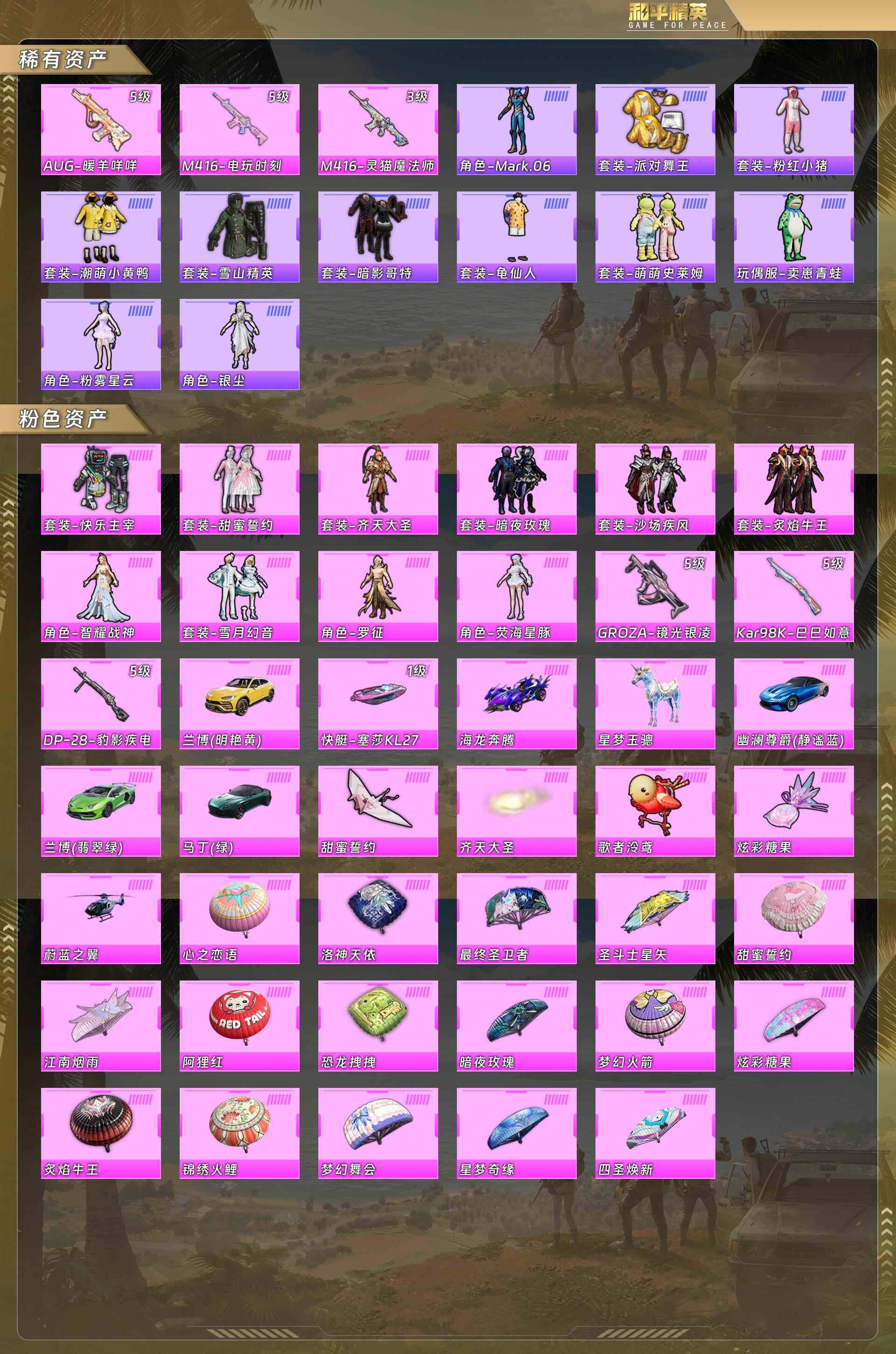 公主号-地铁满天赋/快乐主宰/甜蜜誓约/齐天大圣/暗夜玫瑰/沙场疾风/炙焰牛王/智耀战神/雪月幻音/罗征/荧海星豚/镜光银凌5级/98k巳巳如意5级/dp28豹影疾电5级/兰博基尼黄/塞莎粉1级/海龙奔腾/星梦玉骢/幽澜尊爵蓝/兰博基尼绿/阿斯顿马丁绿/蔚蓝之翼(10粉套6粉呛7载具)附带地铁3钻苏尔南手呛 没战神框hp3867-4粉色飞行器-95818热力值-12王牌印记-210套装-259呛皮 【热门品类】:套装-派对舞王,套装-小丑鱼,套装-龟仙人,套装-潮萌小黄鸭,套装-暗影哥特,套装-粉红小猪,角色-mark.06 【粉色载具】:兰博基尼aventad svj(翡翠绿),兰博基尼urus(明艳黄),阿斯顿马丁dbs(绿),幽澜尊爵(静谧蓝),海龙奔腾,空客h135-蔚蓝之翼,快艇-塞莎kl27(霓虹粉),星梦玉骢 【粉色套装】:粉装-快乐主宰,粉装-甜蜜誓约,粉装-暗夜玫瑰,粉装-齐天大圣,粉装-沙场疾风,粉装-炙焰牛王,粉装-雪月幻音,角色-智耀战神,角色-罗征,角色-荧海星豚 【粉色呛皮等级】:m416-电玩时刻五级,m416-灵猫魔法师三级,groza-镜光银凌五级,aug-暖羊咩咩五级,kar98k-巳巳如意五级,dp-28-豹影疾电五级 【粉色呛皮】:m416-电玩时刻,m416-灵猫魔法师,groza-镜光银凌,aug-暖羊咩咩,kar98k-巳巳如意,dp-28-豹影疾电 【粉色飞行器】:甜蜜誓约飞行器,齐天大圣飞行器,歌者泠鸢飞行器 【粉色降落伞】:梦幻火箭降落伞,甜蜜誓约降落伞,四圣焕新降落伞,心之恋语降落伞,锦绣火鲤降落伞,阿狸红降落伞,暗夜玫瑰降落伞,洛神天依降落伞,恐龙拽拽降落伞,炙焰牛王降落伞,梦幻舞会降落伞,江南烟雨降落伞,星梦奇缘降落伞,圣斗士星矢降落伞,最终圣卫者降落伞 【稀有套装】:套装-龟仙人,套装-巳巳如意,套装-雏菊兔兔,套装-萝兰蝴蝶,套装-小熊娃娃,角色-狂花道·雅典娜,套装-糖糖葫芦,套装-青团波波,套装-棉花软糖,套装-燕燕于飞,套装-鱼渊荷华,角色-蜜桃派对,套装-萌萌史莱姆,套装-紫幽梦,套装-蓝冰羽,套装-霓虹热舞,套装-彩虹兔,套装-云朵鹅,套装-雪绒豹,套装-蜜露汐语 【稀有呛皮】:akm-四圣焕新,akm-彩虹符号,akm-江南烟雨,akm-灼热熔岩,akm-百万伏特,akm-破晓战魂,akm-萌趣颜团子,akm-虎虎生威,akm-龙的传人,m16a4-幻世战舞者,m16a4-甜心亚梦,m16a4-红色方程式,m16a4-蓝色火焰,scar-l-暗夜玫瑰,scar-l-炫彩节奏,scar-l-玉兔迎春,scar-l-甜蜜誓约,scar-l-红色方程式,m416-糯团青竹,m416-红色方程式,m416-蓝色火焰,groza-异彩先驱,groza-彩虹符号,groza-春暖花开,groza-黑色刀锋,aug-天降萌叽,aug-怪笑疯兔,aug-甜蜜菠萝,aug-耀粉歌者,aug-青春冒险家,q-原初圣火,q-彩虹符号,q-洛神天依,q-绚金瑰梦,q-飞驰魅影,m762-天降萌叽,m762-彩虹符号,m762-拳皇97,m762-牛气冲天,m762-瑞龙福将,m762-镭射皇者,m762-风花雪月,m762-云朵鹅,mk47-洛神天依,mk47-青春冒险家,g36c-暗夜玫瑰,g36c-花间之火,g36c-金风玉露,g36c-桃粉嫣然,ac-val-甜心亚梦,蜜獾-垂柳戏鸭,蜜獾-天降萌叽,蜜獾-娇憨猪猪,uzi-天降萌叽,uzi-娇憨猪猪,uzi-幽秘魅影,uzi-炫彩节奏,uzi-红色方程式,uzi-魔法学院,ump45-春暖花开,ump45-生命誓言,ump45-蓝色火焰,vect-焰鹰斗篷,vect-暗夜玫瑰,vect-生命誓言,vect-黑色刀锋,汤姆逊-勇闯险境,汤姆逊-天降萌叽,汤姆逊-奇异狩猎者,汤姆逊-异彩先驱,汤姆逊-炫彩节奏,汤姆逊-耀粉歌者,野牛-青春冒险家,野牛-最终圣卫者,mp5k-异彩先驱,mp5k-甜蜜誓约,mp5k-蓝莓炮弹,aks-74u-鬼刀,p90-飞驰魅影,p90-巳巳如意,kar98k-梦幻火箭,kar98k-洛神天依,kar98k-深海曼妙,kar98k-红色方程式,kar98k-飞驰魅影,kar98k-最终圣卫者,m24-影袭,m24-炫彩节奏,m24-冰封烈焰,awm-焰鹰斗篷,sks-勇闯险境,sks-夜灯,vss-华贵君王,vss-彩虹符号,vss-镭射皇者,vss-黑色刀锋,vss-虚空骇客,mini14-原初圣火,mini14-异彩先驱,mini14-炫彩节奏,mini14-耀粉歌者,win94-瑞龙福将,slr-四圣焕新,slr-娇憨猪猪,qbu-锦绣火鲤,qbu-青春冒险家,svd-云朵鹅,s686-生命誓言,s686-红色方程式,s686-魔法学院,s686-巳巳如意,s1897-勇闯险境,s1897-碧影闪光,s1897-镭射皇者,s1897-飞驰魅影,s12k-瑞龙福将,s12k-破晓战魂,s12k-娇憨猪猪,s12k-幻世战舞者,s12k-智耀战神,dbs-焰鹰斗篷,dbs-甜心亚梦,spas-12-云朵鹅,m249-四圣焕新,m249-工程核心,m249-彩虹符号,m249-拳皇97,m249-破晓战魂,m249-镭射皇者,m249-萌萌史莱姆,dp-28-焰鹰斗篷,dp-28-原初圣火,dp-28-甜心亚梦,dp-28-紫翼圣骑,dp-28-齐天大圣,mg3-幻世战舞者,mg3-瑞龙福将,p92-拳皇97,p18c-原初圣火,沙墨之鹦-云朵鹅,大砍刀-云朵鹅,破片手留单-巳巳如意 【其他套装】:套装-ss5特训,套装-ss6特训,套装-ss7特训,套装-ss8特训,套装-ss10特训,套装-ss12特训,套装-ss13特训,套装-ss14特训,套装-ss15特训,套装-ss16特训,套装-ss17特训,套装-ss18特训,套装-ss19特训,套装-ss20特训,套装-ss21特训,套装-ss23特训,套装-ss24特训,套装-ss25特训,套装-ss27特训,套装-ss28特训,套装-ss29特训,套装-丛林猎人,套装-人气偶像,套装-传奇侦探,套装-冷焰舞者,套装-北国孤狼,套装-夏日音浪,套装-完美偶像,套装-幻世战舞者,套装-幻影武者,套装-怒火燎原,套装-战地督导,套装-拳皇97草薙京,套装-旭日情侣,套装-暗影哥特,套装-极速红龙,套装-格斗专家,套装-格斗先锋,套装-森林游猎者,套装-橘黑制服,套装-海岛探路者,套装-涂山之恋,套装-深蓝色名流,套装-湖蓝色名流,套装-滨海假日,套装-滨海厨神,套装-灰色格斗者,套装-灼焰舞者,套装-炫蓝之夏,套装-炽焰拳师,套装-热血青春,套装-牛气冲天,套装-牛气满满,套装-特种颜团子,套装-特训学院,套装-猎鹰,套装-猛禽,套装-甜心信使