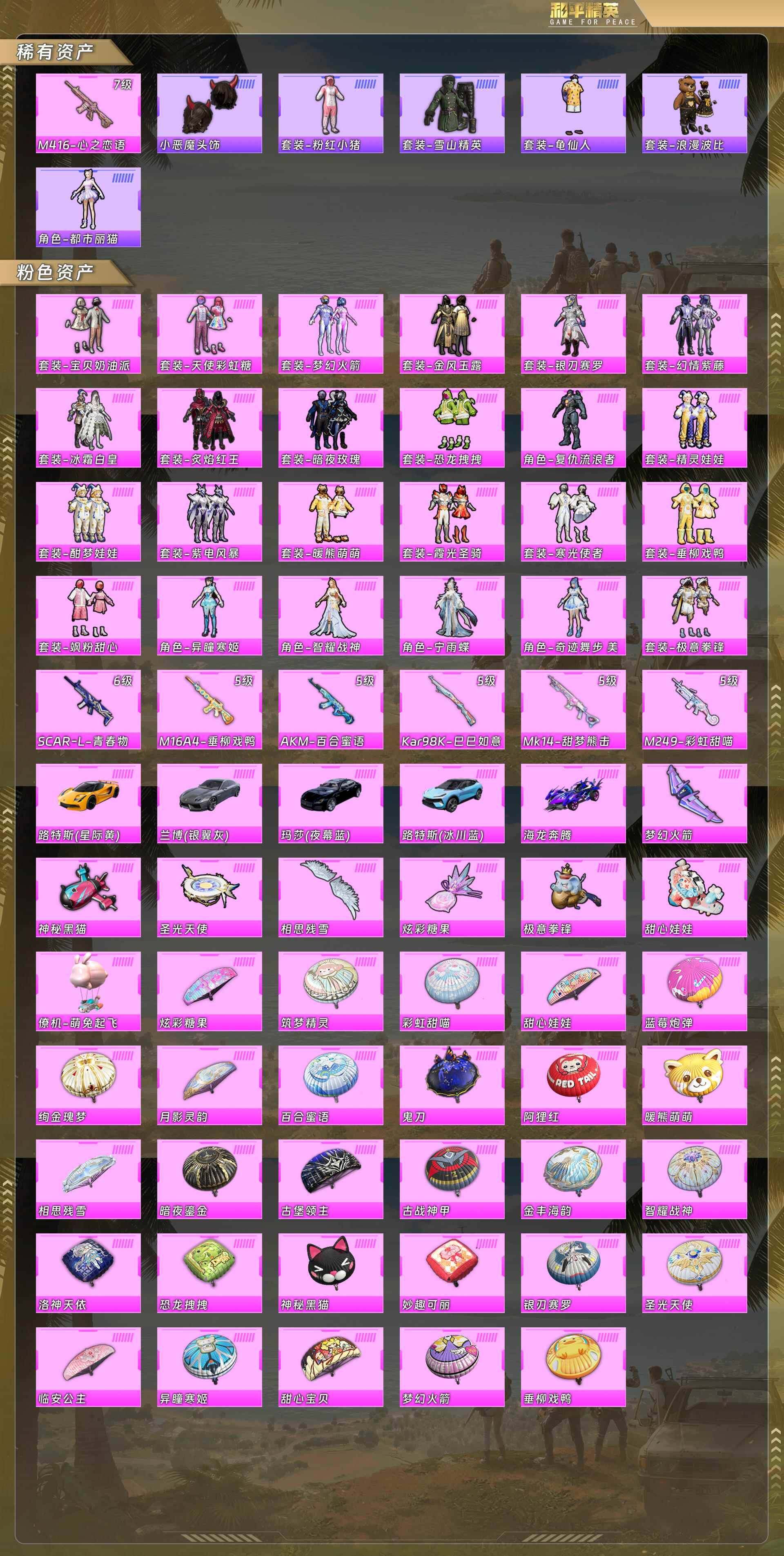公主号-宝贝奶油派/天使彩虹糖/梦幻火箭/金风玉露/恐龙拽拽/精灵娃娃/酣梦娃娃/紫电风暴/暖熊萌萌/寒光使者/垂柳戏鸭/飒粉甜心/异瞳寒姬/智耀战神/宁雨蝶/奇迹舞步美琪/极意拳锋/scar青春物语6级/m16垂柳戏鸭5级/ak百合蜜语5级/m249彩虹甜喵5级/路特斯黄/兰博基尼灰/玛莎拉蒂蓝/路特斯蓝/海龙奔腾/萌兔起飞(24粉套7粉呛5载具)没战神框hp4161-7粉色飞行器-114110热力值-11王牌印记-250套装-321呛皮 【热门品类】:粉装-梦幻火箭,套装-忍者信条,套装-ss1特训,套装-龟仙人,套装-浪漫波比,套装-粉红小猪 【粉色载具】:兰博基尼estoque(银翼灰),路特斯evija(星际黄),路特斯eletre(冰川蓝),玛莎拉蒂quattropte(夜幕蓝),海龙奔腾,僚机-萌兔起飞 【粉色套装】:粉装-宝贝奶油派,粉装-天使彩虹糖,粉装-梦幻火箭,粉装-金风玉露,粉装-银刃赛罗,粉装-冰霜白皇,粉装-炙焰红王,粉装-暗夜玫瑰,粉装-幻情紫藤,粉装-精灵娃娃,粉装-酣梦娃娃,粉装-恐龙拽拽,粉装-紫电风暴,角色-复仇流浪者,粉装-暖熊萌萌,粉装-垂柳戏鸭,粉装-霞光圣骑,粉装-寒光使者,粉装-飒粉甜心,角色-智耀战神,角色-宁雨蝶,角色-奇迹舞步 美琪,角色-异瞳寒姬,粉装-极意拳锋 【粉色呛皮等级】:akm-百合蜜语五级,m16a4-垂柳戏鸭五级,scar-l-青春物语六级,m416-心之恋语七级,kar98k-巳巳如意五级,mk14-甜梦熊击五级,m249-彩虹甜喵五级 【粉色呛皮】:akm-百合蜜语,m16a4-垂柳戏鸭,scar-l-青春物语,m416-心之恋语,kar98k-巳巳如意,mk14-甜梦熊击,m249-彩虹甜喵 【粉色飞行器】:梦幻火箭飞行器,神秘黑猫飞行器,相思残雪飞行器,甜心娃娃飞行器,圣光天使飞行器,极意拳锋飞行器 【粉色降落伞】:甜心宝贝降落伞,梦幻火箭降落伞,神秘黑猫降落伞,古堡领主降落伞,阿狸红降落伞,银刃赛罗降落伞,相思残雪降落伞,古战神甲降落伞,洛神天依降落伞,蓝莓炮弹降落伞,绚金瑰梦降落伞,甜心娃娃降落伞,百合蜜语降落伞,恐龙拽拽降落伞,筑梦精灵降落伞,圣光天使降落伞,妙趣可丽降落伞,暖熊萌萌降落伞,垂柳戏鸭降落伞,彩虹甜喵降落伞,暗夜鎏金降落伞,金丰海韵降落伞,临安公主降落伞,月影灵韵降落伞,鬼刀降落伞,智耀战神降落伞,异瞳寒姬降落伞 【稀有套装】:套装-龟仙人,套装-巳巳如意,套装-雏菊兔兔,套装-萝兰蝴蝶,角色-都市丽猫,套装-燕燕于飞,套装-鱼渊荷华,套装-旋风灵鼠,套装-紫幽梦,套装-蓝冰羽,套装-星渊小夜曲,套装-霓虹热舞,套装-云朵鹅,套装-雪绒豹,角色-绯色魅影,角色-紫俏灵猫,套装-炫彩糖果 【稀有呛皮】:aug-冰晶雪宝,akm-冰凉西瓜,akm-夜灯,akm-彩虹符号,akm-玉龙,akm-生命誓言,akm-破晓战魂,akm-虎虎生威,akm-霓虹街区,akm-棋盘冕主,m16a4-凝视深渊,m16a4-幻世战舞者,m16a4-机械英豪,m16a4-甜心亚梦,m16a4-红色方程式,scar-l-夜灯,scar-l-炫彩节奏,scar-l-玉兔迎春,scar-l-红色方程式,scar-l-金风玉露,m416-夜灯,m416-神秘黑猫,m416-红色方程式,m416-蓝色火焰,groza-异彩先驱,groza-彩虹符号,groza-恐龙拽拽,groza-懵萌河马,groza-春暖花开,groza-治愈之星,groza-生命誓言,groza-田园牧歌,groza-黑色刀锋,aug-圣光天使,aug-天降萌叽,aug-幻影战神,aug-灵符少年,aug-甜蜜菠萝,aug-耀粉歌者,aug-青春冒险家,q-原初圣火,q-妙趣可丽,q-彩虹符号,q-洛神天依,q-相思残雪,q-神秘黑猫,q-诡娃娃,q-飞驰魅影,m762-乘风破浪,m762-天降萌叽,m762-彩虹甜喵,m762-彩虹符号,m762-拳皇97,m762-暖熊萌萌,m762-深海曼妙,m762-牛气冲天,m762-瑞龙福将,m762-甜心宝贝,m762-诡娃娃,m762-镭射皇者,m762-云朵鹅,mk47-妙红点点,mk47-洛神天依,g36c-不夜海上花,g36c-懵萌河马,g36c-炙焰牛王,ac-val-彩虹甜喵,ac-val-甜心亚梦,ac-val-时光之吻,蜜獾-垂柳戏鸭,蜜獾-娇憨猪猪,uzi-众神之王,uzi-啾咪啾咪,uzi-娇憨猪猪,uzi-红色方程式,ump45-夜灯,ump45-灵符少年,ump45-生命誓言,ump45-蓝色火焰,ump45-诡娃娃,vect-彩虹符号,vect-治愈之星,vect-生命誓言,vect-田园牧歌,vect-黑色刀锋,vect-龙虾霸霸,汤姆逊-勇闯险境,汤姆逊-天降萌叽,汤姆逊-奇异狩猎者,汤姆逊-异彩先驱,汤姆逊-炫彩节奏,汤姆逊-耀粉歌者,野牛-机械英豪,野牛-青春冒险家,mp5k-众神之王,mp5k-异彩先驱,mp5k-繁花小夜曲,mp5k-自由猎手,p90-筑梦精灵,p90-飞驰魅影,p90-金蛇镇世,p90-巳巳如意,kar98k-勇闯险境,kar98k-彩虹符号,kar98k-梦幻火箭,kar98k-洛神天依,kar98k-炫彩节奏,kar98k-红色方程式,kar98k-飞驰魅影,m24-治愈之星,m24-炫彩节奏,m24-百合蜜语,m24-香水柠檬,m24-众神之王,awm-不夜海上花,awm-垂柳戏鸭,awm-炙焰牛王,sks-勇闯险境,sks-炫彩节奏,sks-诡娃娃,vss-彩虹符号,vss-田园牧歌,vss-镭射皇者,vss-黑色刀锋,mini14-原初圣火,mini14-异彩先驱,mini14-春暖花开,mini14-梦幻火箭,mini14-炫彩节奏,mini14-生命誓言,mini14-筑梦精灵,mini14-金鼠迎春,mk14-治愈之星,mk14-相思残雪,mk14-童趣迷兔,win94-机械英豪,win94-瑞龙福将,slr-众神之王,slr-娇憨猪猪,slr-彩虹符号,qbu-不夜海上花,qbu-烈焰拳霸,qbu-锦绣火鲤,qbu-青春冒险家,莫辛纳甘-懵萌河马,amr-妙红点点,amr-妙趣可丽,amr-时光之誓,svd-云朵鹅,s686-不夜海上花,s686-奇异狩猎者,s686-彩虹符号,s686-未来战士,s686-生命誓言,s686-红色方程式,s686-巳巳如意,s1897-勇闯险境,s1897-炫彩节奏,s1897-碧影闪光,s1897-神秘黑猫,s1897-镭射皇者,s1897-飞驰魅影,s12k-玩趣呆呆,s12k-瑞龙福将,s12k-垂柳戏鸭,s12k-夏日绵绵冰,s12k-娇憨猪猪,s12k-幻世战舞者,s12k-暖熊萌萌,s12k-机械英豪,dbs-圣光天使,dbs-彩虹甜喵,dbs-彩虹符号,dbs-甜心亚梦,dbs-幻彩电音,spa