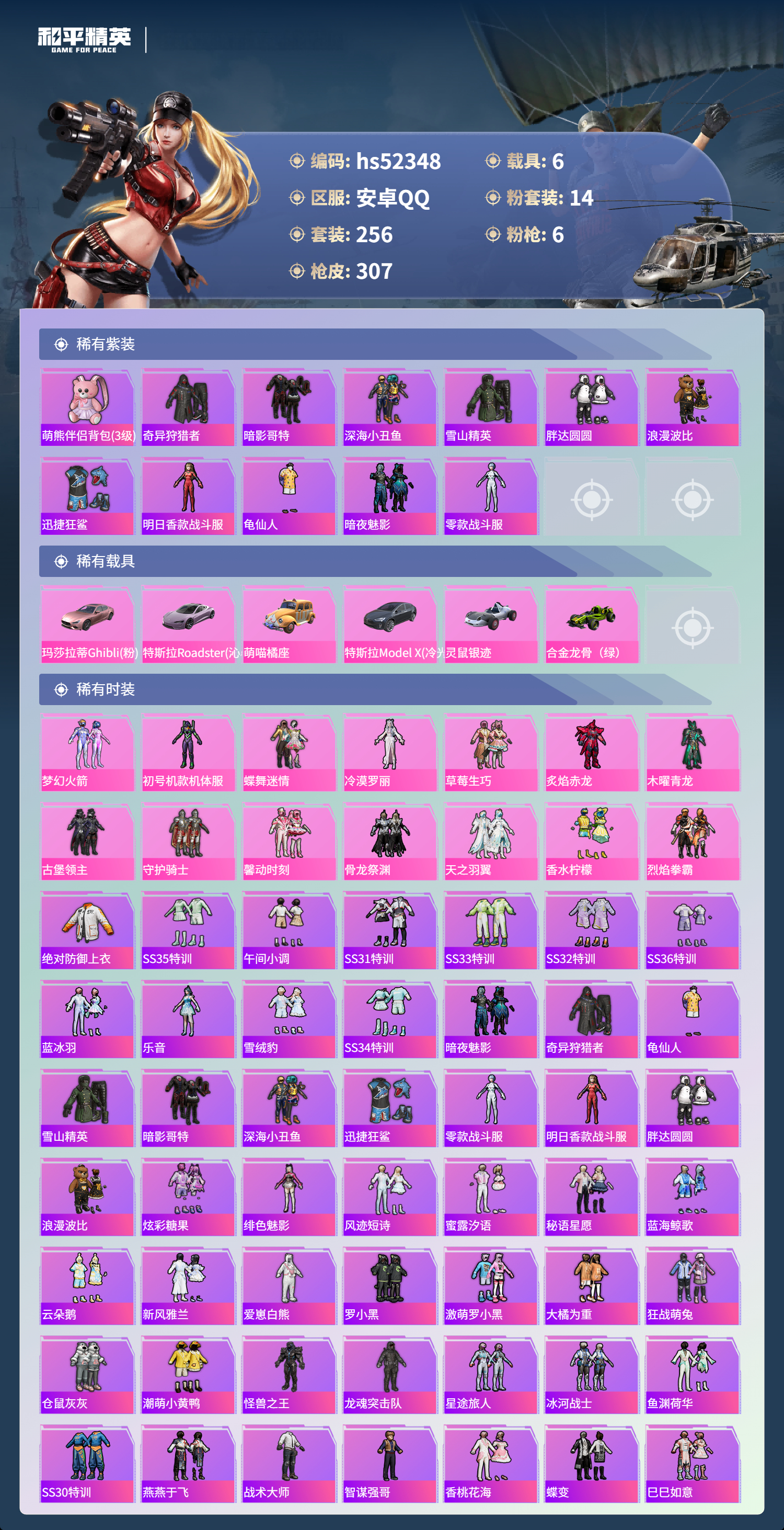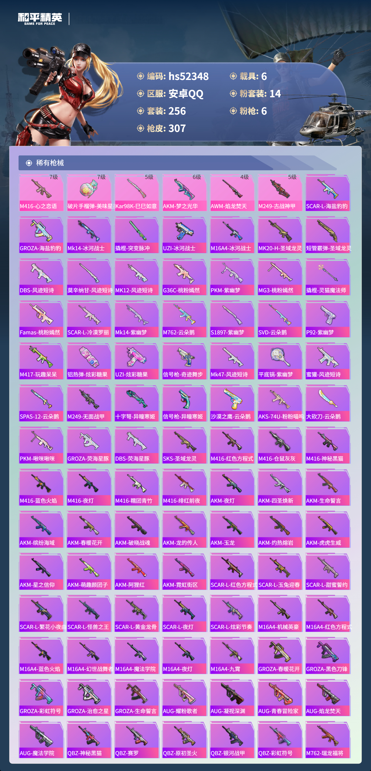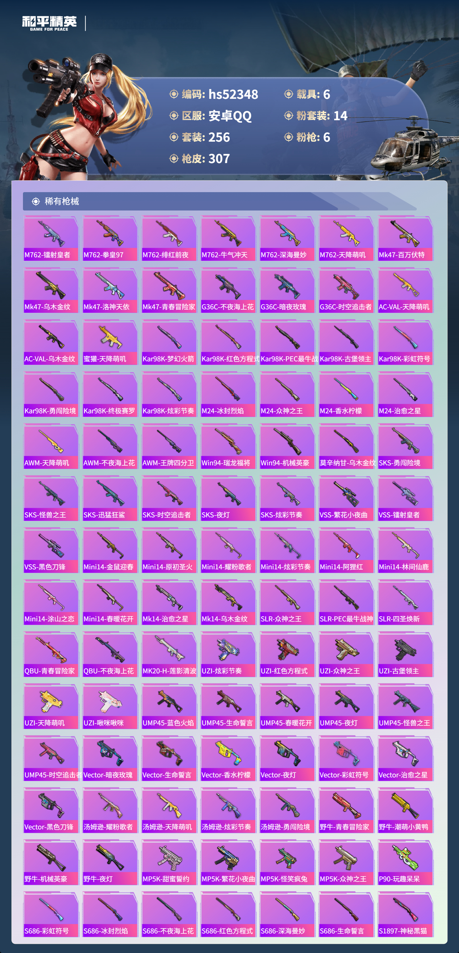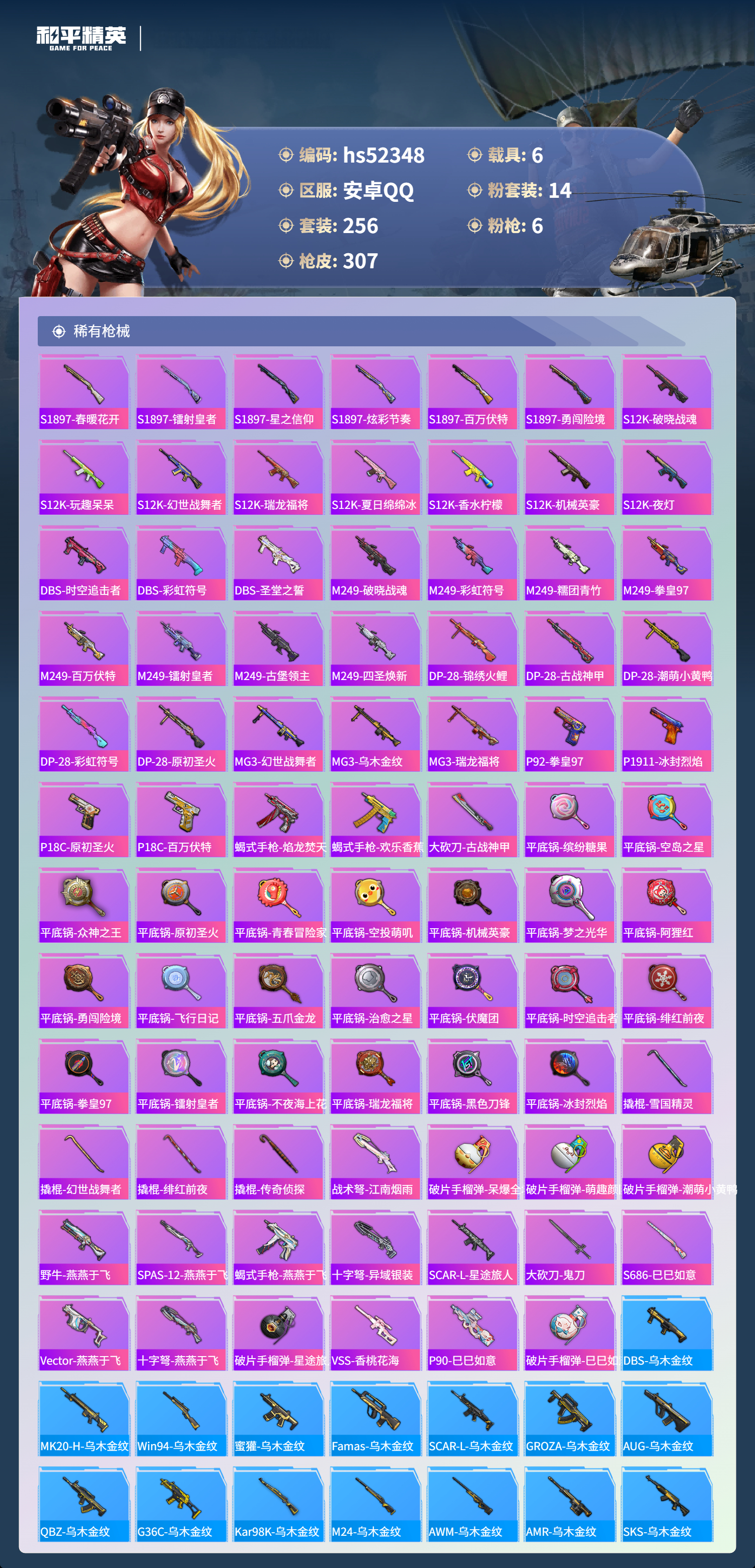 hs52348 安卓手q-27王牌印记-14粉装-6特效呛-6载具-热力值-256套装-307呛皮-5卓越印记【14粉装】套装-木曜青龙套装-馨动时刻套装-天之羽翼套装-烈焰拳霸套装-香水柠檬套装-古堡领主套装-骨龙祭渊角色-冷漠罗丽套装-炙焰赤龙套装-守护骑士套装-蝶舞迷情角色-初号机款机体服套装-草莓生巧套装-梦幻火箭【6特效呛】awm-焰龙焚天/4级