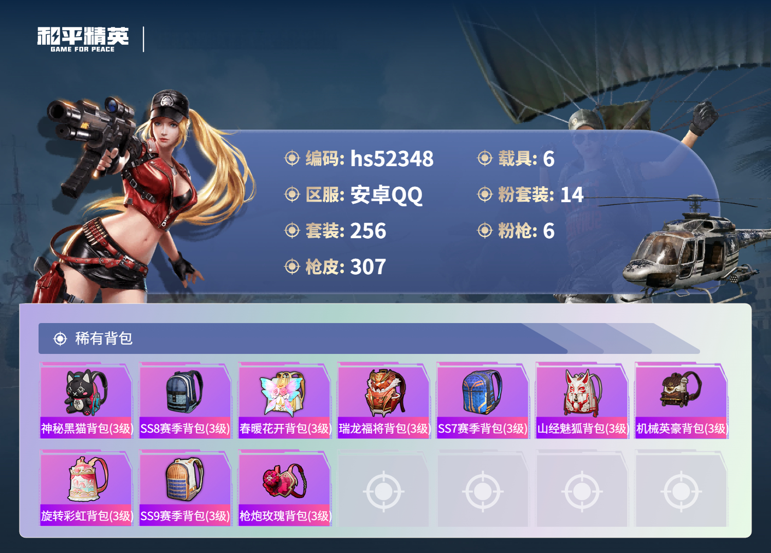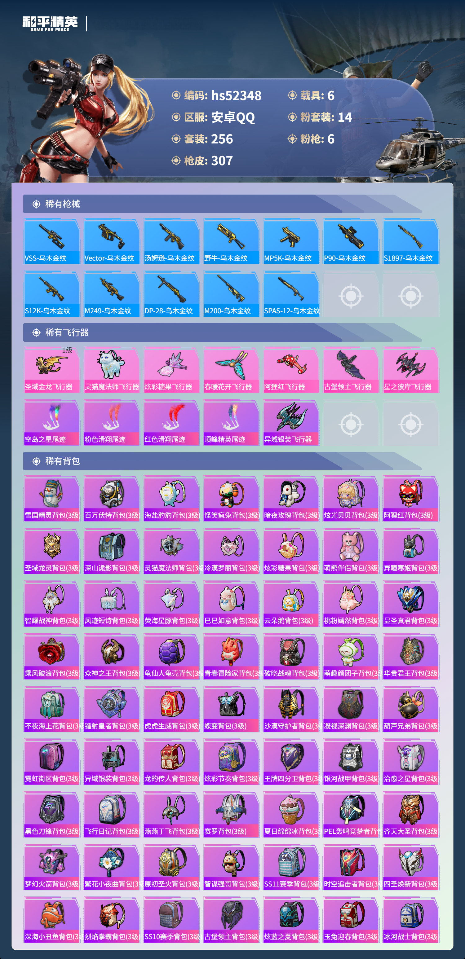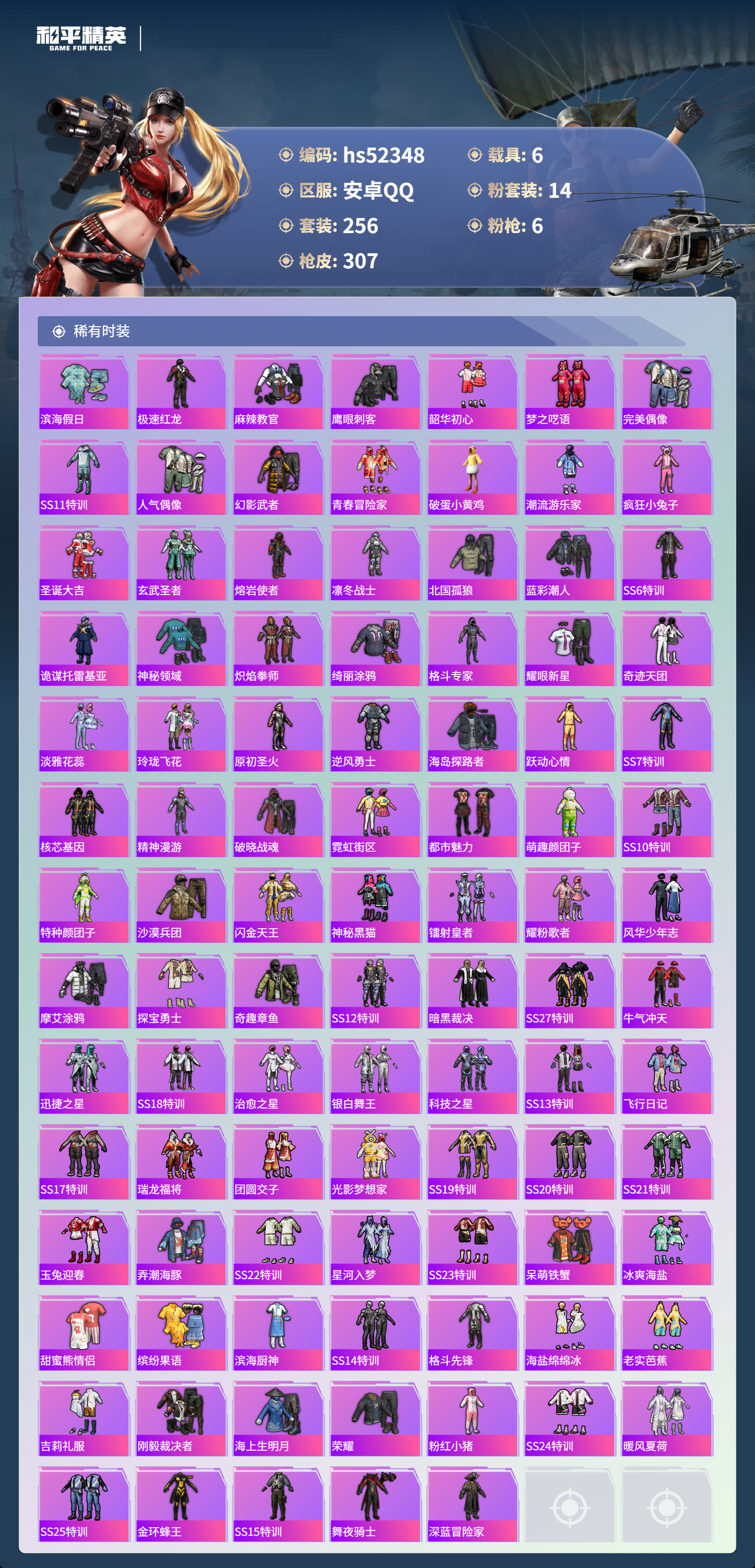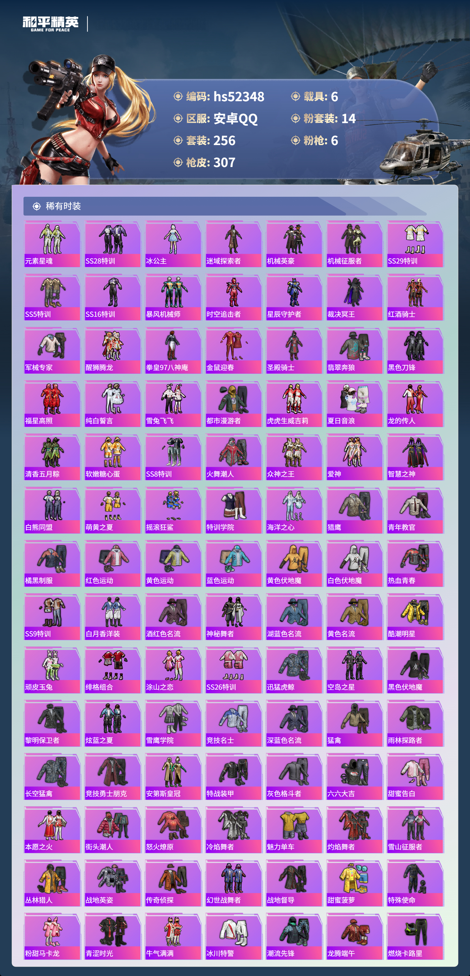 hs52348 安卓手q-27王牌印记-14粉装-6特效呛-6载具-热力值-256套装-307呛皮-5卓越印记【14粉装】套装-木曜青龙套装-馨动时刻套装-天之羽翼套装-烈焰拳霸套装-香水柠檬套装-古堡领主套装-骨龙祭渊角色-冷漠罗丽套装-炙焰赤龙套装-守护骑士套装-蝶舞迷情角色-初号机款机体服套装-草莓生巧套装-梦幻火箭【6特效呛】awm-焰龙焚天/4级