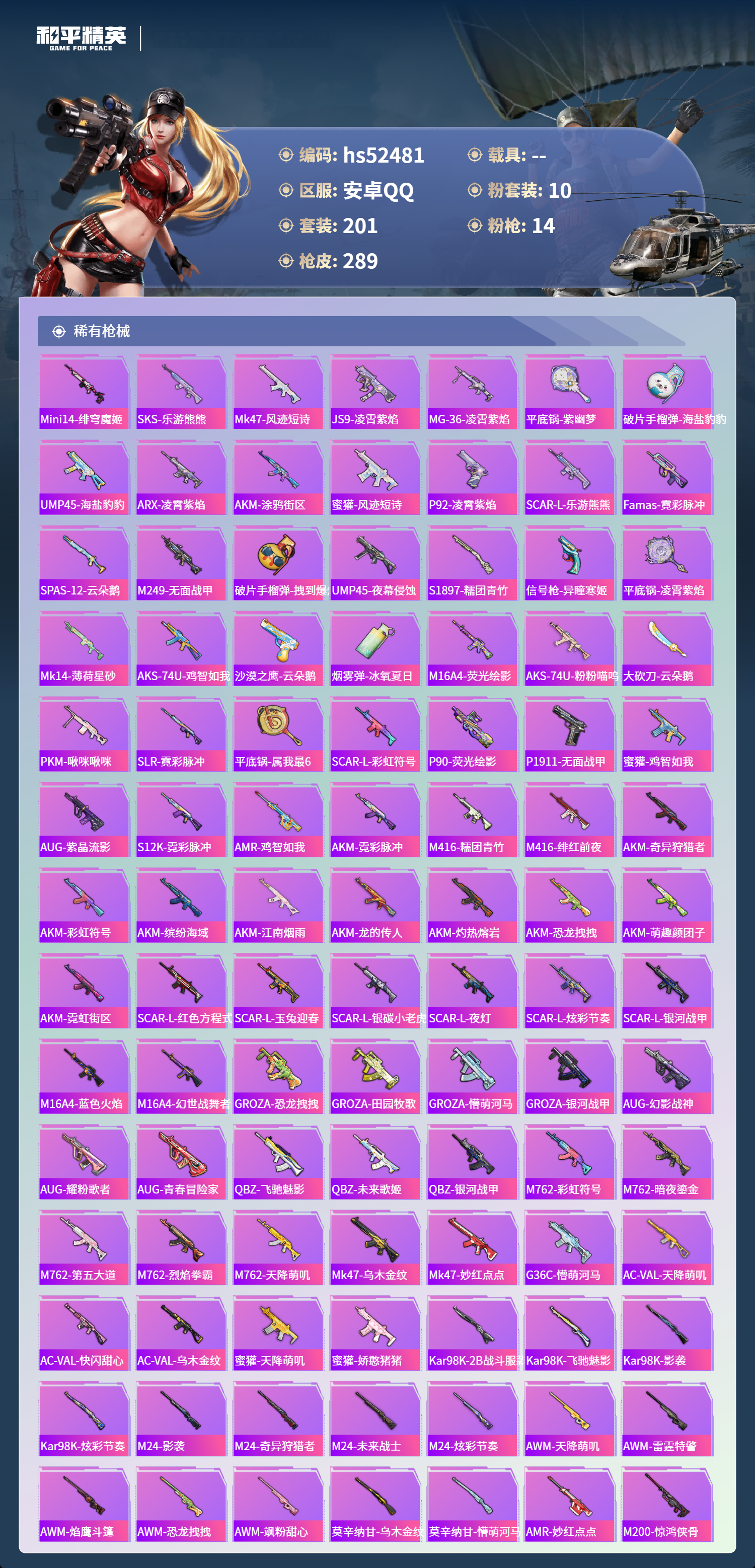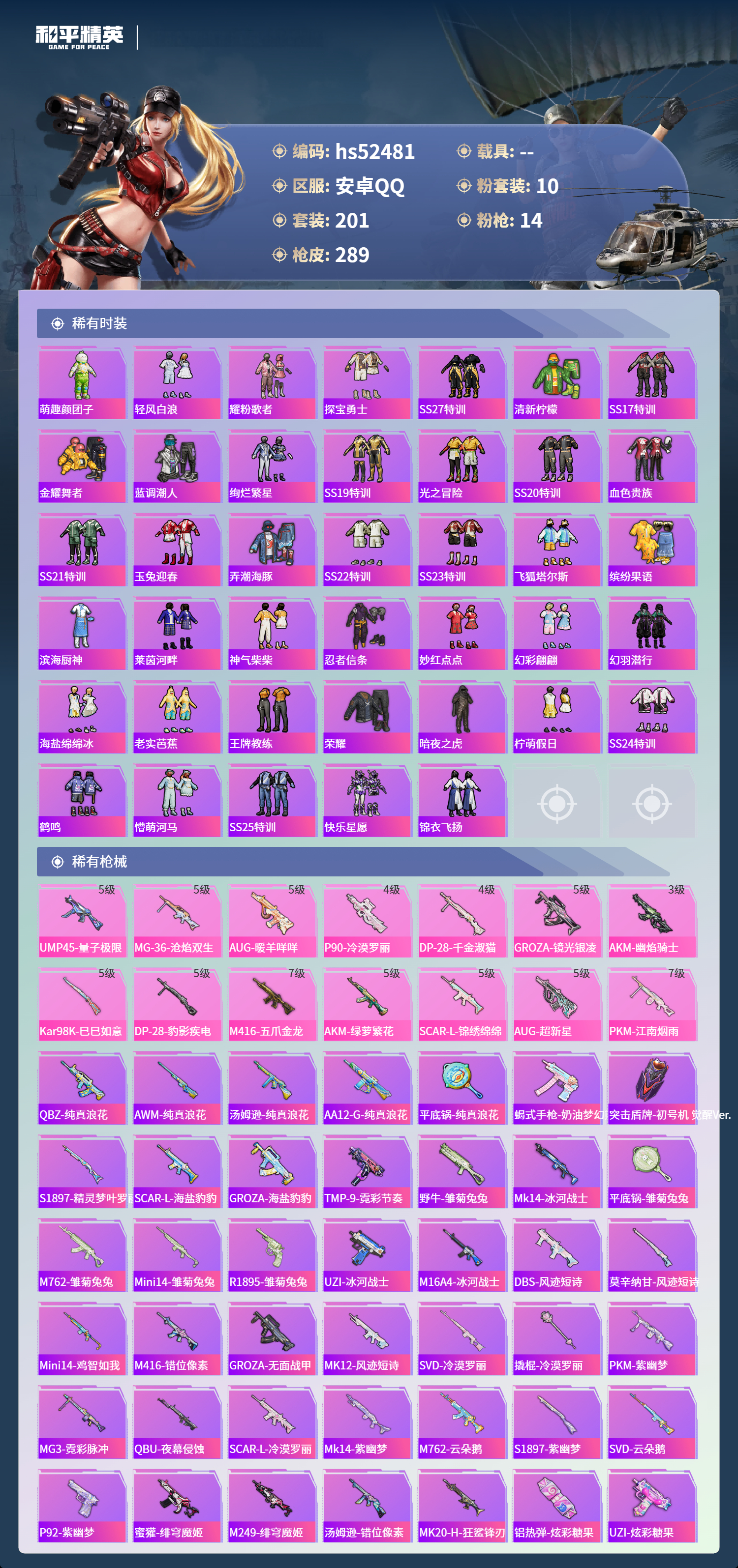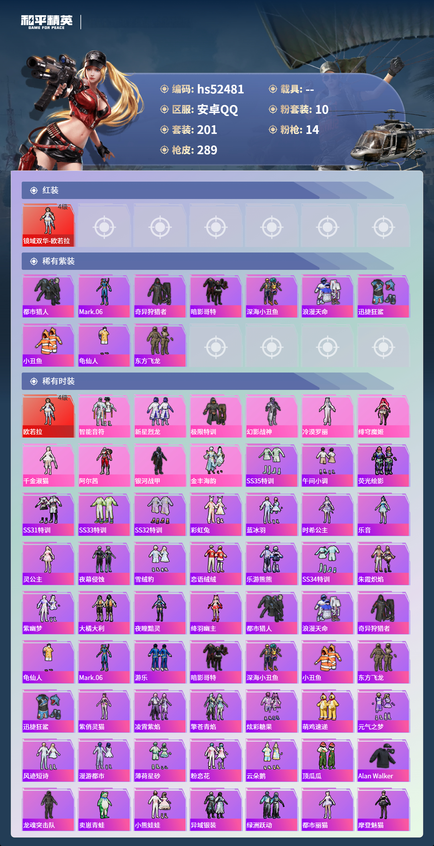 hs52481 安卓手q-17王牌印记-有战神框-1红装-10粉装-14特效呛-97277热力值-201套装-289呛皮-6卓越印记-3传奇印记【1红装】镜域双华-欧若拉/4级【10粉装】套装-金丰海韵套装-极限特训角色-绯穹魔姬角色-千金淑猫套装-幻影战神角色-冷漠罗丽套装-智能音符角色-阿尔茜套装-新星烈龙套装-银河战甲【14特效呛】akm-幽焰骑士/3级m416-五