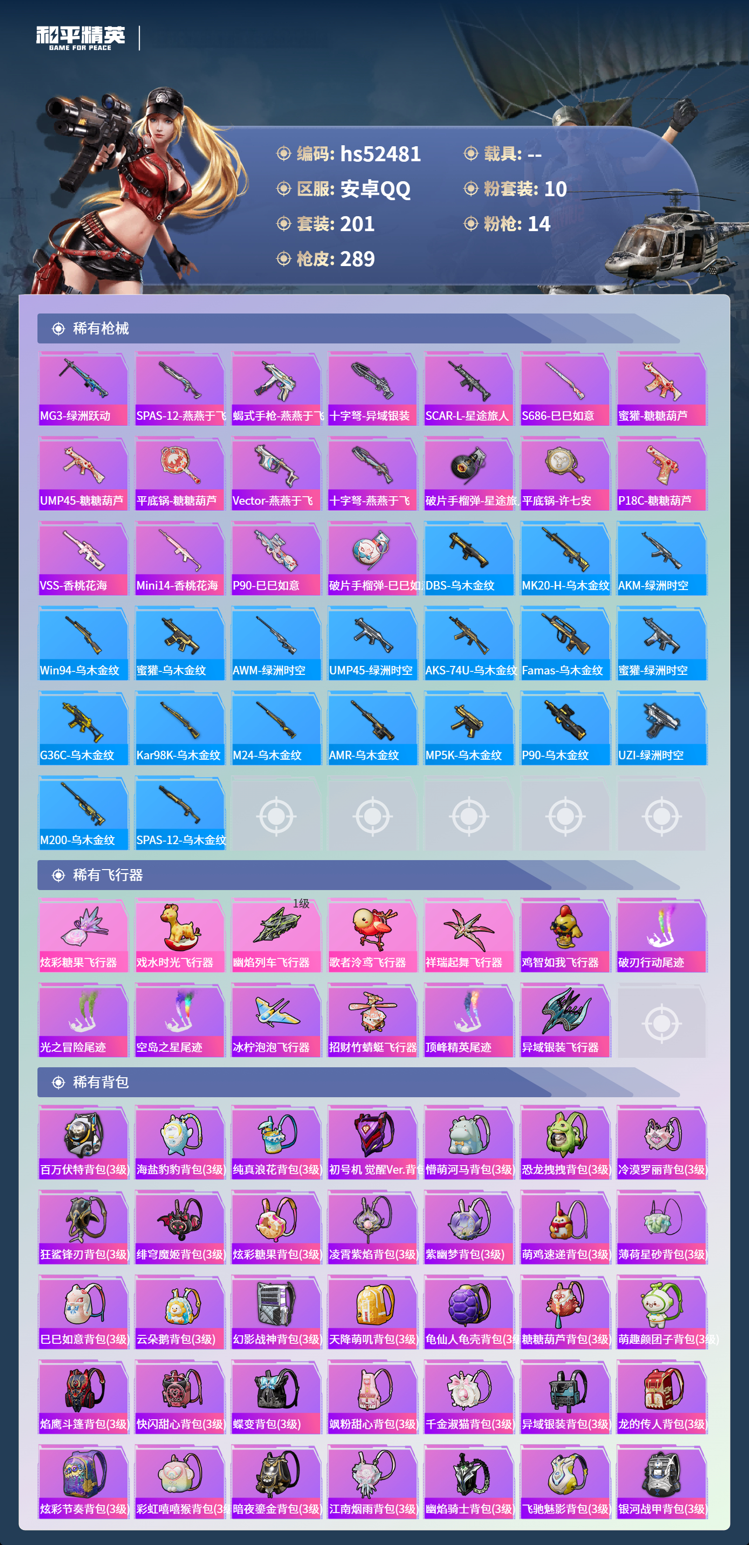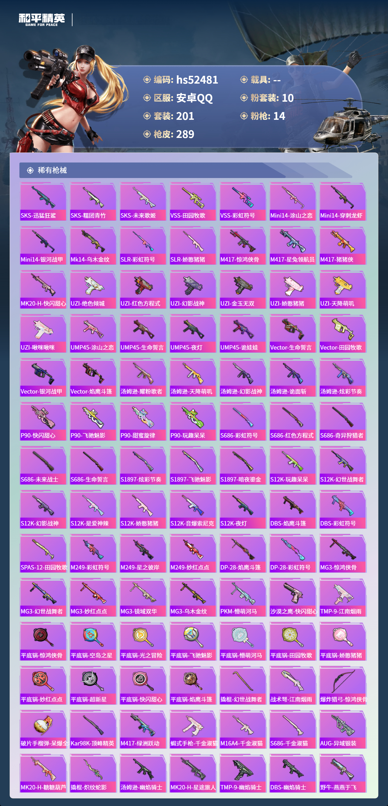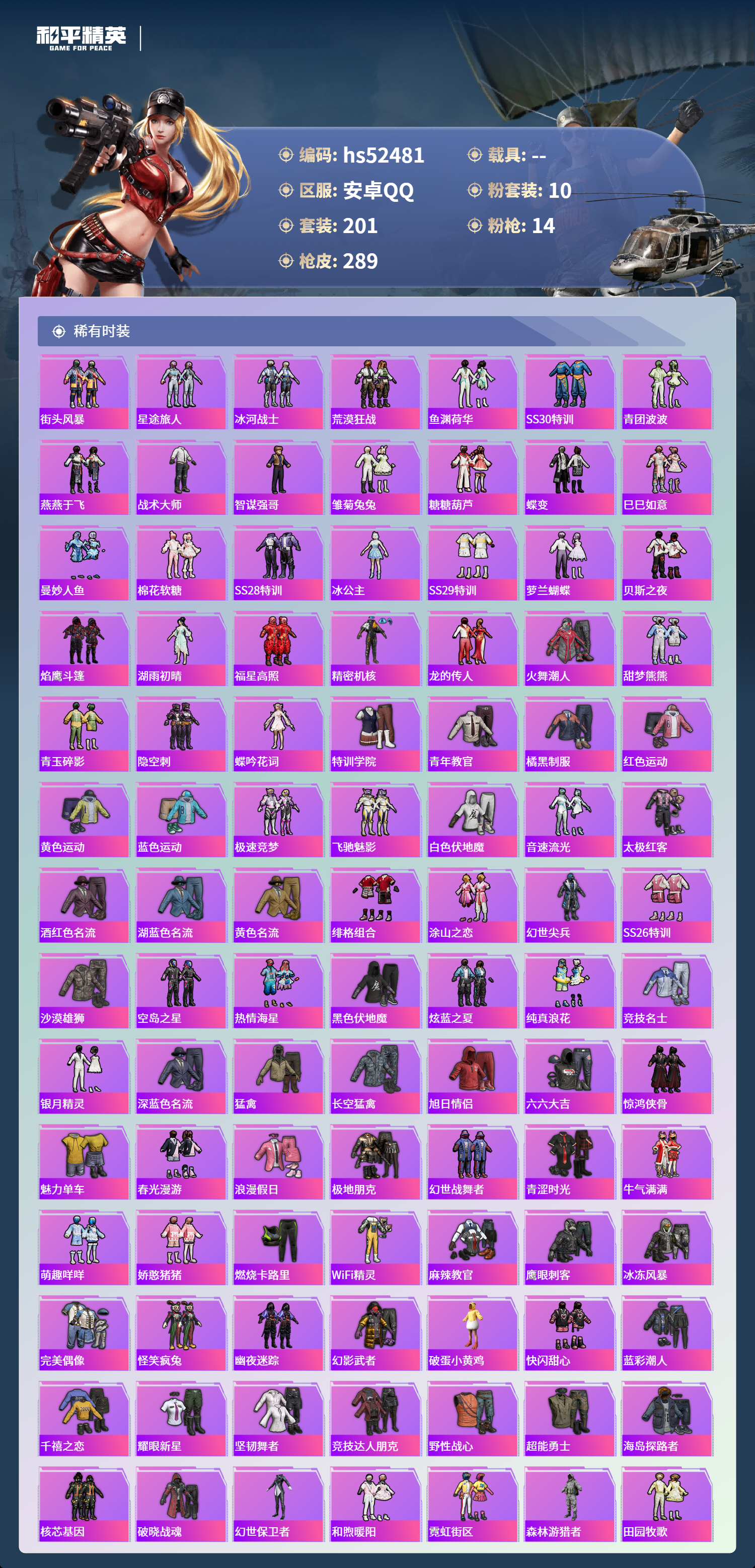 hs52481 安卓手q-17王牌印记-有战神框-1红装-10粉装-14特效呛-97277热力值-201套装-289呛皮-6卓越印记-3传奇印记【1红装】镜域双华-欧若拉/4级【10粉装】套装-金丰海韵套装-极限特训角色-绯穹魔姬角色-千金淑猫套装-幻影战神角色-冷漠罗丽套装-智能音符角色-阿尔茜套装-新星烈龙套装-银河战甲【14特效呛】akm-幽焰骑士/3级m416-五