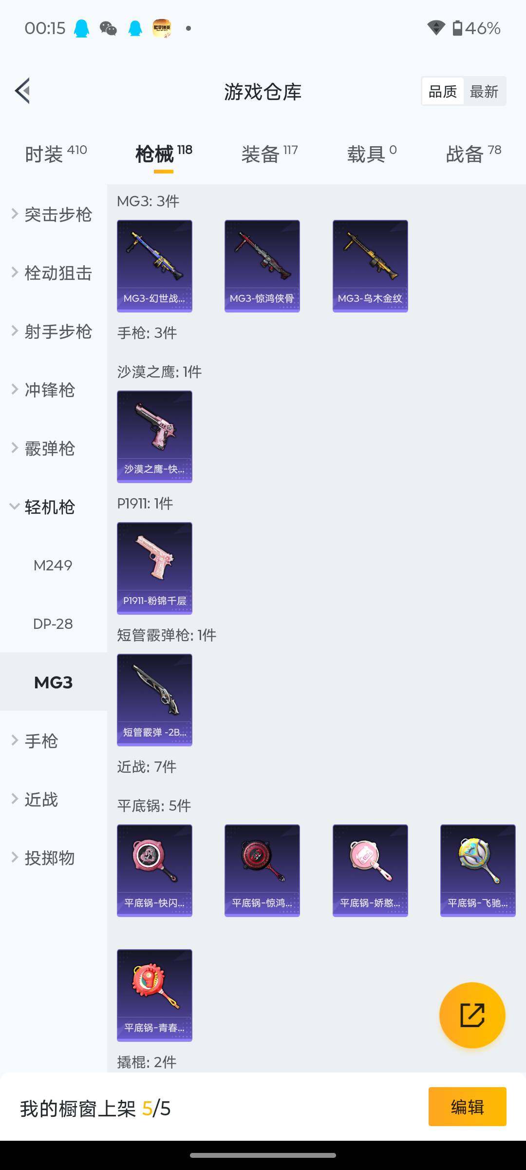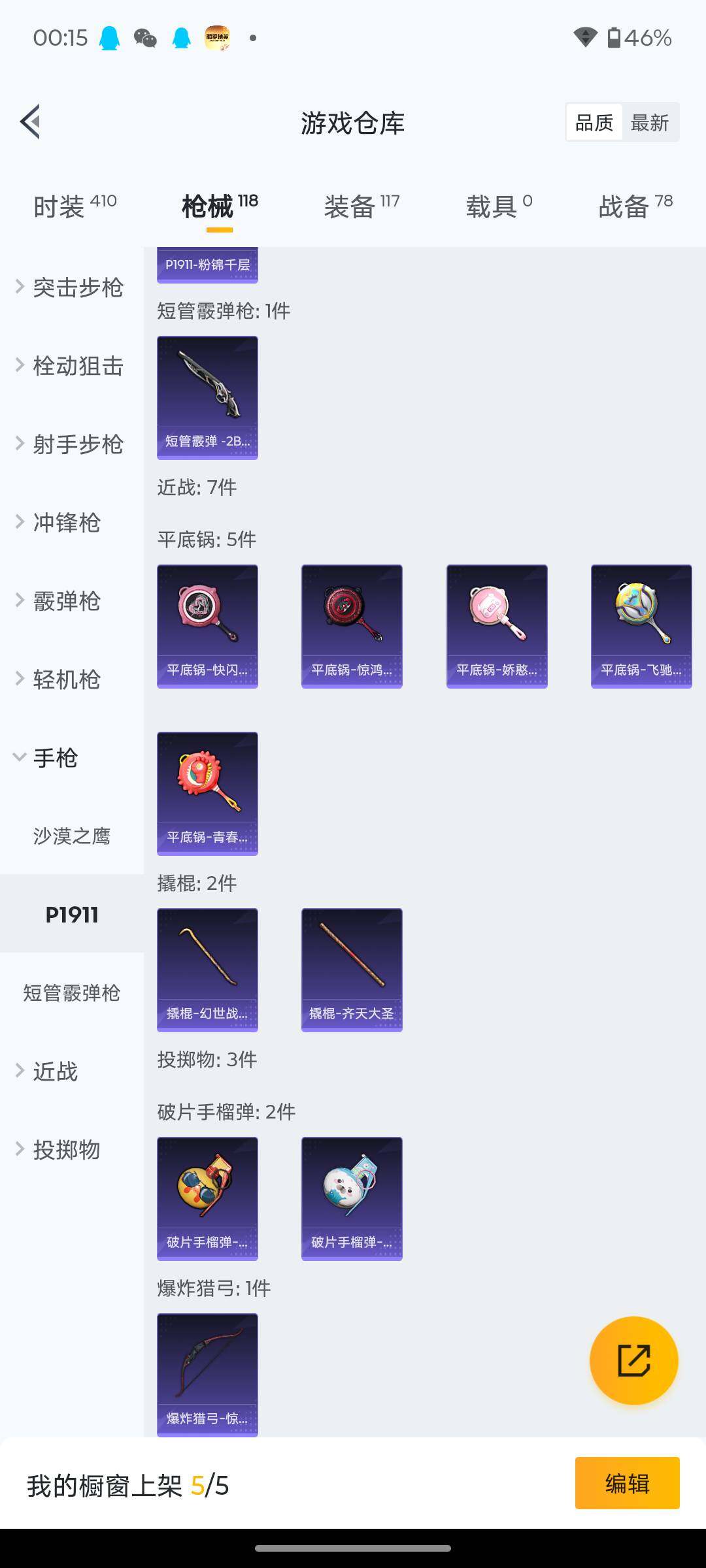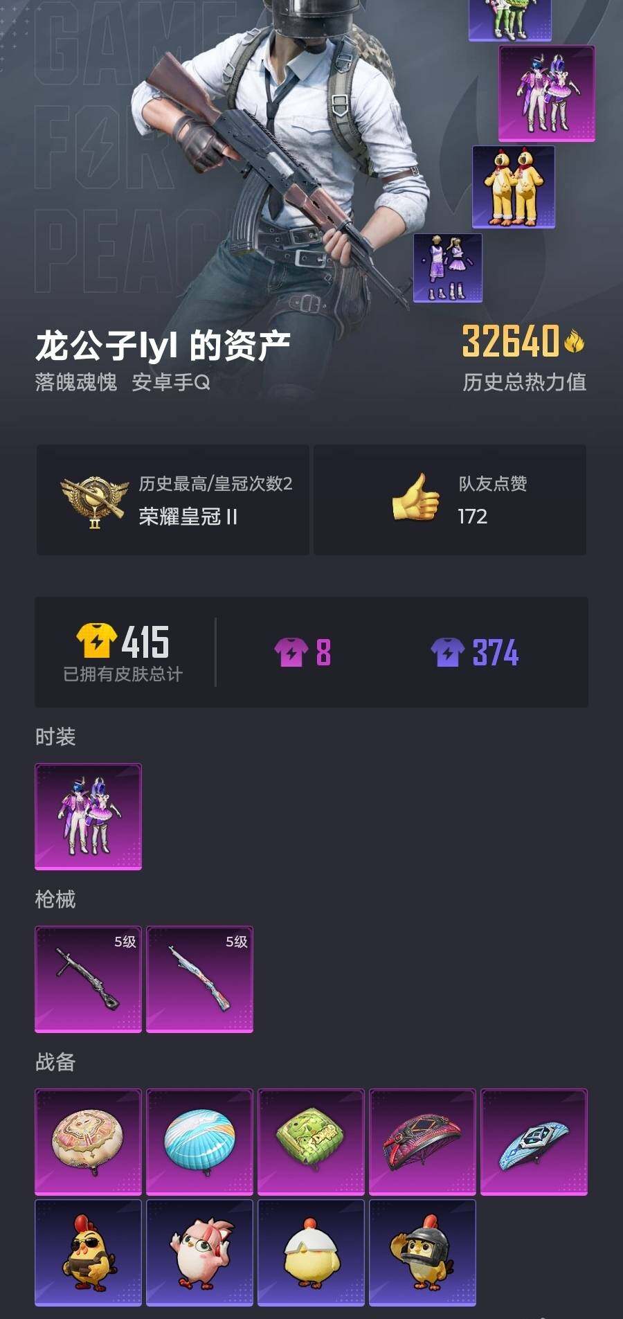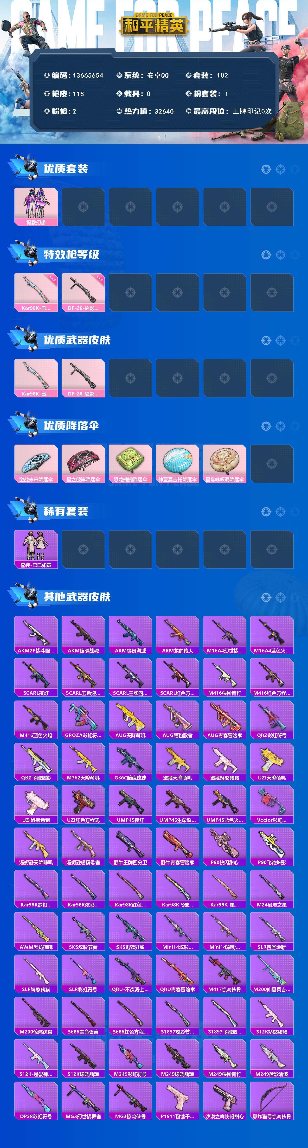 安卓 手q-1粉装-2特效呛-0载具-0粉色飞行器-32640热力值-1王牌印记-102套装-118呛皮 【热门品类】:套装-龟仙人,套装-粉红小猪 【粉色套装】:粉装-极致幻想 【粉色呛皮等级】:kar98k-巳巳如意五级,dp-28-豹影疾电五级 【粉色呛皮】:kar98k-巳巳如意,dp-28-豹影疾电 【粉色降落伞】:激战未来降落伞,星之彼岸降落伞,恐龙拽拽降落伞,仲夏莫吉托降