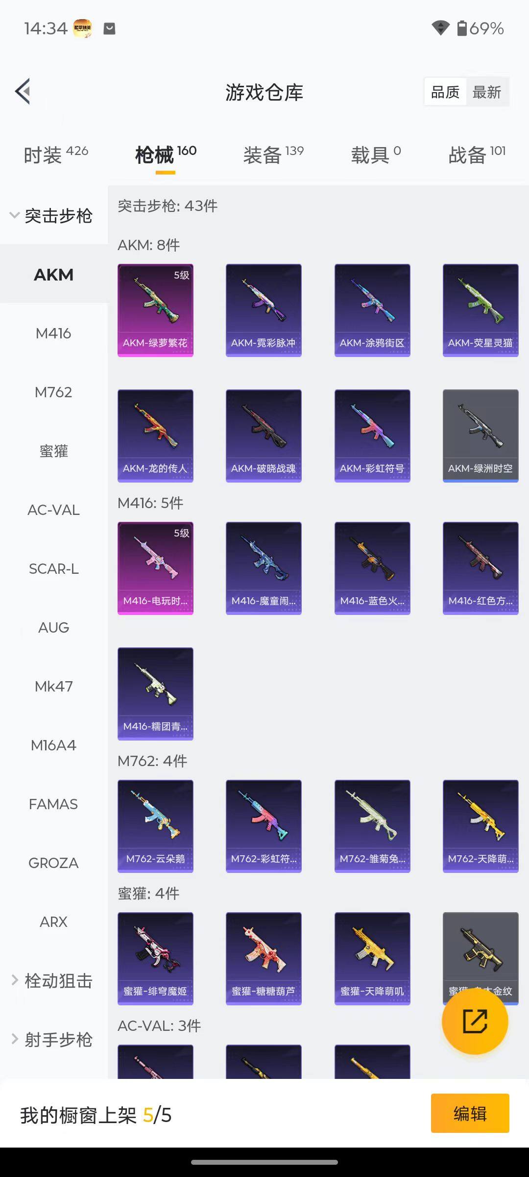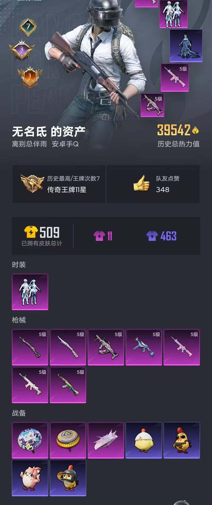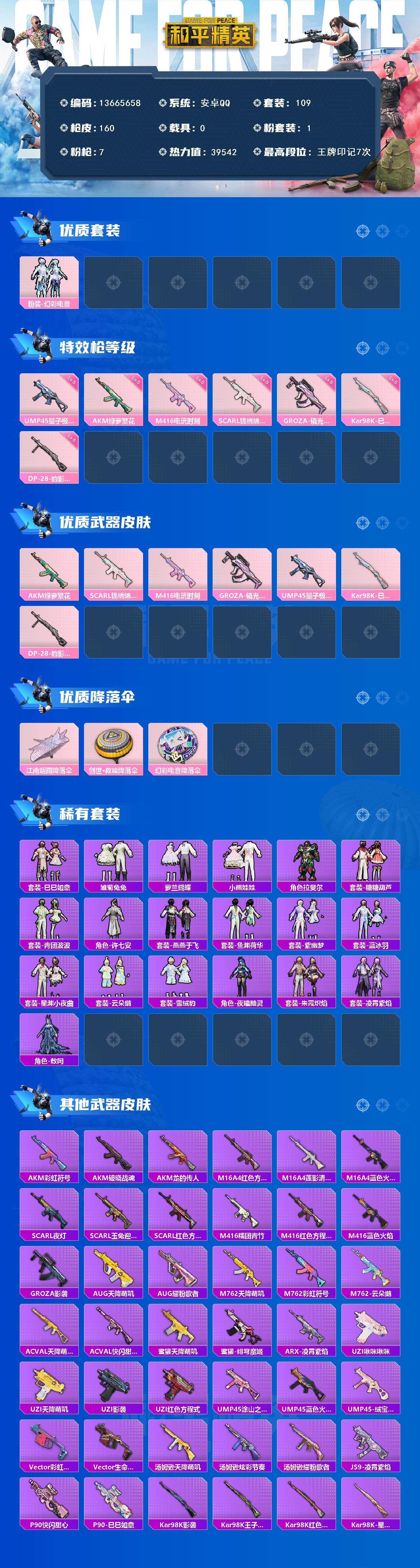 6083-1粉装-7特效呛-0载具-0粉色飞行器-39542热力值-7王牌印记-109套装-160呛皮 【热门品类】:套装-龟仙人 【粉色套装】:粉装-幻彩电音 【粉色呛皮等级】:akm-绿萝繁花五级,scar-l-锦绣绵绵五级,m416-电玩时刻五级,groza-镜光银凌五级,