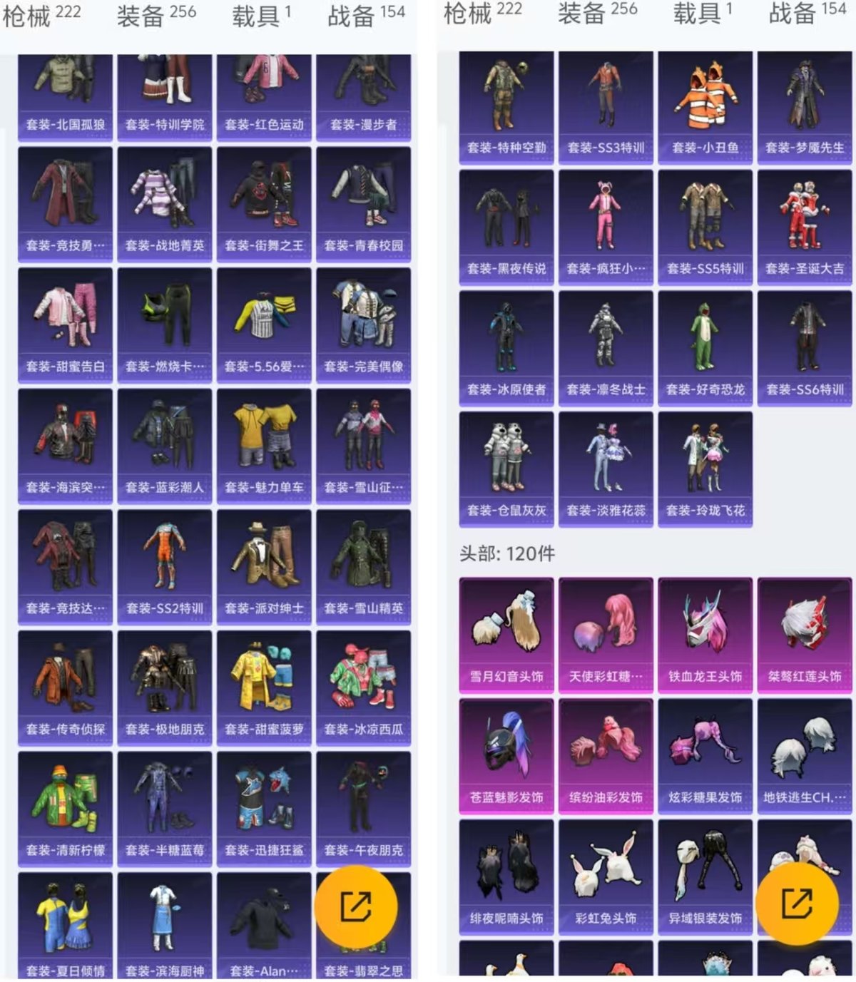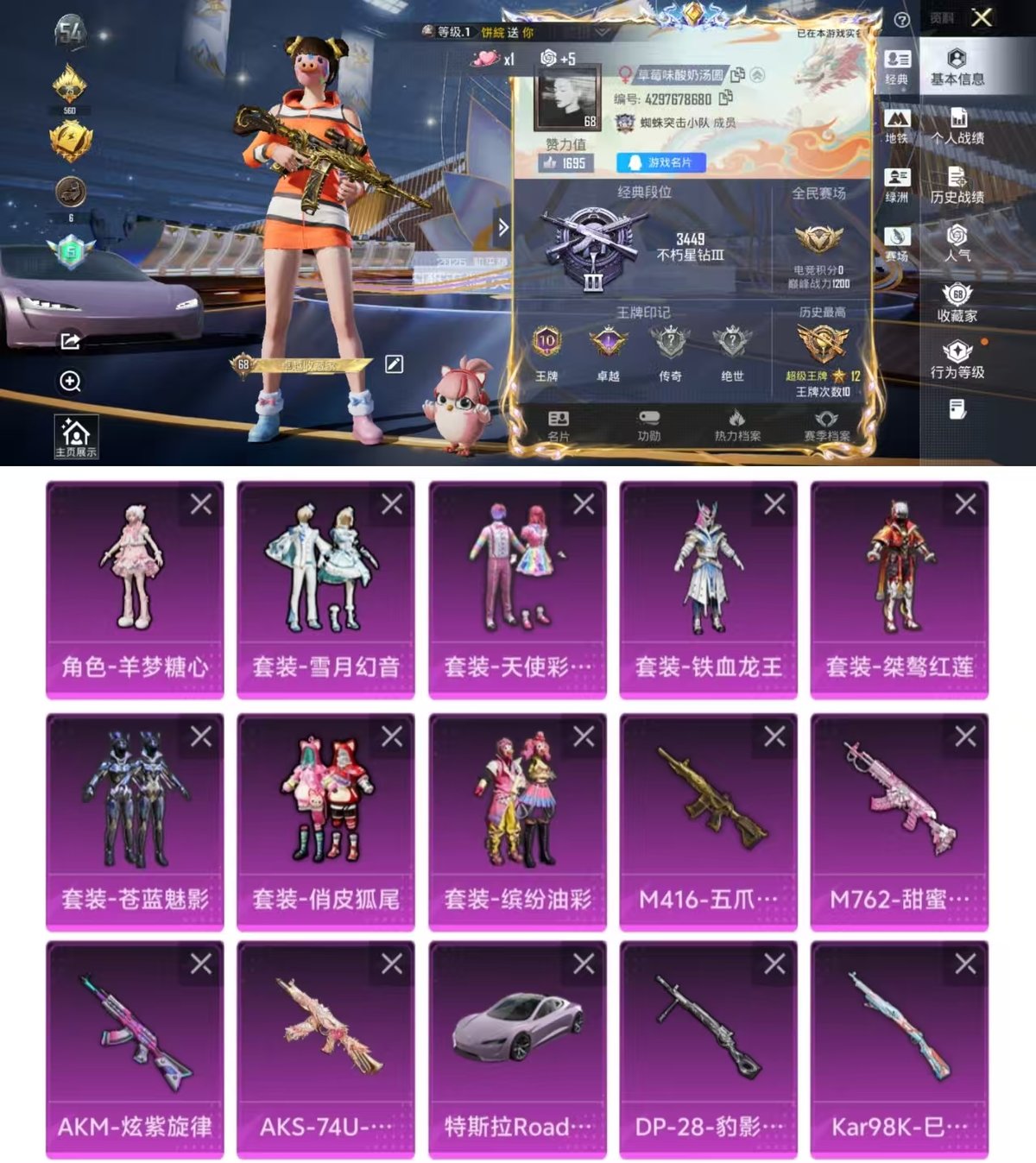 _2298810-实名:可修改时装数:687载具数:1呛械数:222战备数:154热门装扮:浪漫波比天使彩虹糖梦魇先生迅捷狂鲨缤纷油彩好奇恐龙苍蓝魅影俏皮狐尾铁血龙王桀骜红莲仓鼠灰灰大橘为重罗小黑神秘黑猫雪月幻音羊梦糖心载具:特斯拉roadster沁心粉稀有呛皮:m762甜蜜誓约akm炫紫旋律m416五爪金龙kar98k-巳巳如意aks-74u-星穹咏叹调dp-28-豹影疾电