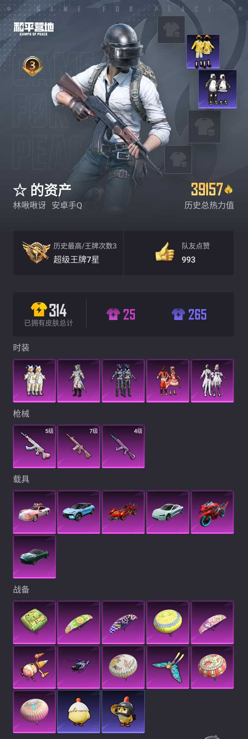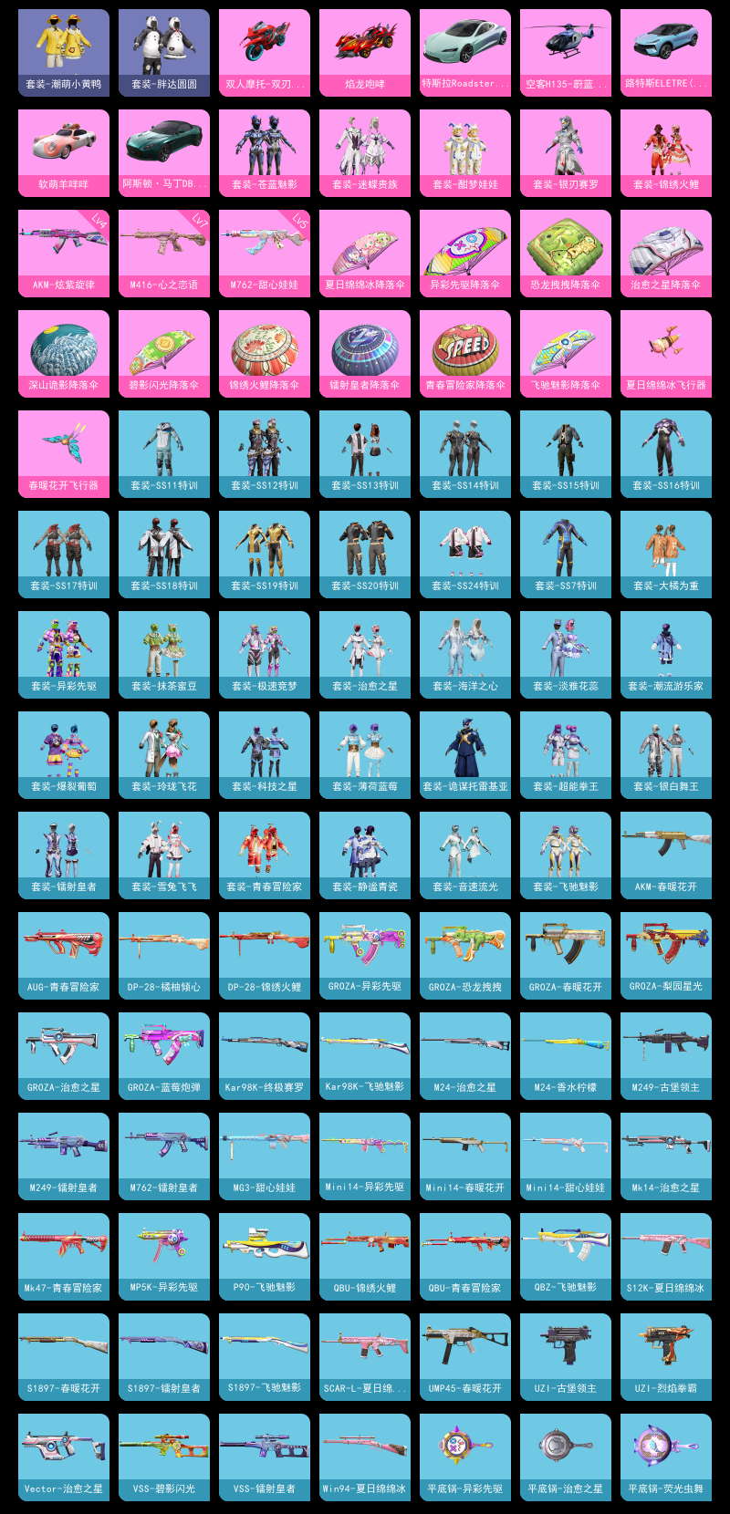 【和平精英】【lyhp17672】5粉装3特效呛7载具含1飞机 银刃赛罗 小黄鸭胖达圆圆 满级m4心之恋语 特斯拉 5粉装,3特效呛,6载具,历史最高段位:超级王牌7星 王牌印记3次 热力值:39157,60套装,77呛械,106装备,50战备;套装:套装-迷蝶贵族,套装-银刃赛罗,套装-锦绣火鲤,套装-苍蓝魅影,套装-酣梦娃娃,套装-猎鹰,套装-骑行爱好者,套装-竞技名士,套装-猛禽,套装-长空猛禽,套装-蓝色守护者,套装-特战装甲,套装-灰色格斗者,套装-神秘领域,套装-魅力单车,套装-绮丽涂鸦,套装-丛林猎人,套装-雪山精英,套装-胖达圆圆,套装-海上生明月,套装-军械专家,套装-淡雅花蕊,套装-玲珑飞花,套装-ss7特训,套装-霓虹街区,套装-潮萌小黄鸭,套装-大橘为重,套装-超能拳王,套装-海洋之心,套装-抹茶蜜豆,套装-薄荷蓝莓,套装-ss11特训,套装-青春冒险家,套装-潮流游乐家,套装-诡谋托雷基亚,套装-静谧青瓷,套装-ss12特训,套装-ss18特训,套装-镭射皇者,套装-银白舞王,套装-治愈之星,套装-科技之星,套装-飞行日记,套装-ss13特训,套装-ss14特训,套装-ss15特训,套装-ss16特训,套装-ss17特训,套装-爆裂葡萄,套装-雪兔飞飞,套装-异彩先驱,套装-霓虹极客,套装-空投萌叽,套装-ss19特训,套装-极速竞梦,套装-飞驰魅影,套装-音速流光,套装-炫蓝之夏,套装-ss20特训,套装-ss24特训;呛皮:groza-春暖花开,groza-梨园星光,groza-治愈之星,groza-彩虹符号,groza-蓝莓炮弹,groza-异彩先驱,groza-恐龙拽拽,mk47-青春冒险家,mk47-乌木金纹,4级akm-炫紫旋律,akm-春暖花开,akm-霓虹街区,akm-彩虹符号,7级m416-心之恋语,m416-红色方程式,5级m762-甜心娃娃,m762-镭射皇者,scar-l-夏日绵绵冰,scar-l-炫彩节奏,q-彩虹符号,q-飞驰魅影,g36c-乌木金纹,m16a4-红色方程式,aug-青春冒险家,ac-val-乌木金纹,kar98k-终极赛罗,kar98k-彩虹符号,kar98k-飞驰魅影,kar98k-乌木金纹,awm-乌木金纹,win94-夏日绵绵冰,m24-治愈之星,m24-香水柠檬,m24-乌木金纹,qbu-锦绣火鲤,qbu-青春冒险家,mk14-治愈之星,mk14-乌木金纹,vss-镭射皇者,vss-碧影闪光,mini14-金鼠迎春,mini14-春暖花开,mini14-异彩先驱,mini14-甜心娃娃,sks-心之恋语,汤姆逊-异彩先驱,汤姆逊-乌木金纹,ump45-生命誓言,ump45-春暖花开,uzi-古堡领主,uzi-烈焰拳霸,vect-生命誓言,vect-彩虹符号,vect-治愈之星,p90-飞驰魅影,野牛-青春冒险家,野牛-乌木金纹,mp5k-异彩先驱,s12k-夏日绵绵冰,s12k-乌木金纹,s1897-春暖花开,s1897-镭射皇者,s1897-飞驰魅影,s1897-乌木金纹,mg3-甜心娃娃,dp-28-锦绣火鲤,dp-28-橘柚倾心,m249-古堡领主,m249-镭射皇者,m249-乌木金纹,平底锅-缤纷糖果,平底锅-镭射皇者,平底锅-荧光虫舞,平底锅-治愈之星,平底锅-青春冒险家,平底锅-异彩先驱,平底锅-飞驰魅影;载具:软萌羊咩咩,路特斯eletre冰川蓝,阿斯顿·马丁dbs绿,特斯拉roadster水滴蓝,焰龙咆哮,双人摩托-双刃魅影红;降落伞:春暖花开飞行器,夏日绵绵冰飞行器;滑翔尾迹:空客h135-蔚蓝之翼; 详情看图