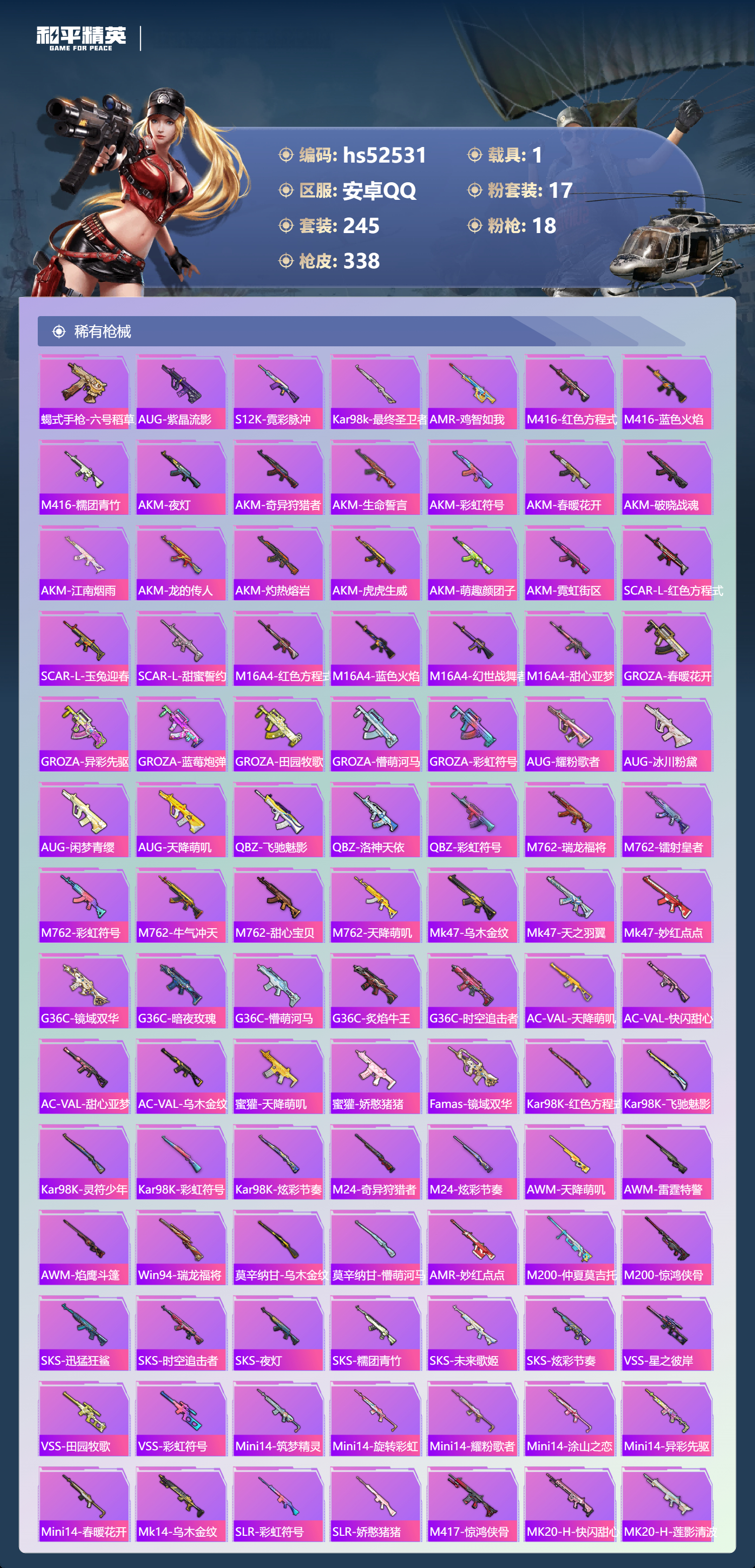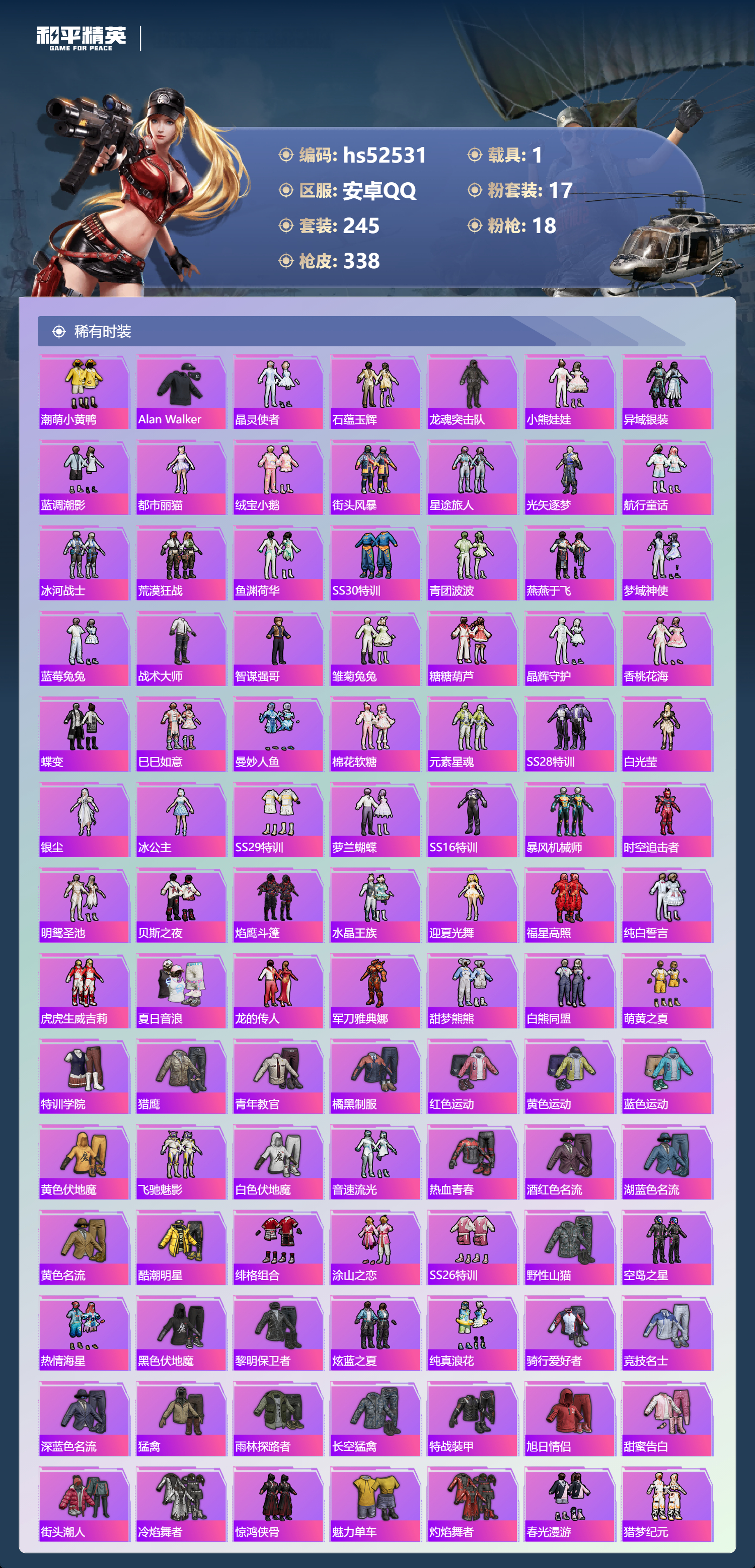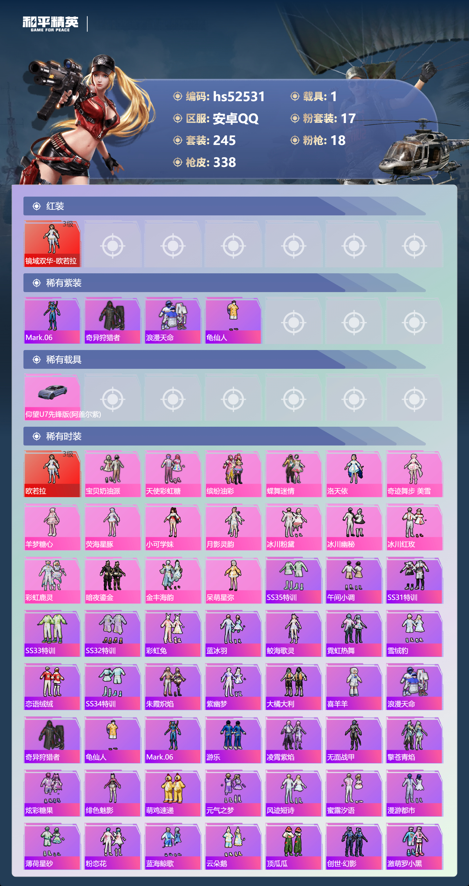 hs52531 安卓手q-19王牌印记-有战神框-1红装-17粉装-18特效呛-1载具-热力值-245套装-338呛皮-5卓越印记-4传奇印记【1红装】镜域双华-欧若拉/3级【17粉装】套装-天使彩虹糖角色-洛天依套装-冰川幽秘角色-羊梦糖心套装-彩虹鹿灵套装-蝶舞迷情套装-暗夜鎏金套装-冰川粉黛套装-金丰海韵套装-宝贝奶油派角色-荧海星豚角色-奇迹舞步 美雪
