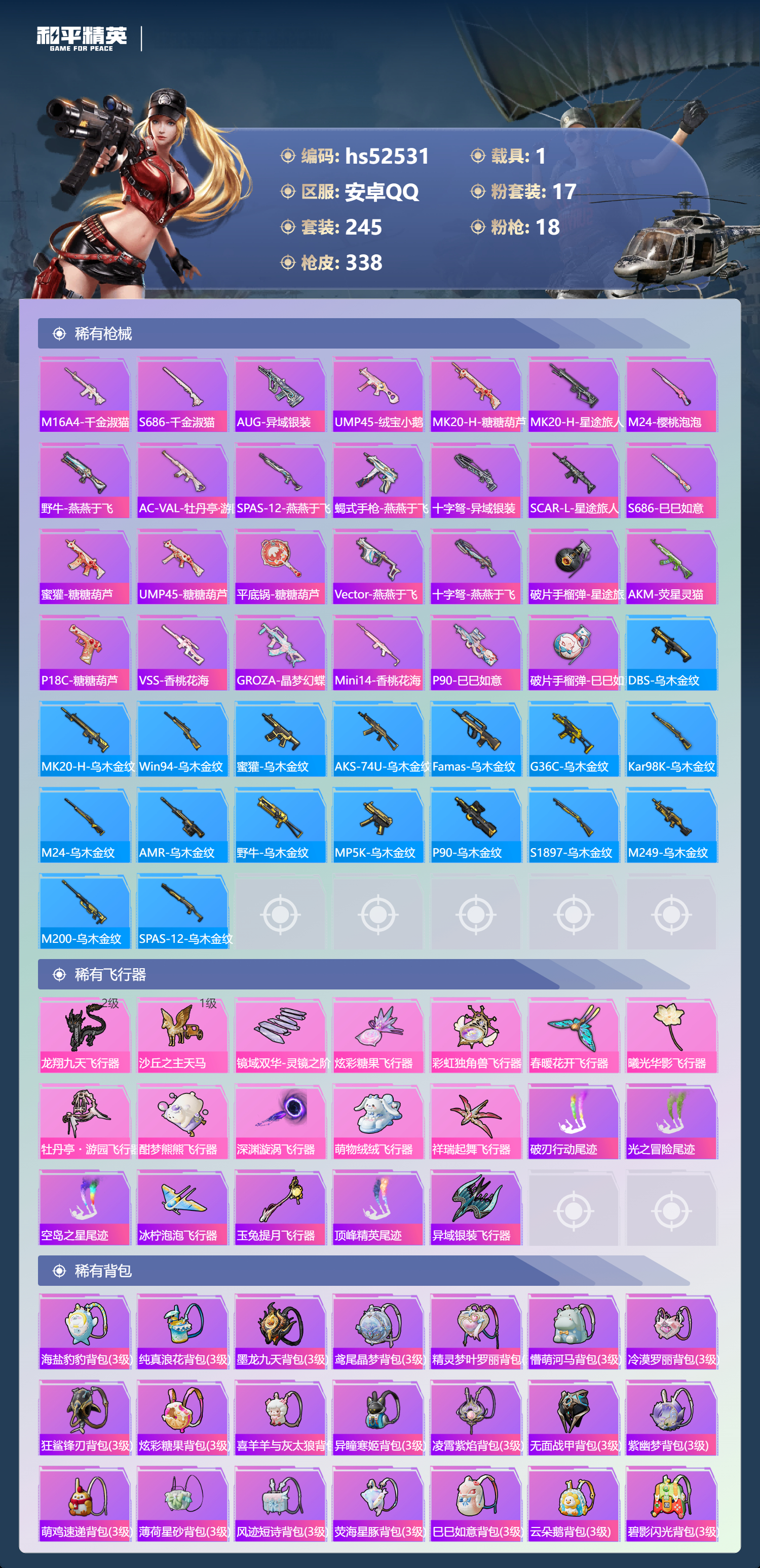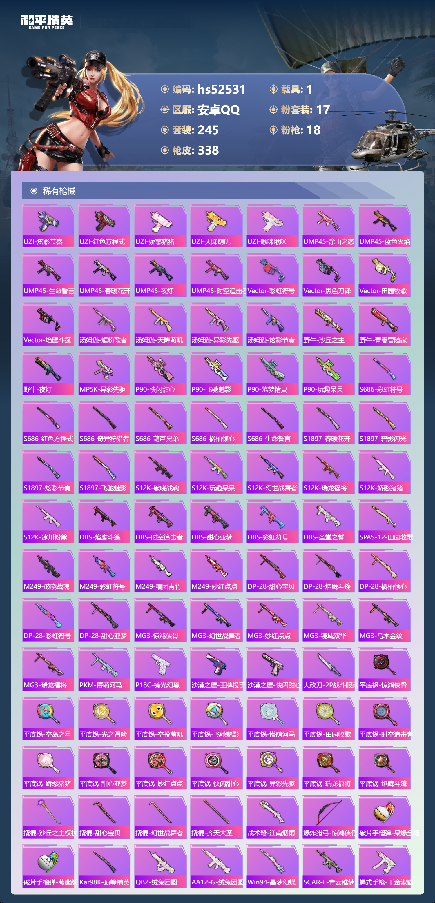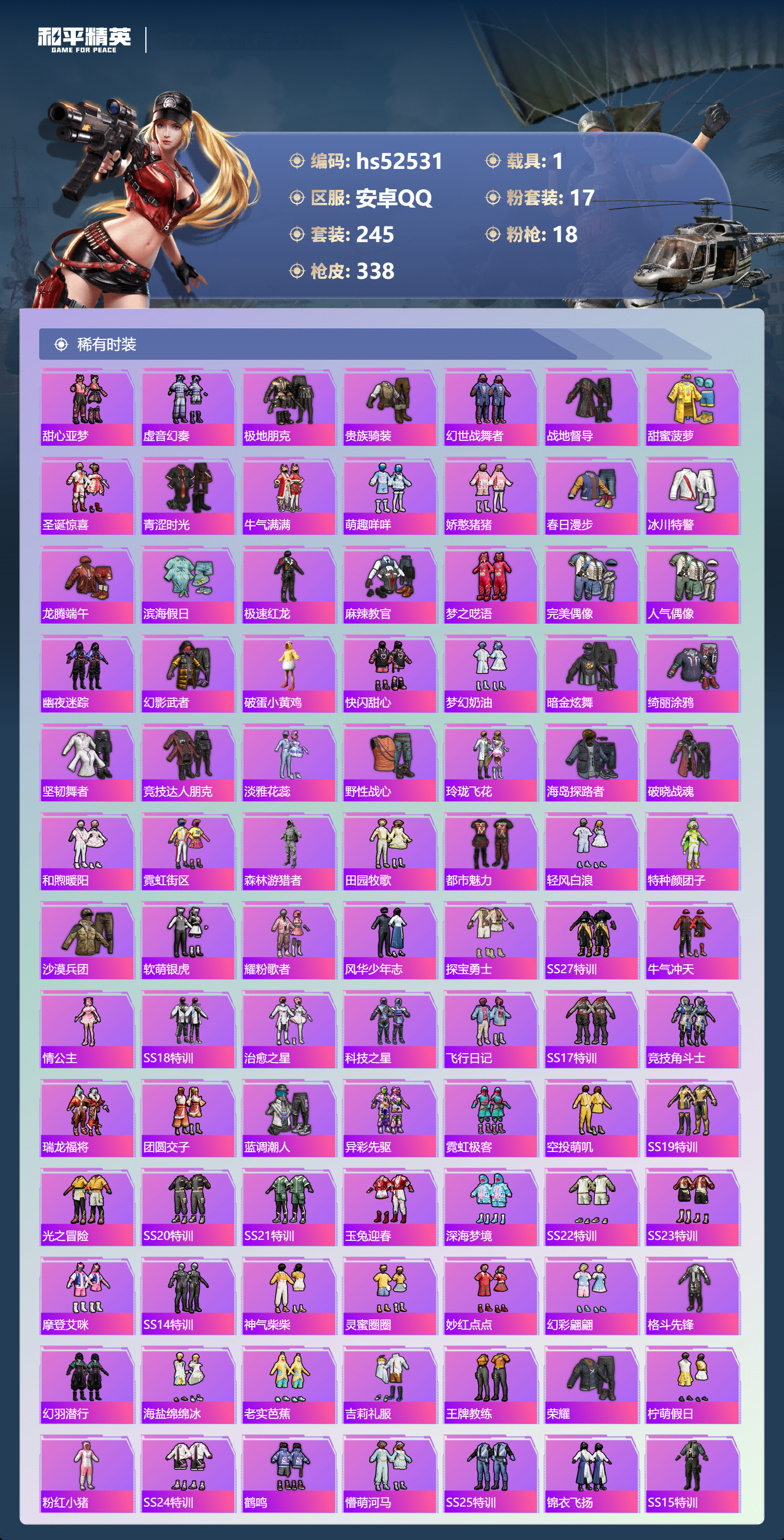 hs52531 安卓手q-19王牌印记-有战神框-1红装-17粉装-18特效呛-1载具-热力值-245套装-338呛皮-5卓越印记-4传奇印记【1红装】镜域双华-欧若拉/3级【17粉装】套装-天使彩虹糖角色-洛天依套装-冰川幽秘角色-羊梦糖心套装-彩虹鹿灵套装-蝶舞迷情套装-暗夜鎏金套装-冰川粉黛套装-金丰海韵套装-宝贝奶油派角色-荧海星豚角色-奇迹舞步 美雪