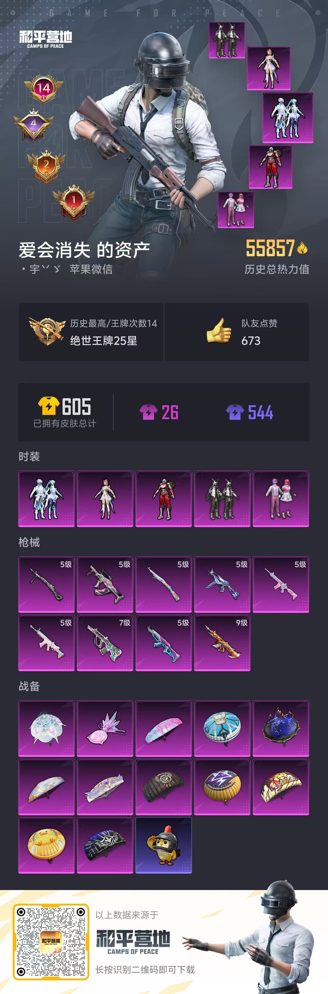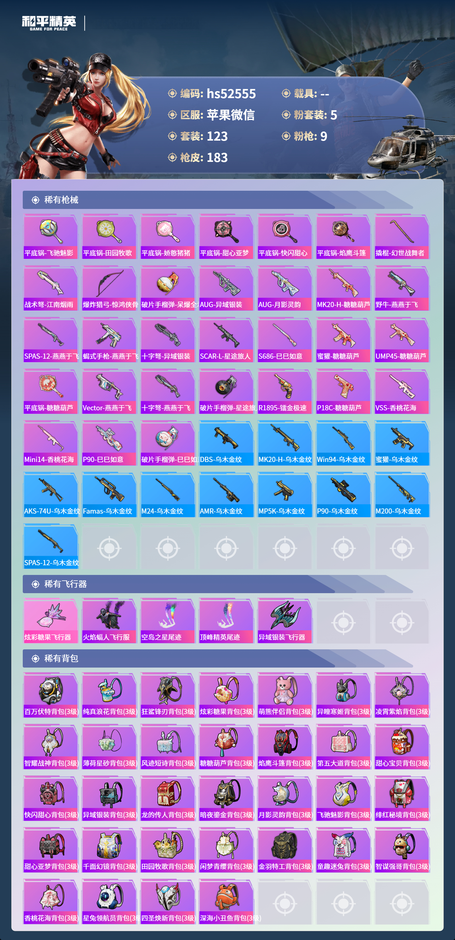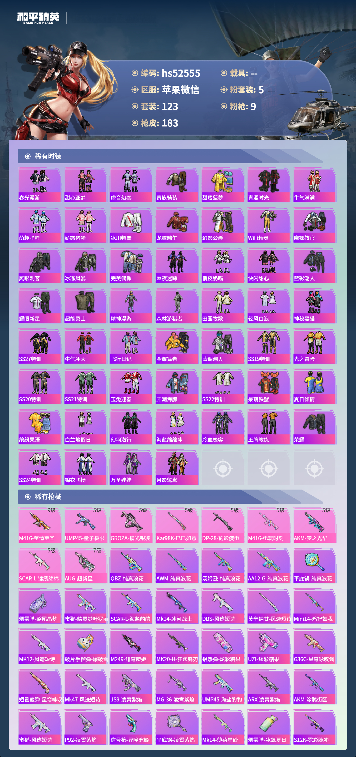 hs52555 苹果微信-14王牌印记-5粉装-9特效呛-55857热力值-123套装-183呛皮-4卓越印记-2传奇印记【5粉装】套装-幻彩电音角色-阿尔茜角色-圣堂之誓套装-数码大师套装-天使彩虹糖【9特效呛】scar-l-锦绣绵绵/5级m416-至情至圣/9级groza-镜光银凌/5级ump45-量子极限/5级dp-28-豹影疾电/5级m416-电玩时刻/5级aug-