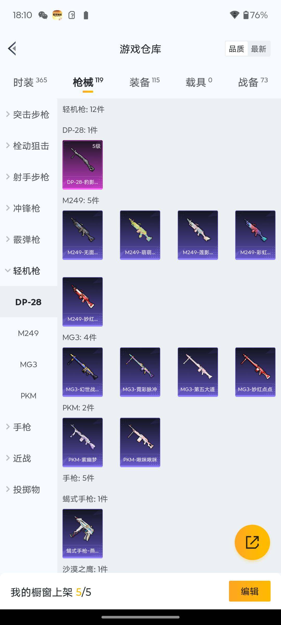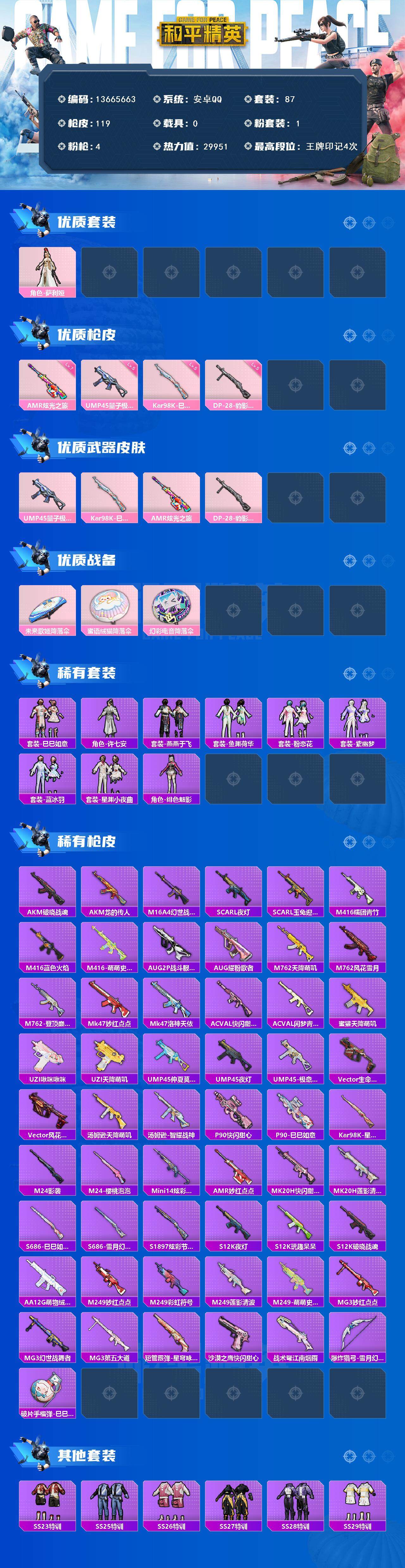6088-1粉装-4特效呛-1粉色飞行器-29951热力值-4王牌印记-87套装-119呛皮 【热门品类】:套装-龟仙人 【粉色套装】:角色-萨利娅 【粉色呛皮等级】:ump45-量子极限五级,kar98k-巳巳如意五级,amr-炫光之旅七级,dp-28-豹影疾电五级 【粉色呛皮】:ump45-量子极限,kar98k-巳巳如意,amr-炫光之旅,dp-28-豹影疾电 【粉色