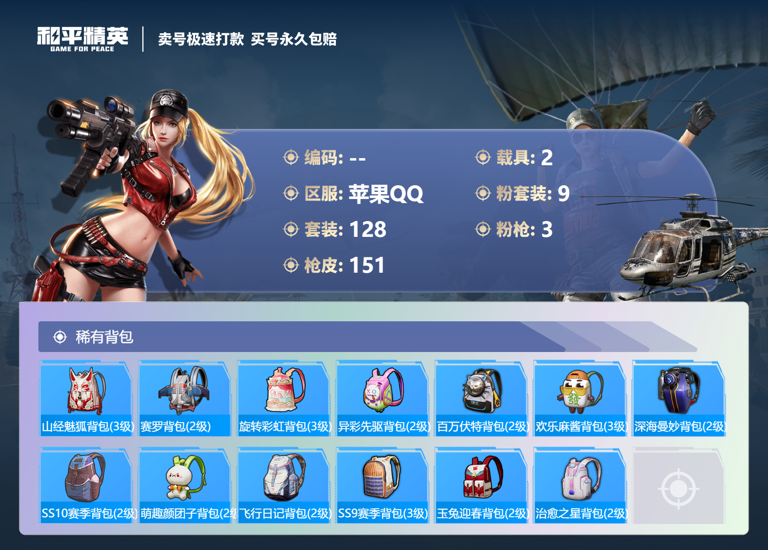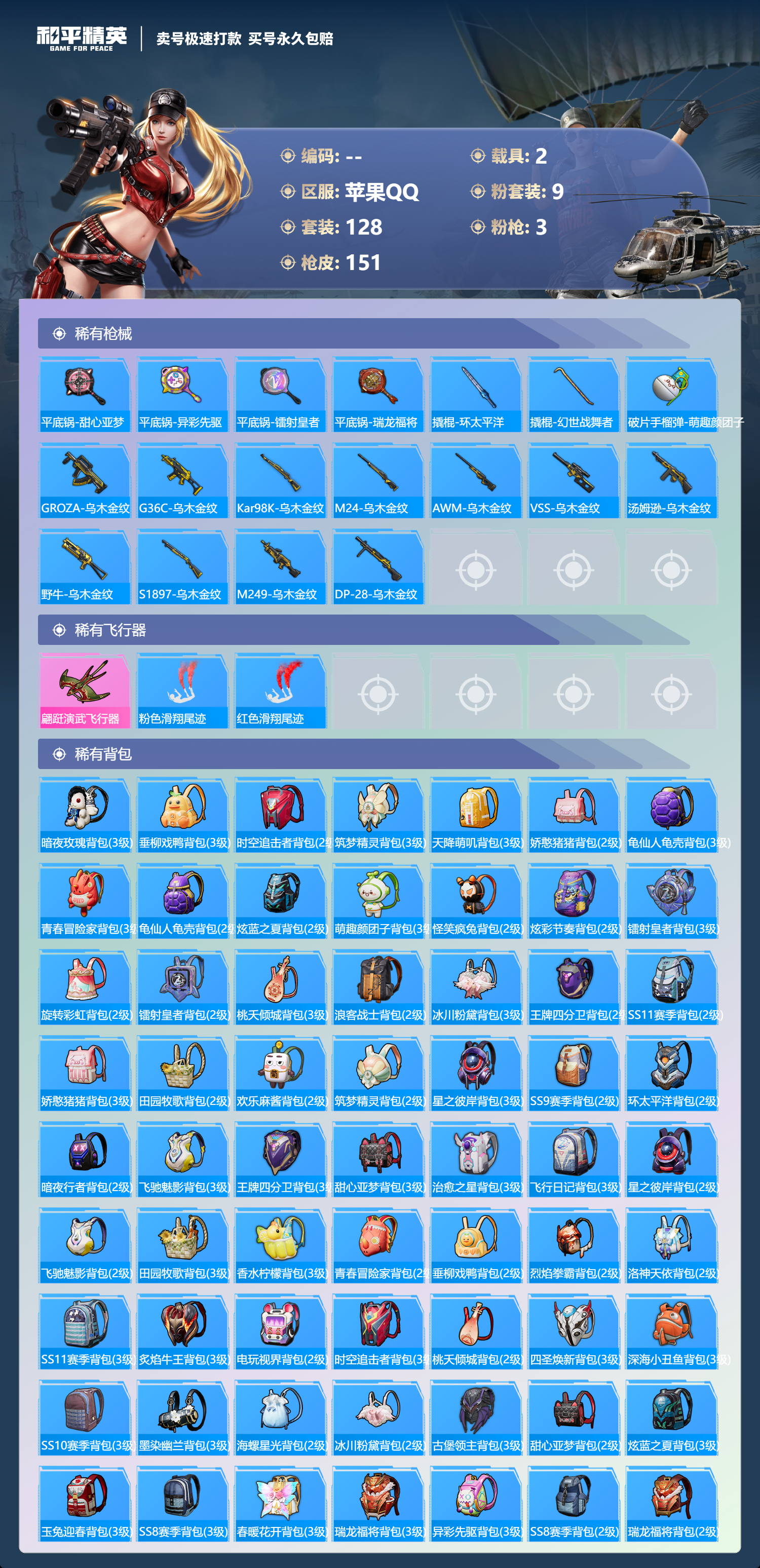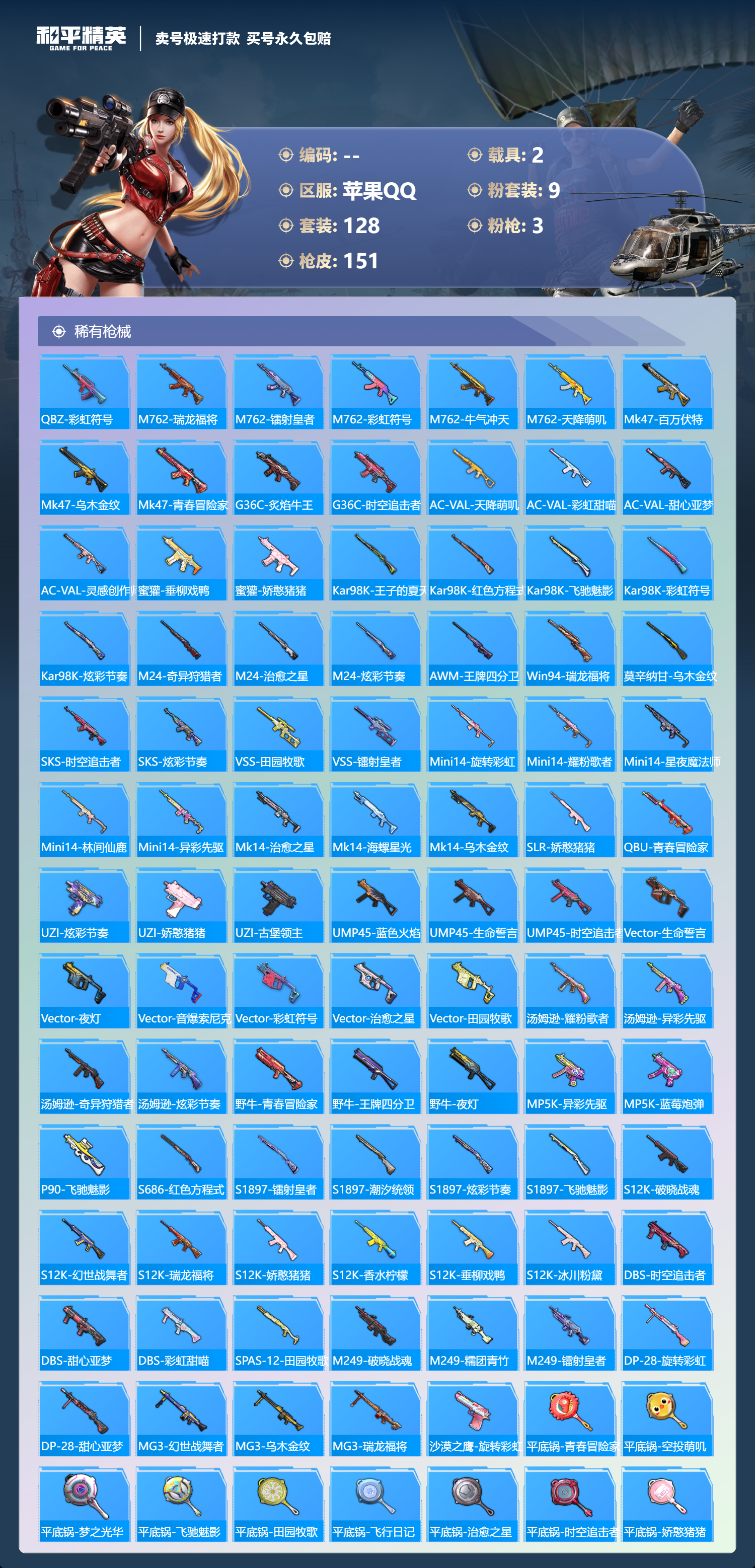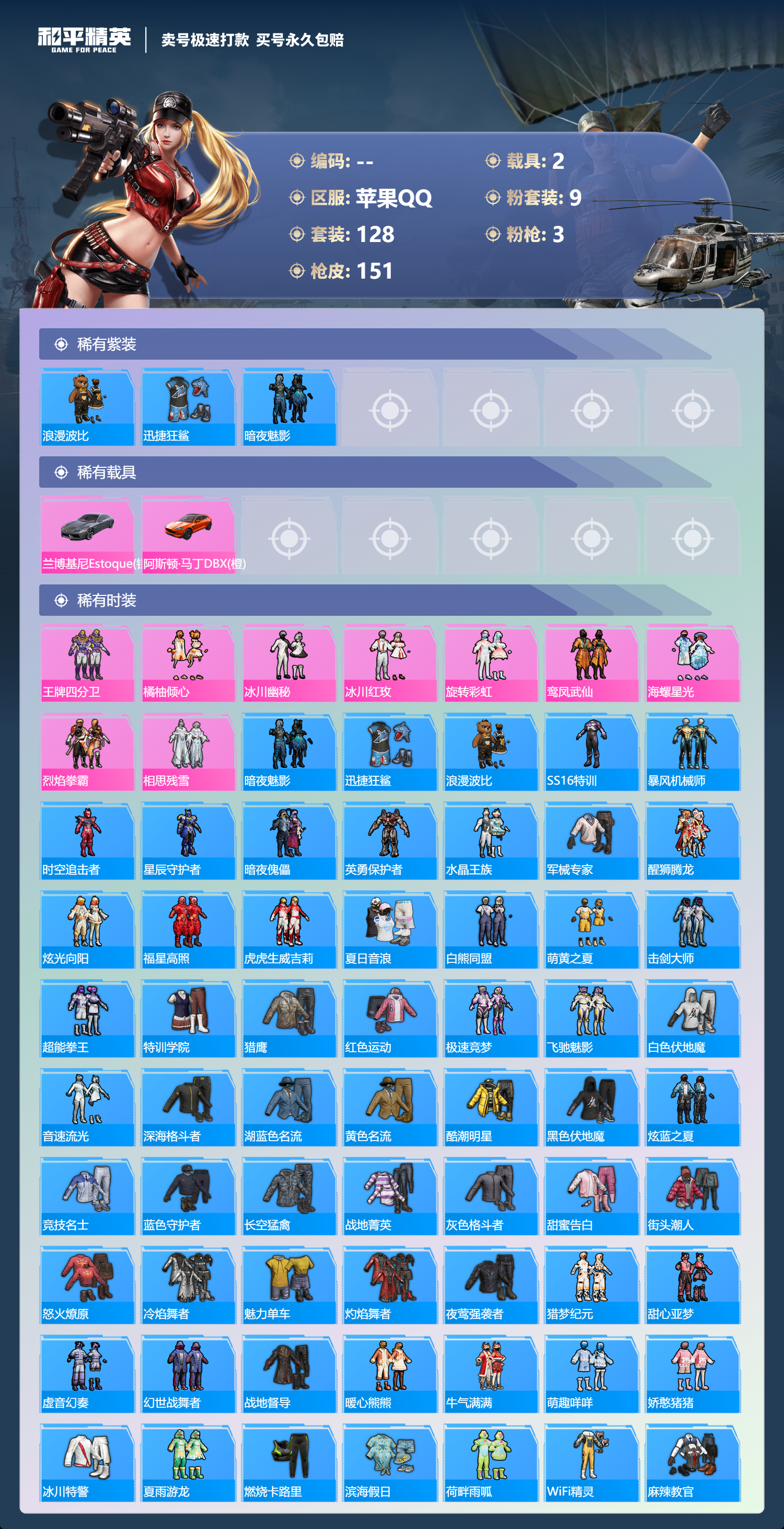 2载具-128套装-151呛皮-可二次实名 苹果qq128套装/151呛皮/9粉装/2载具/3特效呛/14战备/王牌四分卫套装/海螺星光套装/冰川红玫套装/冰川幽秘套装/旋转彩虹套装/鸾凤武仙套装/橘柚倾心套装/相思残雪套装/烈焰拳