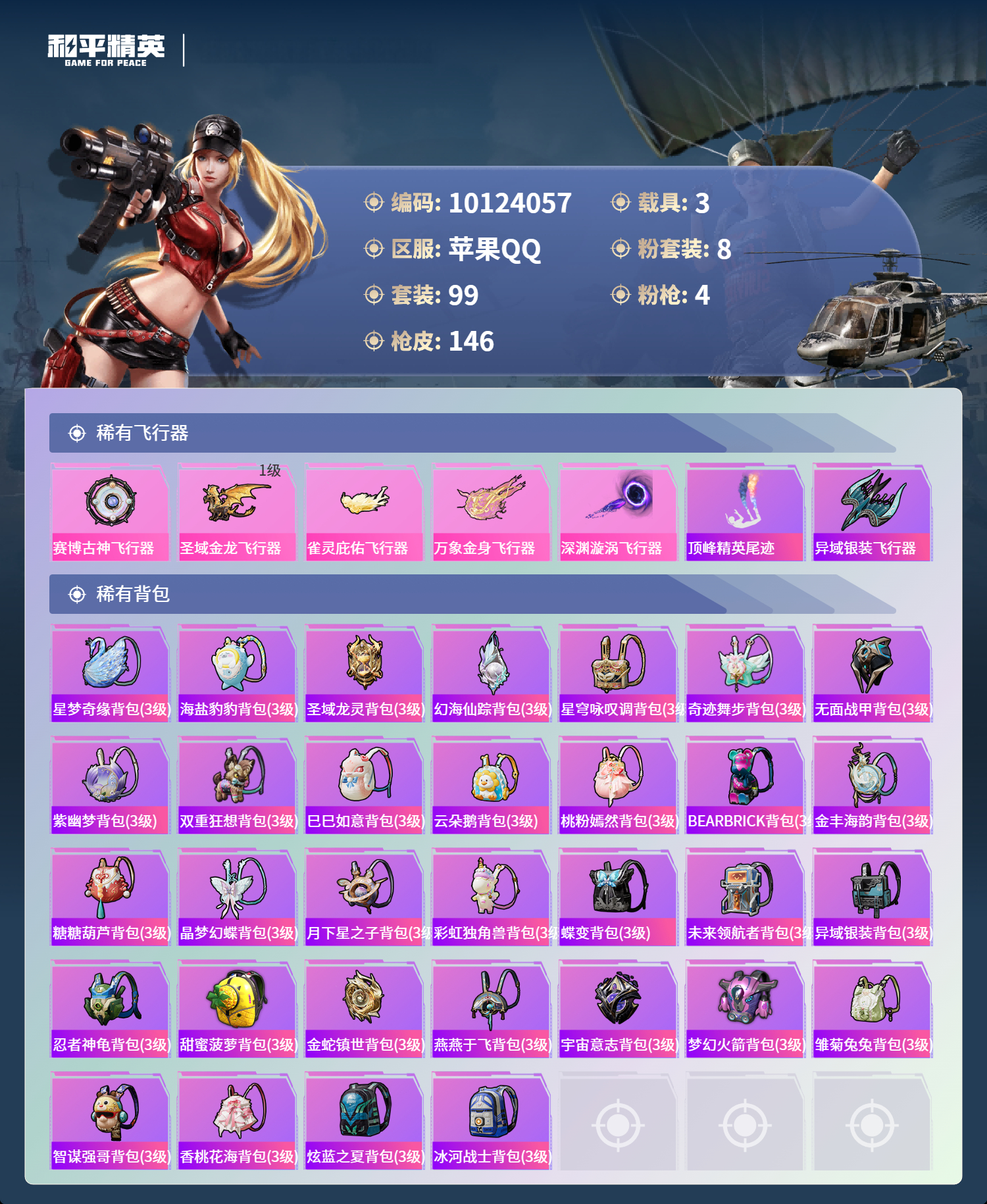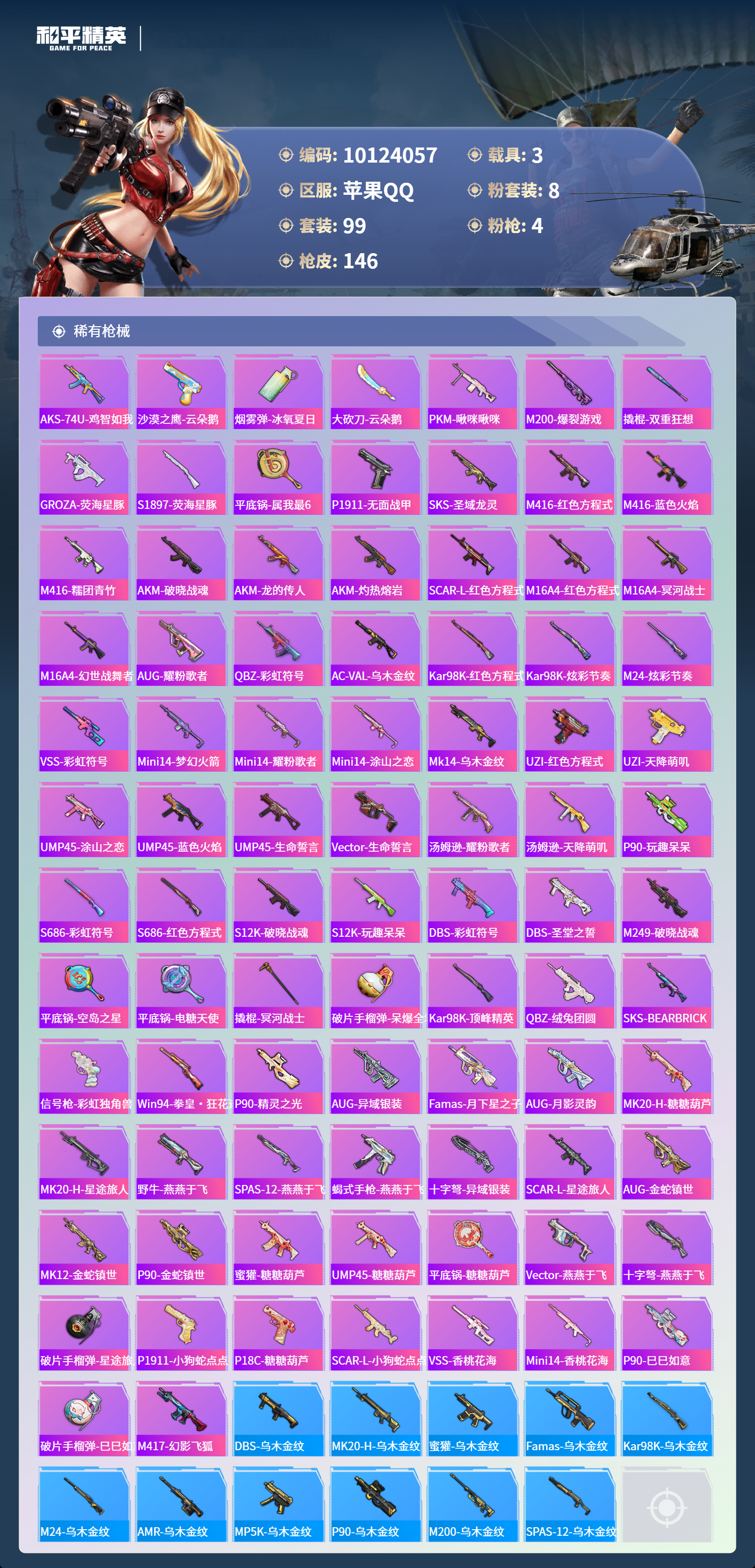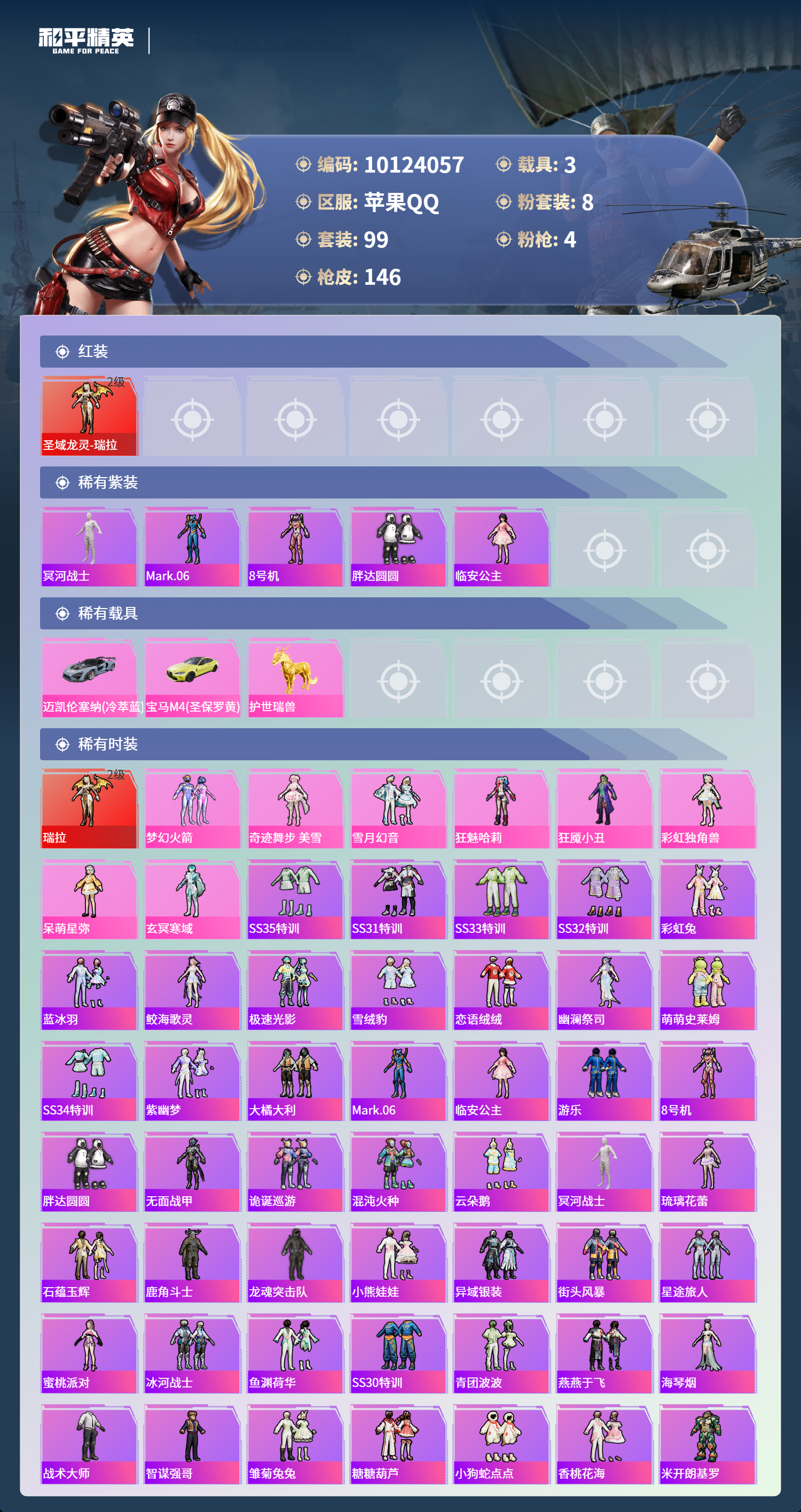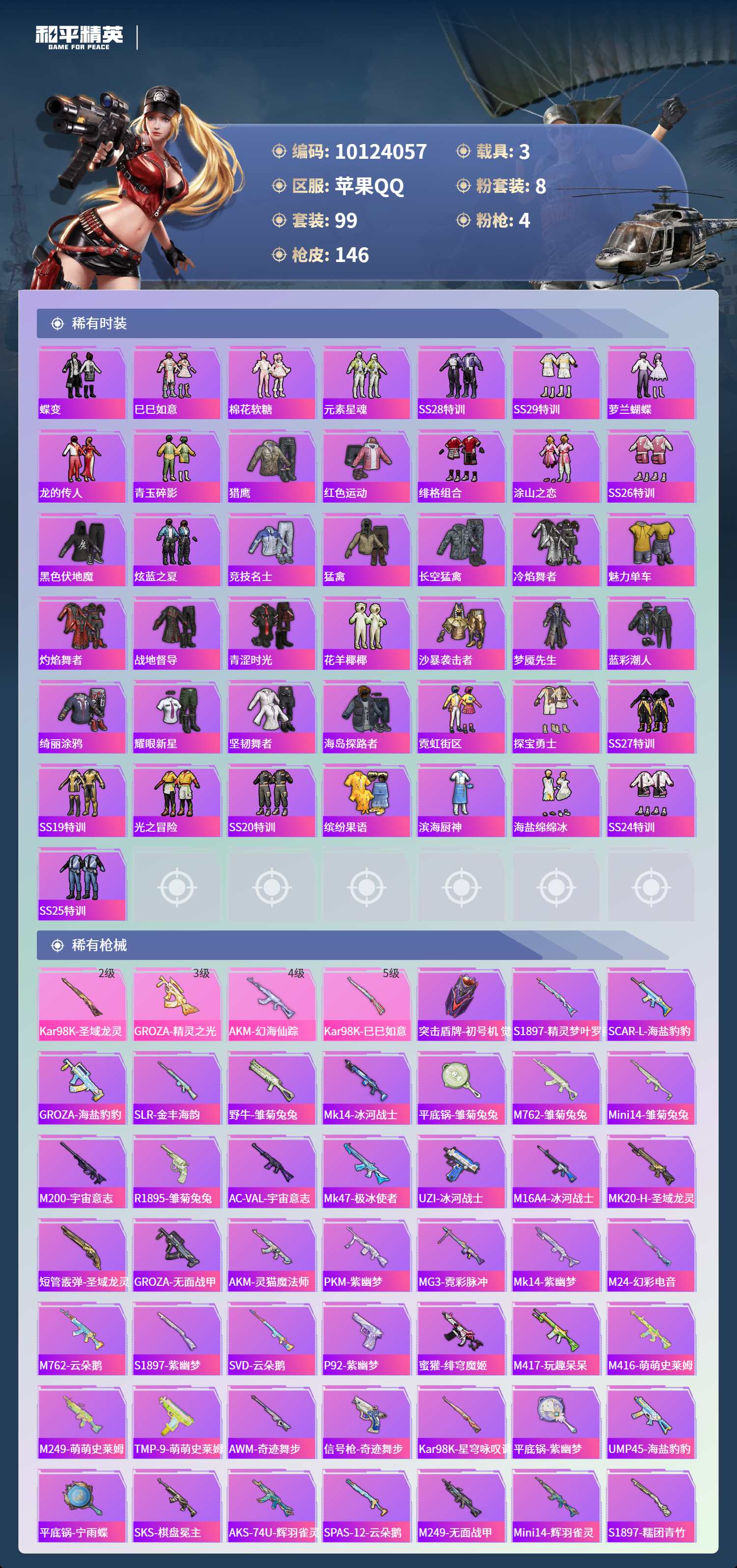 3载具-99套装-146呛皮-苹果手q-7王牌印记-1红装-8粉装-4特效呛-3载具-48655热力值-99套装-146呛皮-3卓越印记-2传奇印记【1红装】圣域龙灵-瑞拉/2级【8粉装】角色-呆萌星弥角色-彩虹独角兽套装-梦幻火箭角色-玄冥寒域角色-奇迹舞步 美雪套装-雪月幻音角色-狂魅哈莉角色-狂魇小丑【4特效呛】akm-幻海仙踪/4级kar98k-圣域龙灵/2级kar98k-巳巳如意/5级groza-
