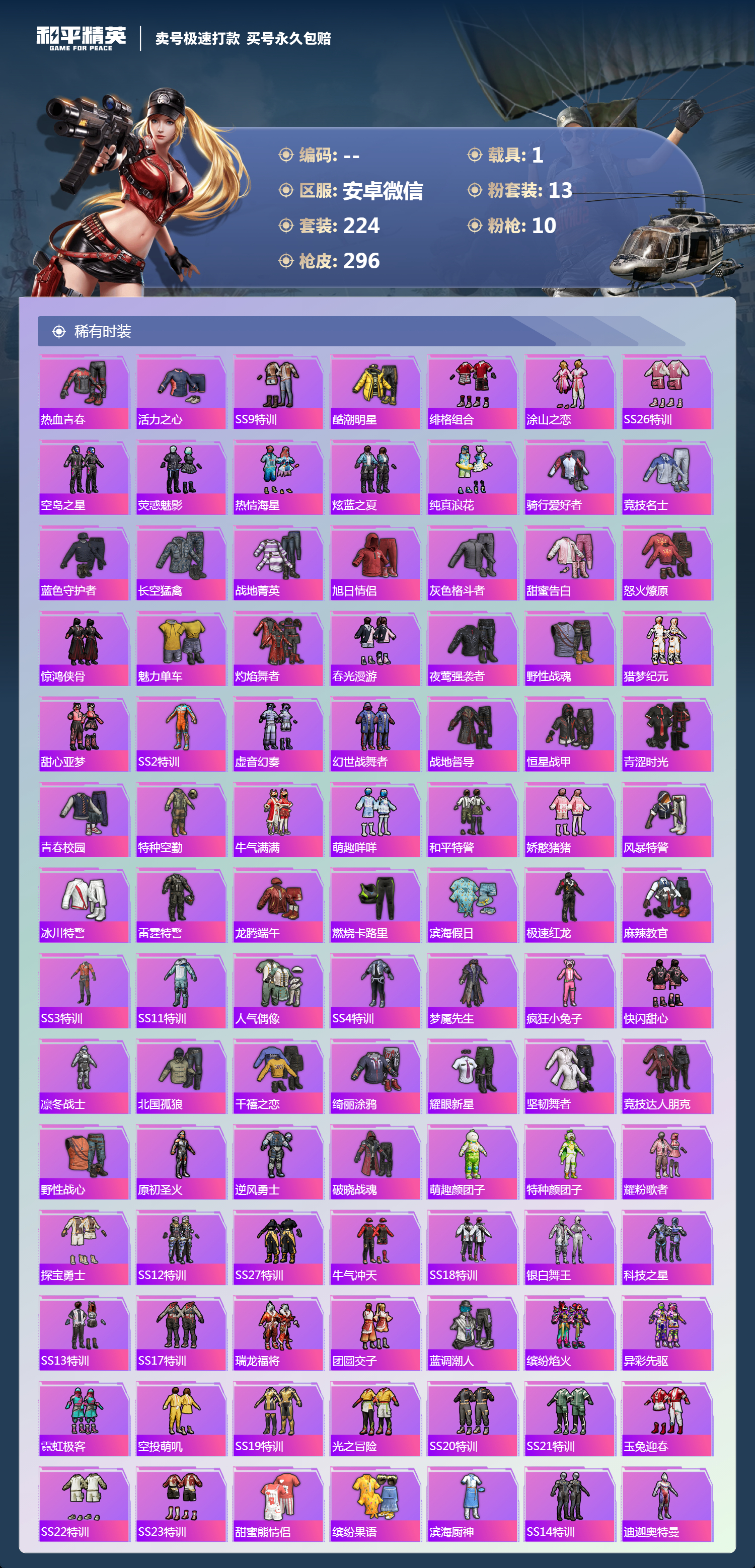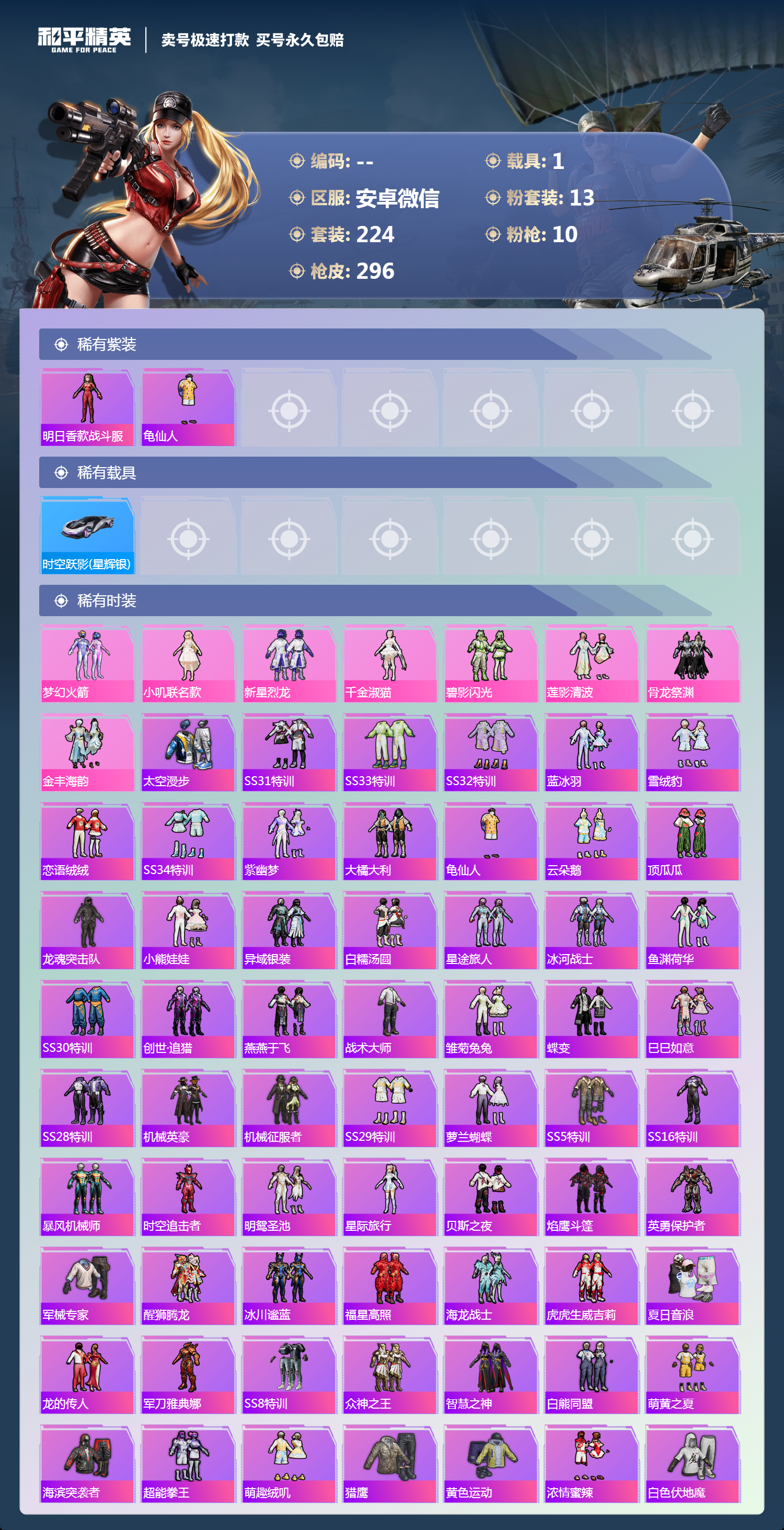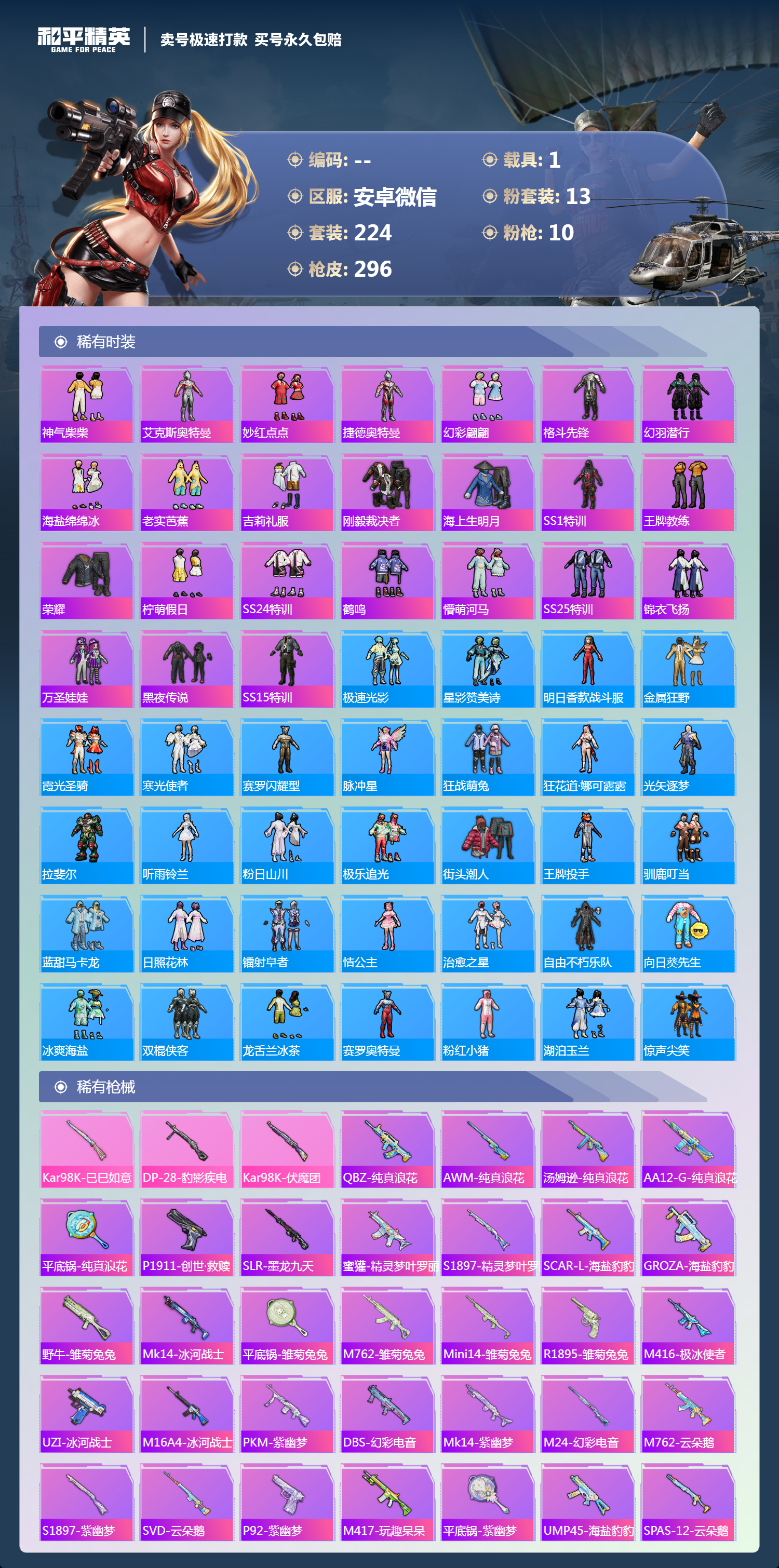 1载具-224套装-296呛皮-【呛皮号加1载具】安卓微信-2王牌印记-13粉装-10特效呛-1载具-94887热力值-224套装-296呛皮-0卓越印记-0传奇印记【13粉装】梦幻火箭小叽联名款新星烈龙千金淑猫