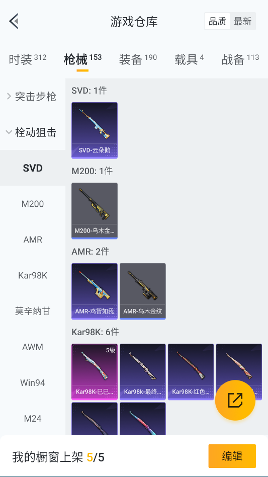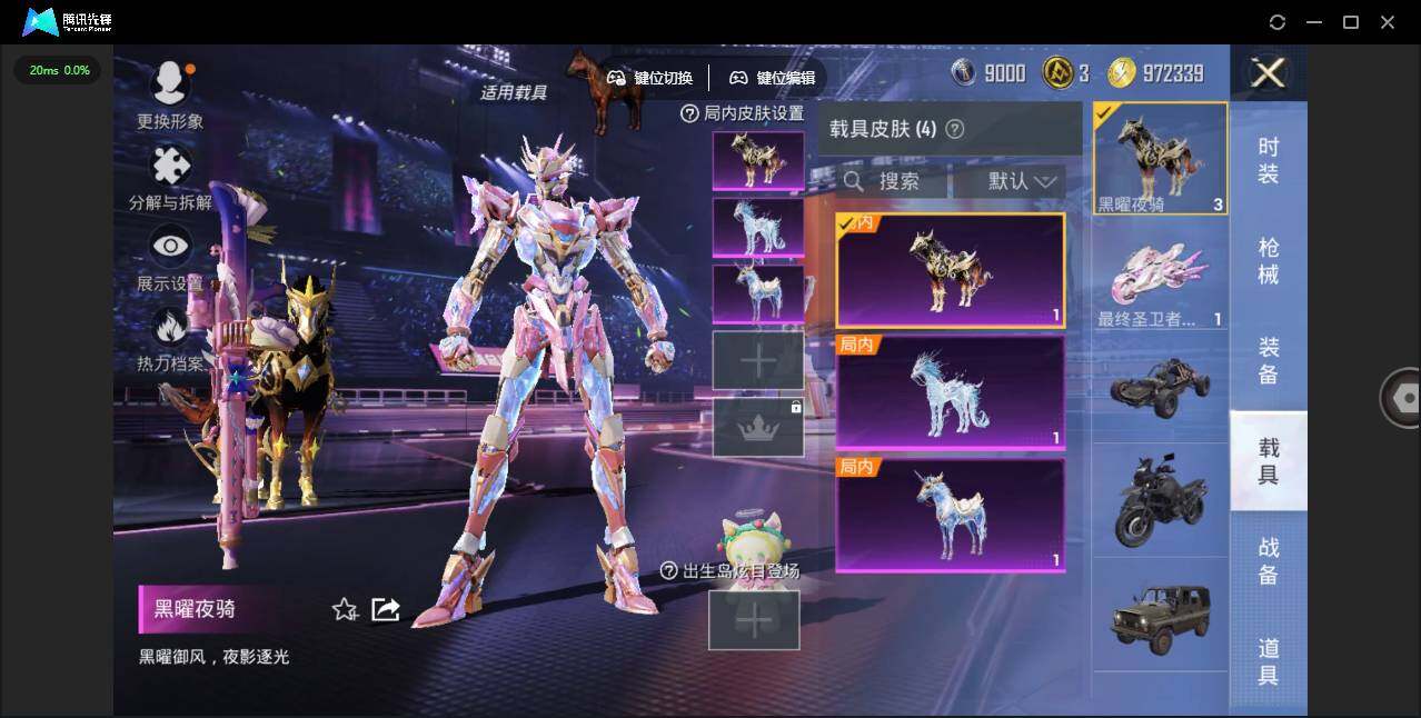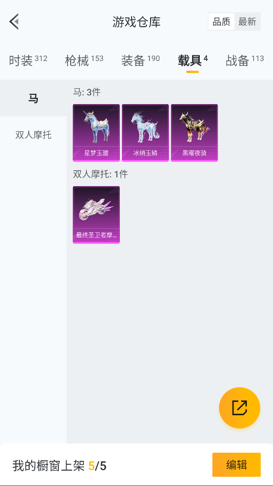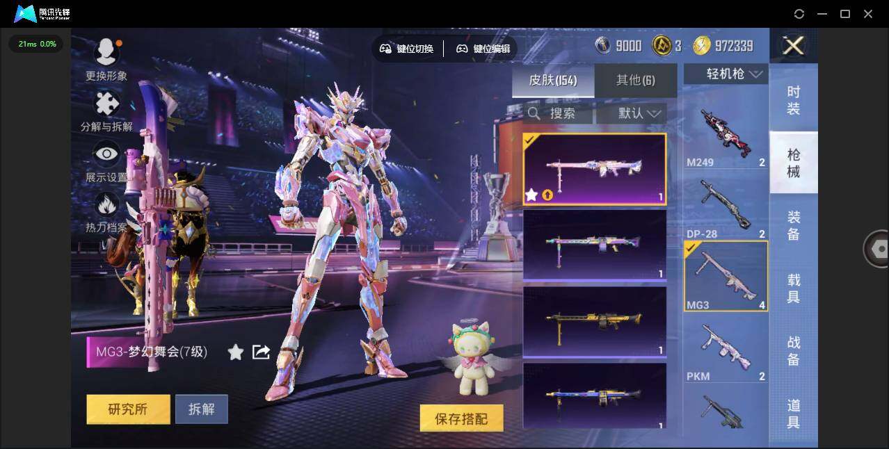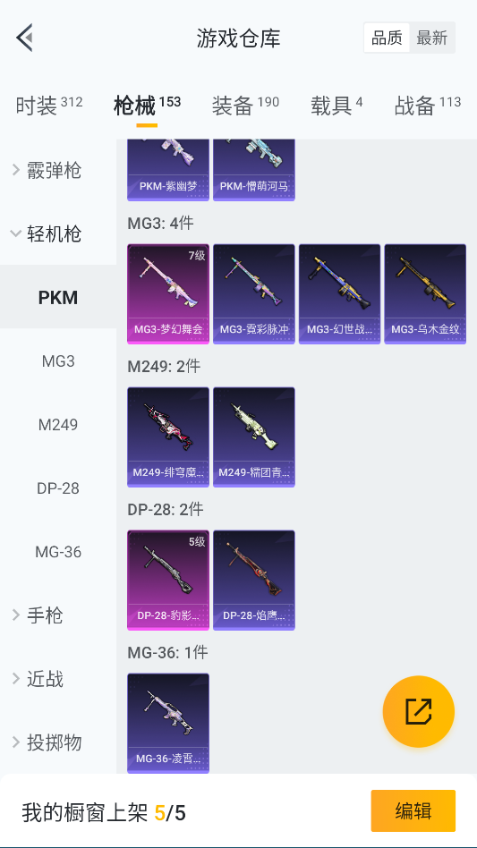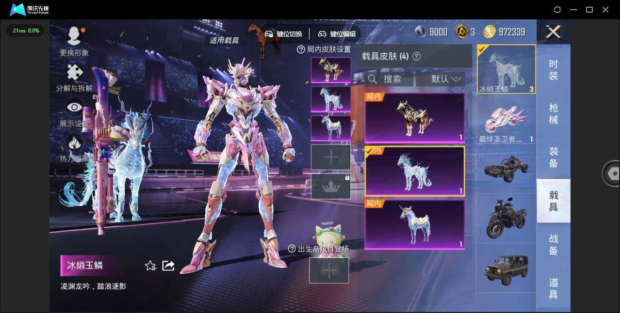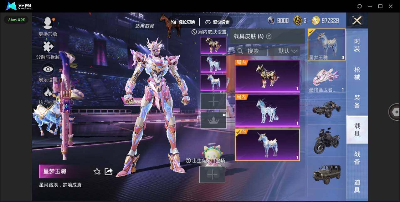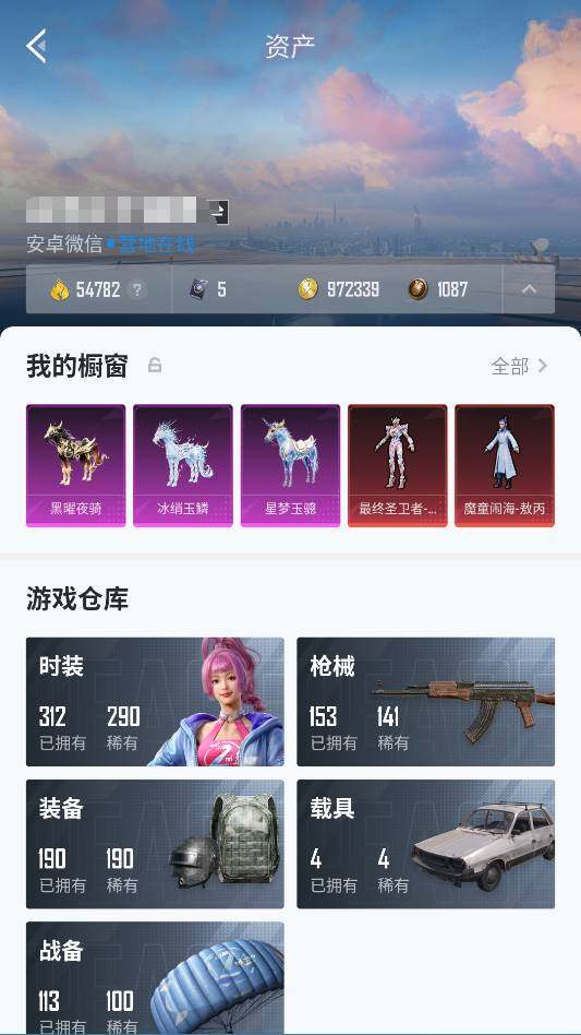 4载具-312套装-153呛皮-时装数: 86 载具数: 4 呛械数: 153 战备数: 113 热门装扮: 寒光使者复仇流浪者星梦奇缘初号机 觉醒ver.英伦信使 载具: 星梦玉骢 稀有呛皮: 七级mg3-梦幻舞会 五级scar-l-锦绣绵绵五级akm-绿萝繁花五级kar98k-巳巳如意五级dp-28-豹影疾电三级