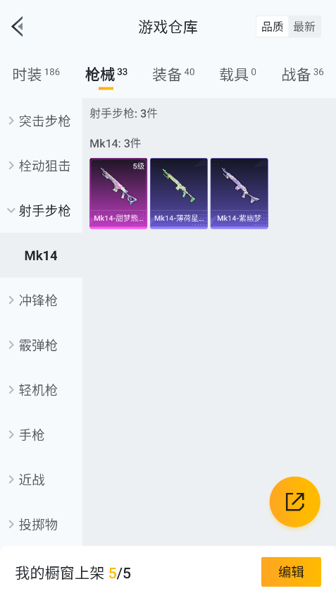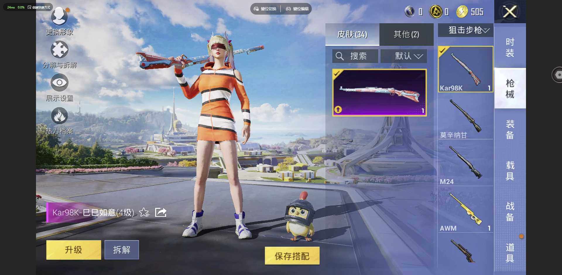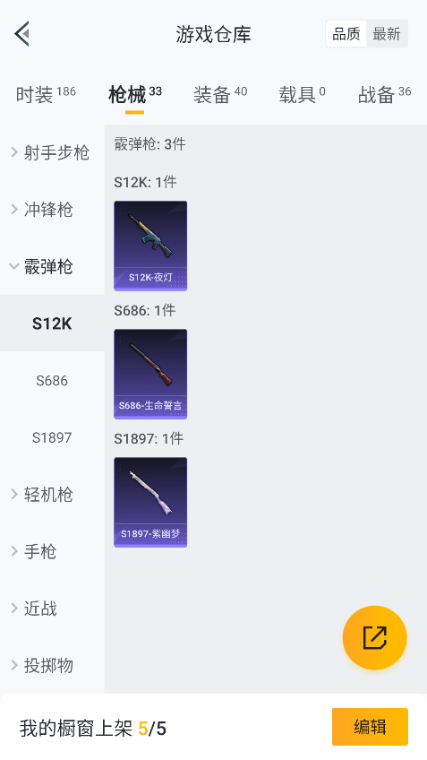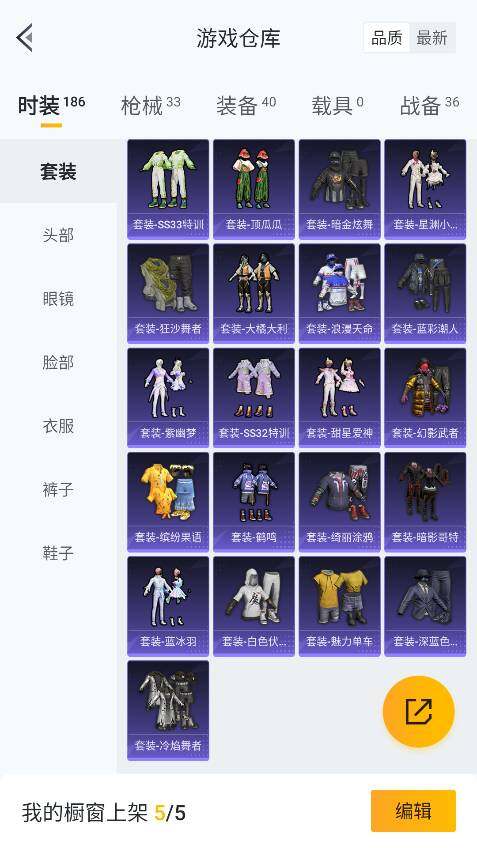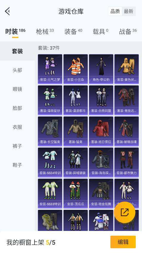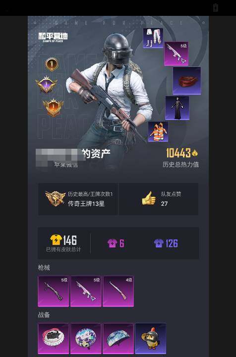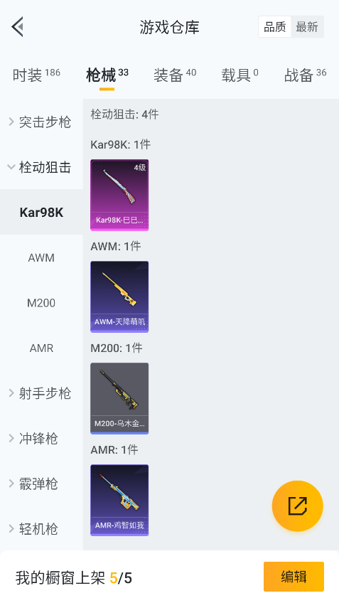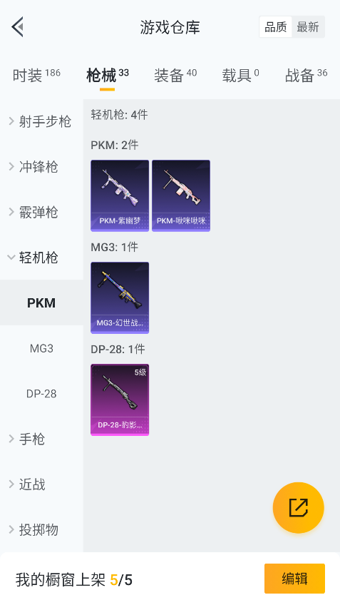 0载具-186套装-33呛皮-时装数: 37 呛械数: 33 战备数: 36 稀有呛皮: 五级mk14-甜梦熊击五级dp-28-豹影疾电,四级kar98k-巳巳如意