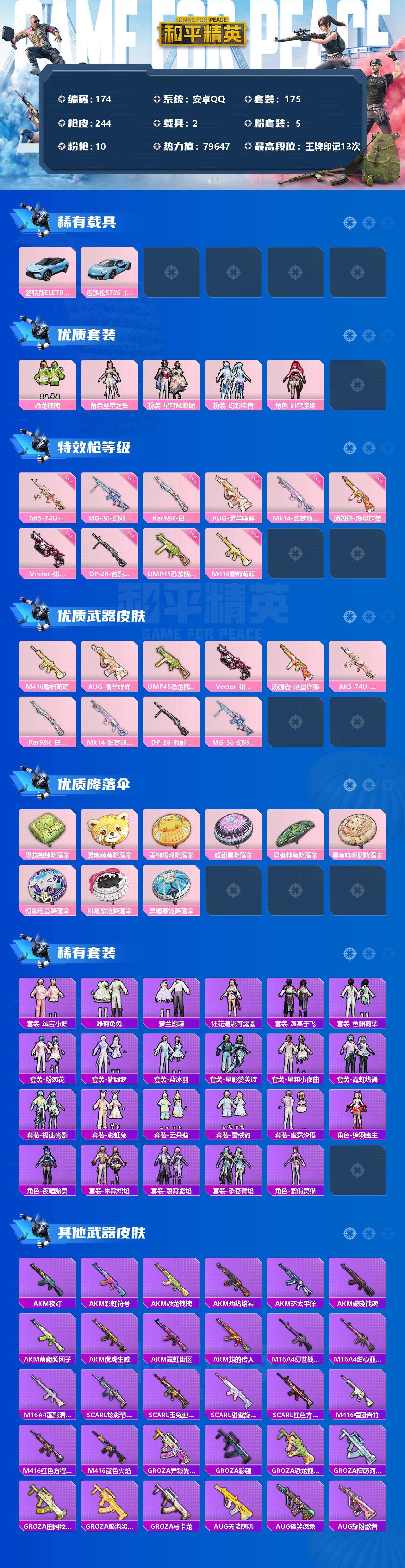 2载具-175套装-244呛皮-175套装/呛械10/装备283/载具2/战备148/王牌印记13/热力值79647/四级m416-暖熊萌萌/五级aug-暖羊咩咩/四级ump45-恐龙拽拽/五级vect-绯穹魔姬/五级汤姆逊-热量炸弹/七级aks-74u-星穹咏叹调/五级kar98k-巳巳如意/五级mk14-甜梦熊击/五级dp-28-豹影疾电/七级mg-36-幻彩电音/套装-龟仙人/套装-暗影哥特/角色-mark.06/