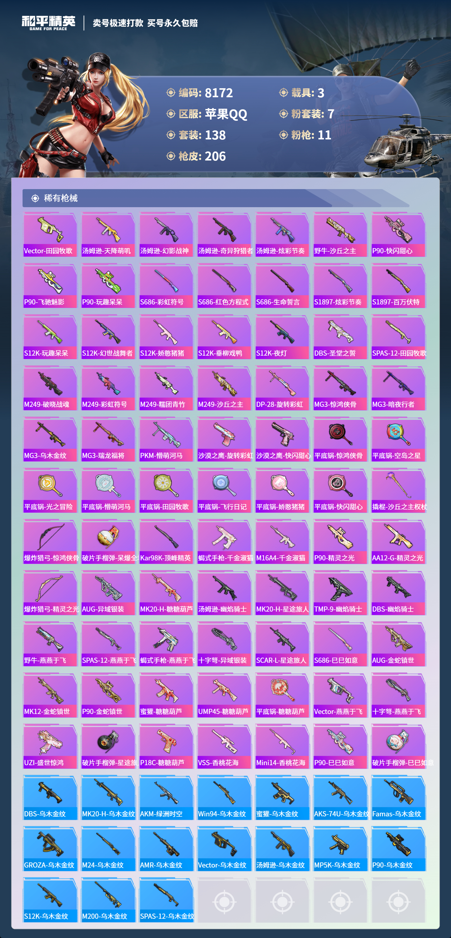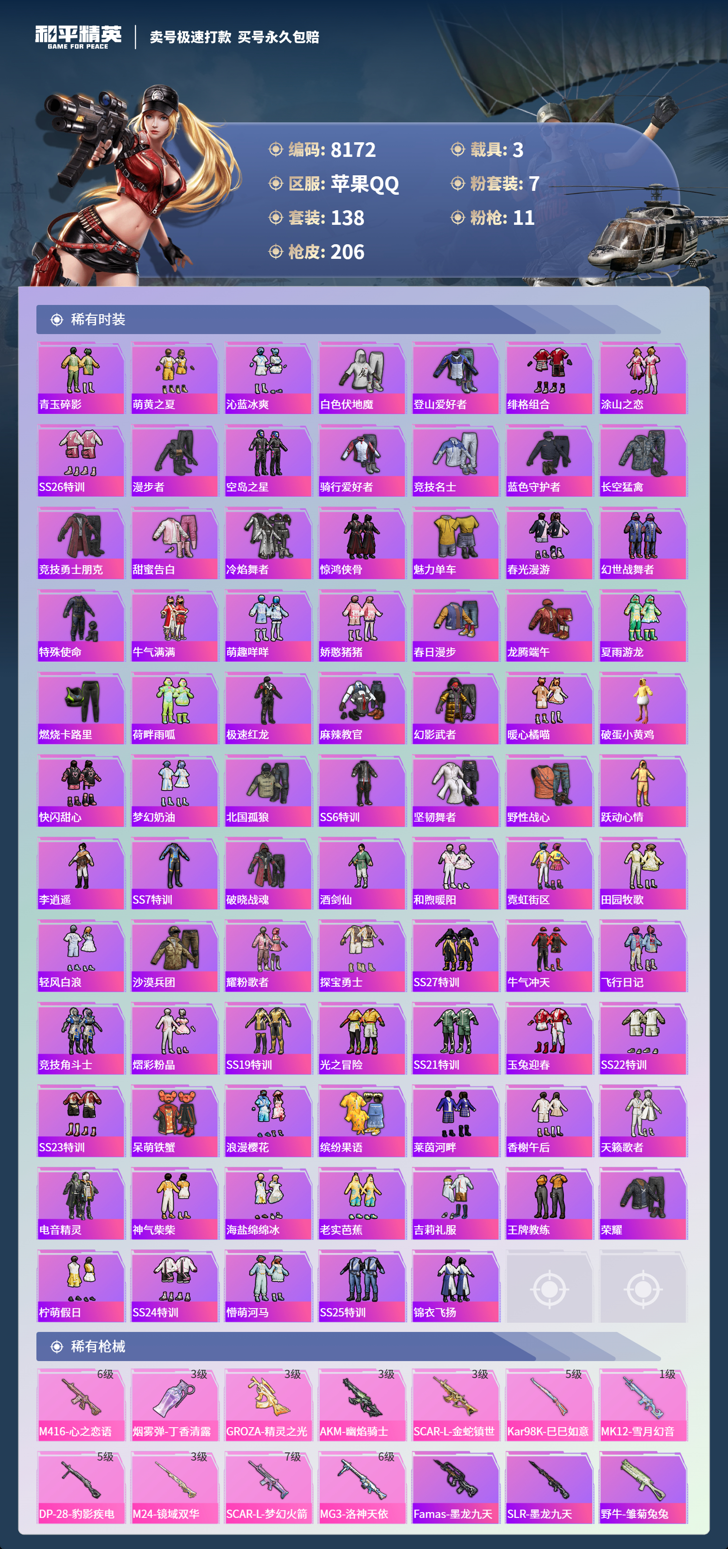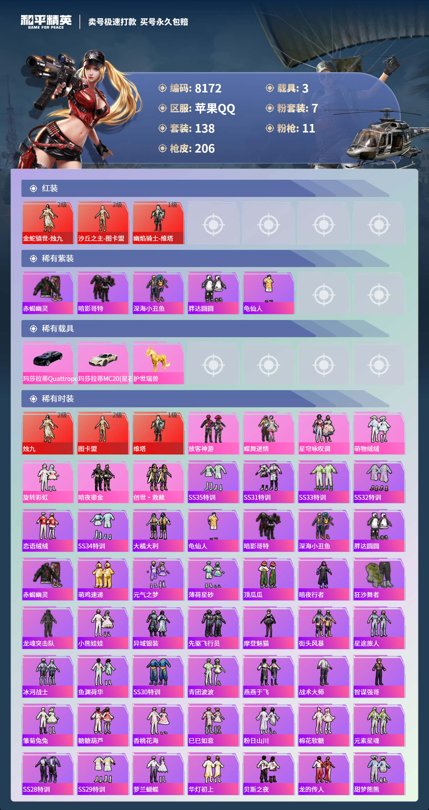 3载具-138套装-206呛皮-特价编码8172🌷🍎苹果qq 7.6w热力值 72级收藏家 ss31战神框 安徽第2940祈福者 3红🌹7粉👗41特🔫 2车🚗1马🐴1飞✈️ 2级图卡盟 烛九 维塔 赤蝎 胖达圆圆 放客 蝶舞 旋转彩虹 暗夜 创世 akm-幽焰骑士 m416-心之恋语 groza-精灵之光 scar-l-梦幻火箭 scar-l-金蛇镇世 m24-镜域双华 mk12-雪月幻音 mg3-洛