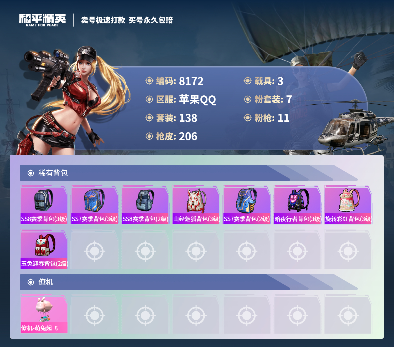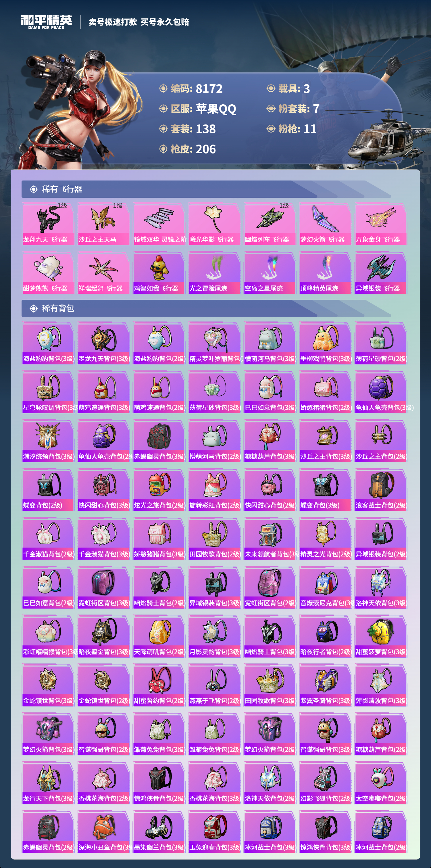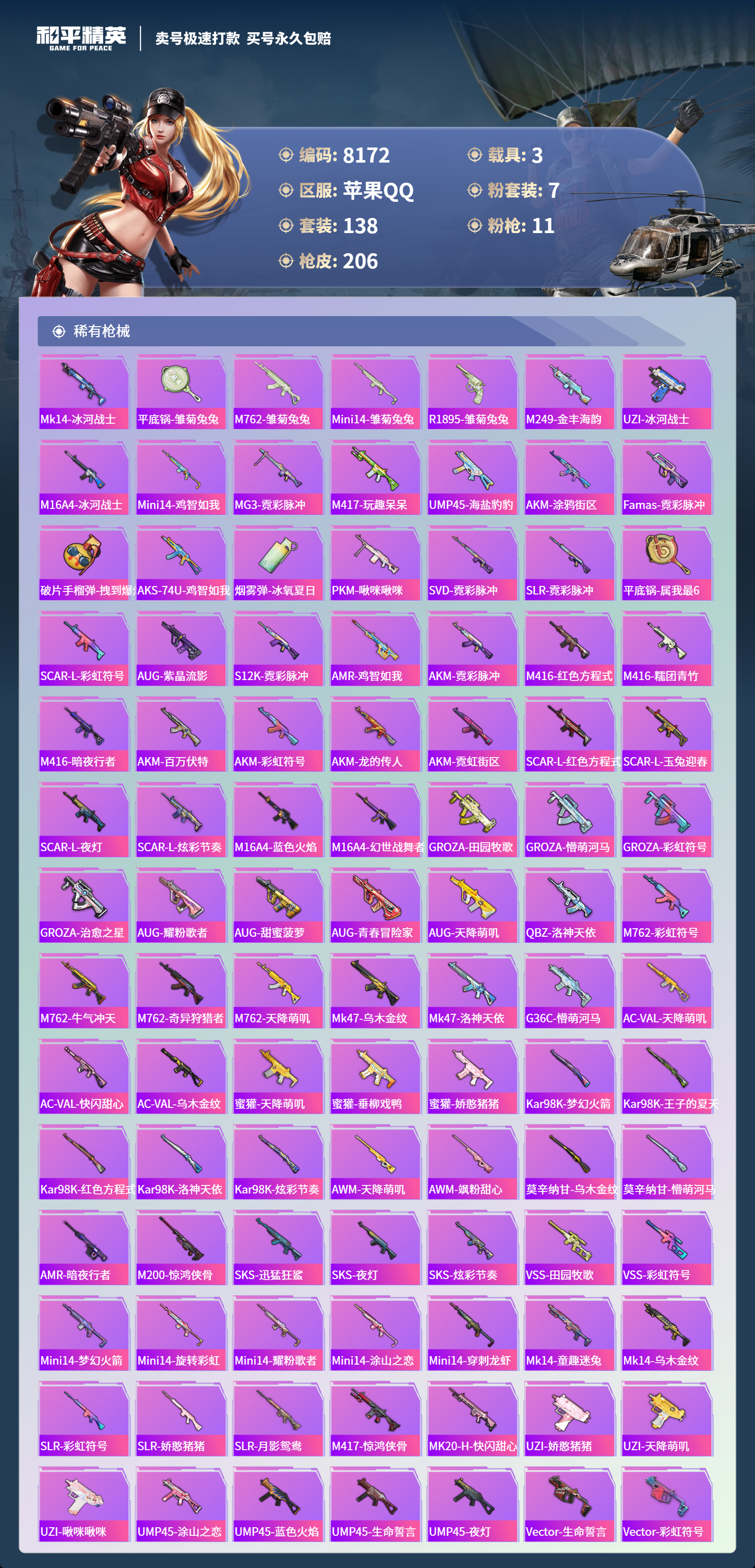 3载具-138套装-206呛皮-特价编码8172🌷🍎苹果qq 7.6w热力值 72级收藏家 ss31战神框 安徽第2940祈福者 3红🌹7粉👗41特🔫 2车🚗1马🐴1飞✈️ 2级图卡盟 烛九 维塔 赤蝎 胖达圆圆 放客 蝶舞 旋转彩虹 暗夜 创世 akm-幽焰骑士 m416-心之恋语 groza-精灵之光 scar-l-梦幻火箭 scar-l-金蛇镇世 m24-镜域双华 mk12-雪月幻音 mg3-洛
