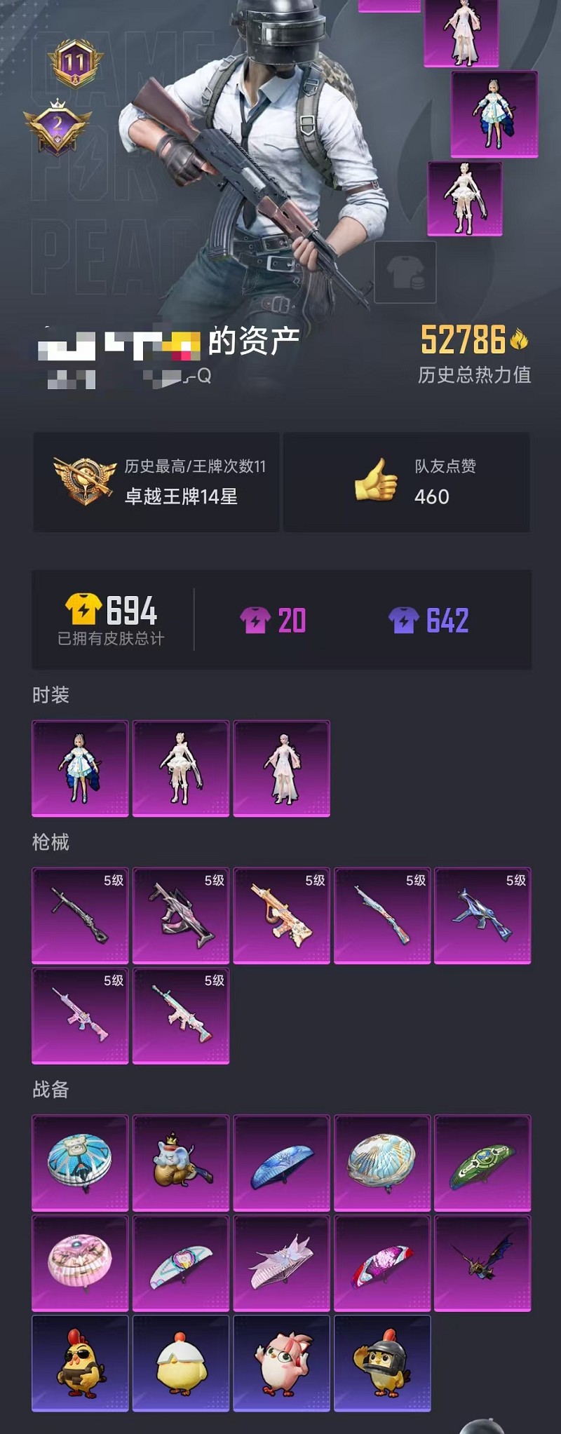 可二次【蓝螳螂洛天依 3粉装7特效呛 可秒换绑】 安卓q区-52786热力值-11印记-152套装-179呛皮 【1稀有】 mark.06【3粉装】 洛天依 角色-烟云彩露 角色-千金淑猫【7特效呛】 scar-l-锦绣绵绵5级 m416-电玩时刻5级 ump45-量子极限5级 groza-镜光银凌5级 kar98k-巳巳如意5级 dp-28-豹影疾电5级