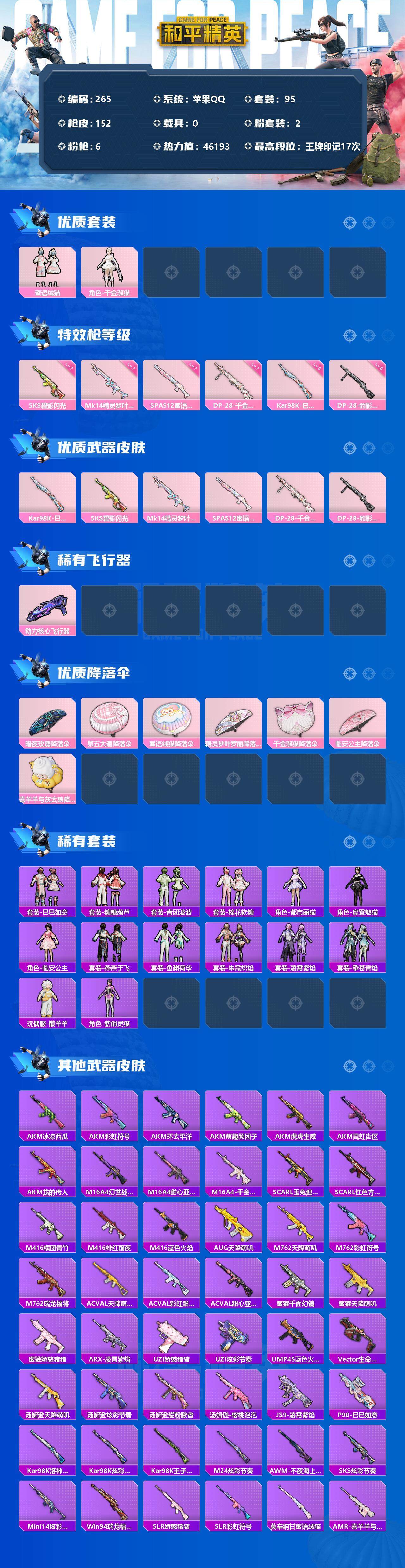 0载具-95套装-152呛皮-95套装/呛械6/装备167/战备109/王牌印记17/热力值46193/五级kar98k-巳巳如意/七级sks-碧影闪光/七级mk14-精灵梦叶罗丽/七级spas-12-蜜语绒猫/七级dp-28-千金淑猫/五级dp-28-豹影疾电/套装-龟仙人/蜜语绒猫/千金淑猫/kar98k-巳巳如意/sks-碧影闪光/mk14-精灵梦叶罗丽/spas-12-蜜语绒猫/dp-28-千金淑猫/dp-28-豹