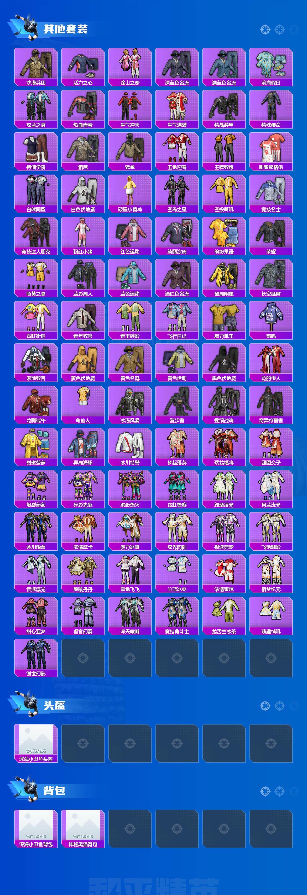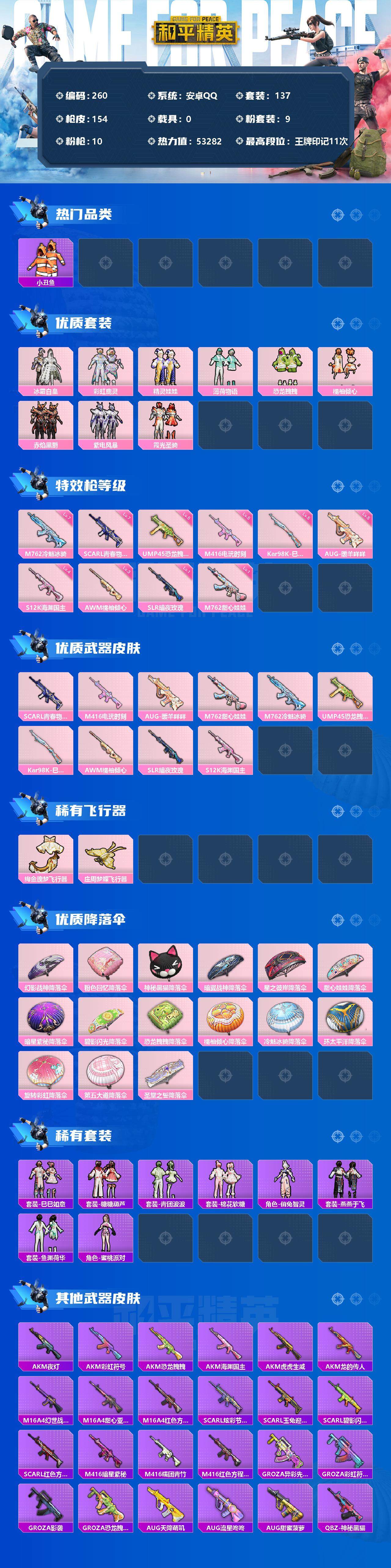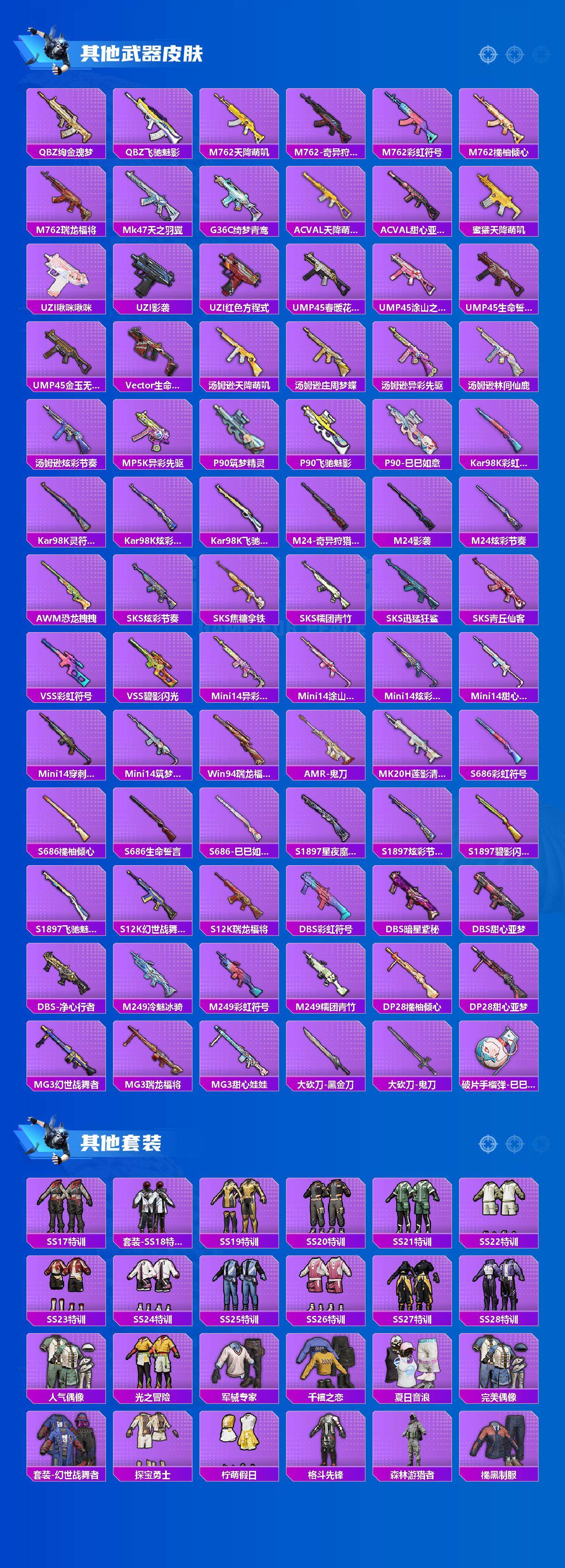 0载具-137套装-154呛皮-137套装/呛械10/装备181/战备127/王牌印记11/热力值53282/七级scar-l-青春物语/五级m416-电玩时刻/五级aug-暖羊咩咩/m762-甜心娃娃/七级m762-冷魅冰骑/五级ump45-恐龙拽拽/五级kar98k-巳巳如意/三级awm-橘柚倾心/slr-暗夜玫瑰/四级s12k-海渊国主/小丑鱼/奇异狩猎者/套装-龟仙人/套装-粉红小猪/冰霜白皇/彩虹鹿灵/精灵娃娃/薄