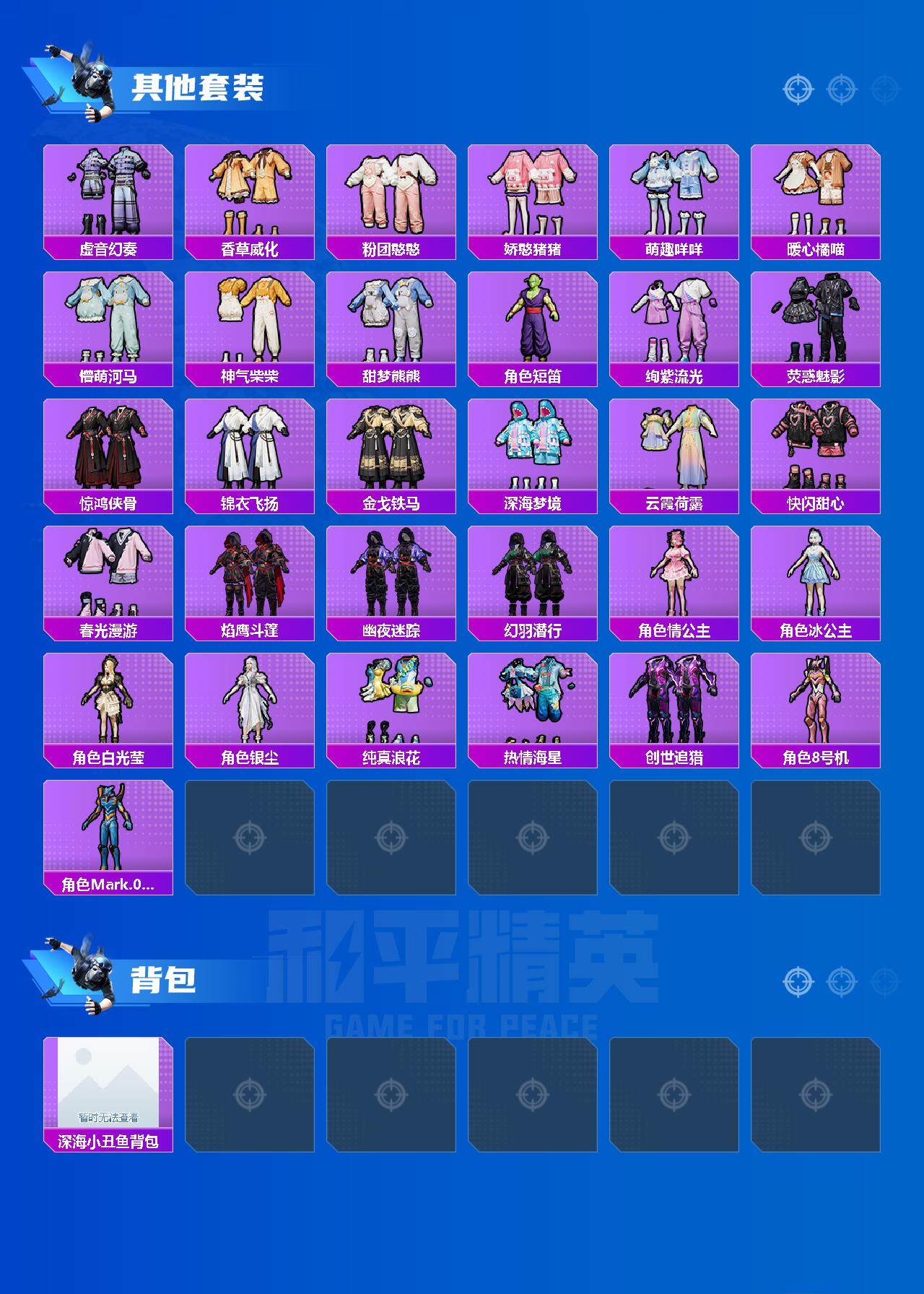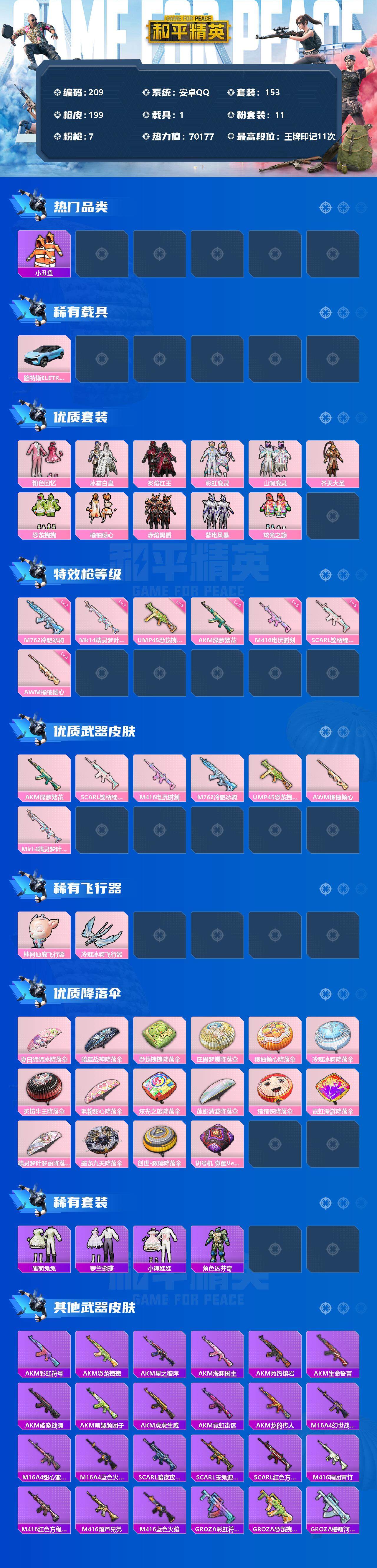 1载具-153套装-199呛皮-153套装/呛械7/装备266/载具1/战备156/王牌印记11/热力值70177/五级akm-绿萝繁花/五级scar-l-锦绣绵绵/五级m416-电玩时刻/七级m762-冷魅冰骑/五级ump45-恐龙拽拽/四级awm-橘柚倾心/七级mk14-精灵梦叶罗丽/小丑鱼/奇异狩猎者/套装-龟仙人/套装-粉红小猪/角色-8号机/角色-mark.06/路特斯eletre冰川蓝/粉色回忆/冰霜白皇/炙