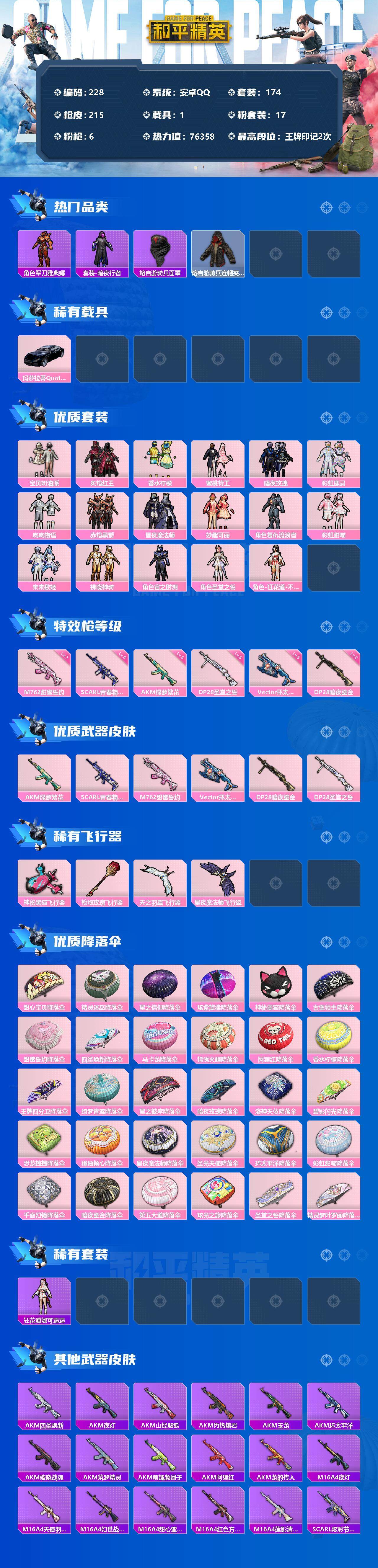 1载具-174套装-215呛皮-174套装/呛械6/装备292/载具1/战备157/王牌印记2/热力值76358/五级akm-绿萝繁花/五级scar-l-青春物语/七级m762-甜蜜誓约/五级vect-环太平洋/二级dp-28-暗夜鎏金/五级dp-28-圣堂之誓/深海小丑鱼/军刀雅典娜/暗夜行者/2b战斗服款/套装-潮萌小黄鸭/套装-暗影哥特/套装-浪漫波比/熔岩游骑兵面罩/熔岩游骑兵连帽夹克/玛莎拉蒂quattropo