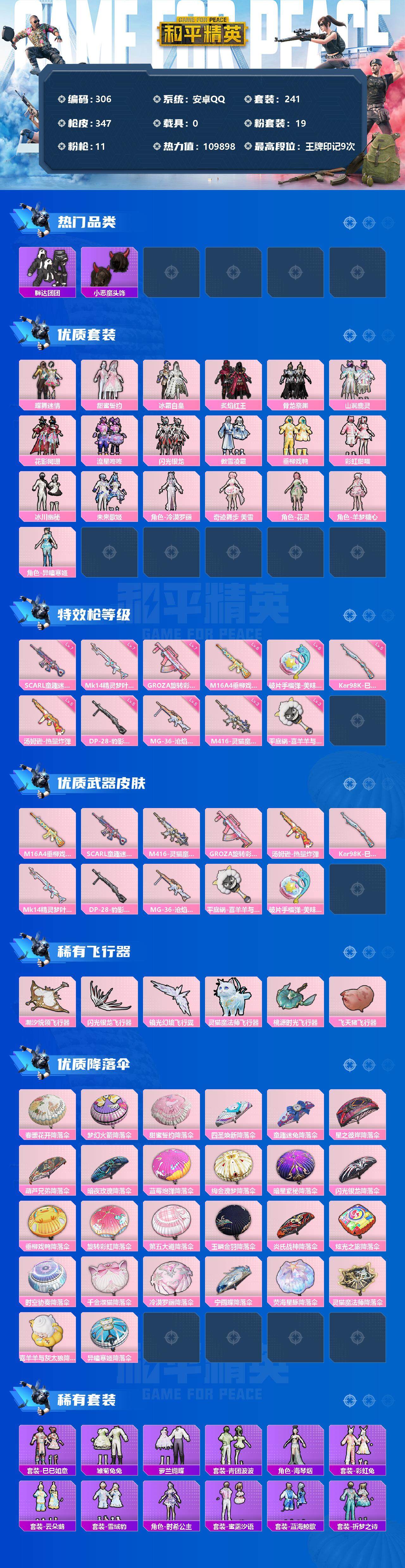 0载具-241套装-347呛皮-241套装/呛械11/装备412/战备212/王牌印记9/热力值/六级m16a4-垂柳戏鸭/七级scar-l-童趣迷兔/三级m416-灵猫魔法师/七级groza-旋转彩虹/五级汤姆逊-热量炸弹/五级kar98k-巳巳如意/七级mk14-精灵梦叶罗丽/五级dp-28-豹影疾电/五级mg-36-沧焰双生/三级平底锅-喜羊羊与灰太狼/六级破片手留单-美味星星糖/深海小丑鱼/胖达团团/套装