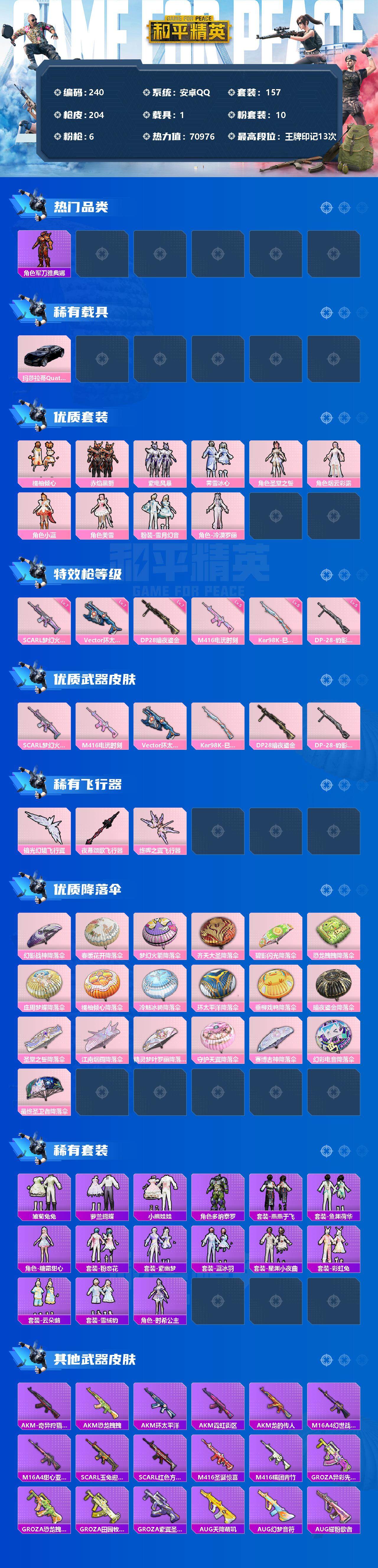 1载具-157套装-204呛皮-157套装/呛械6/装备321/载具1/战备158/王牌印记13/热力值70976/七级scar-l-梦幻火箭/五级m416-电玩时刻/七级vect-环太平洋/五级kar98k-巳巳如意/七级dp-28-暗夜鎏金/五级dp-28-豹影疾电/套装-浪漫天命/军刀雅典娜/套装-龟仙人/角色-mark.06/玛莎拉蒂quattropte夜幕蓝/橘柚倾心/赤焰黑爵/紫电风暴/霁雪冰心/圣堂