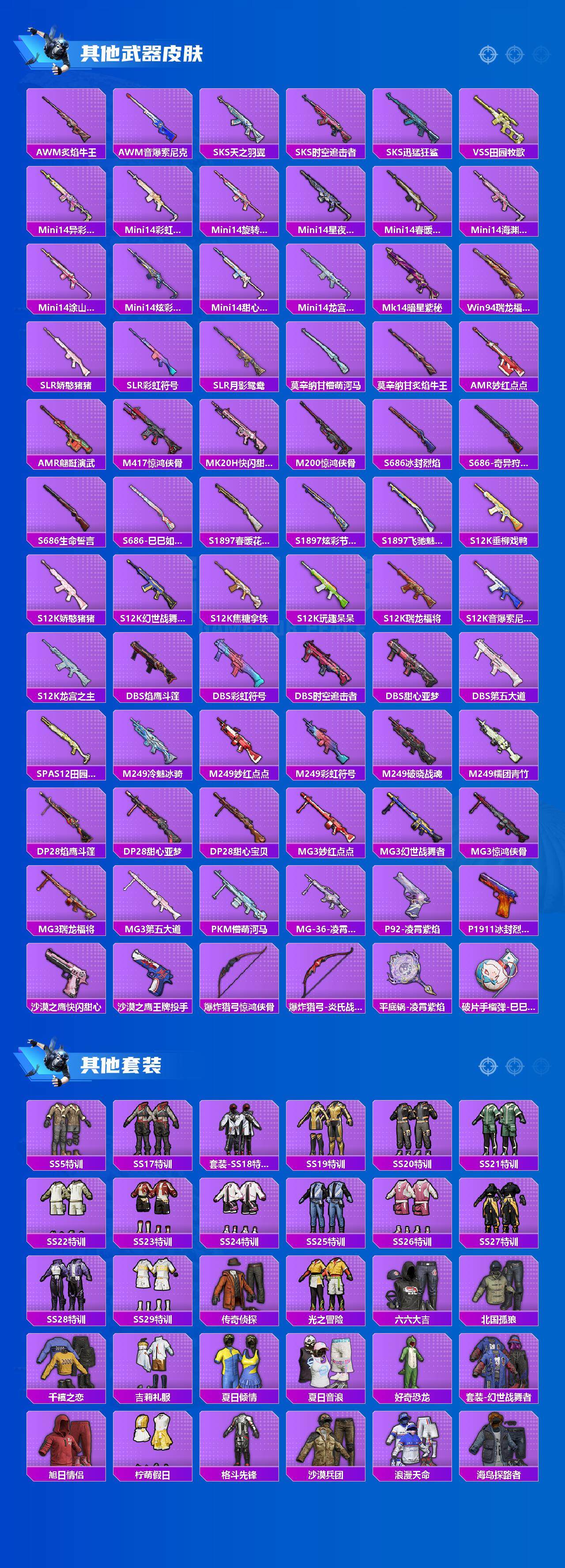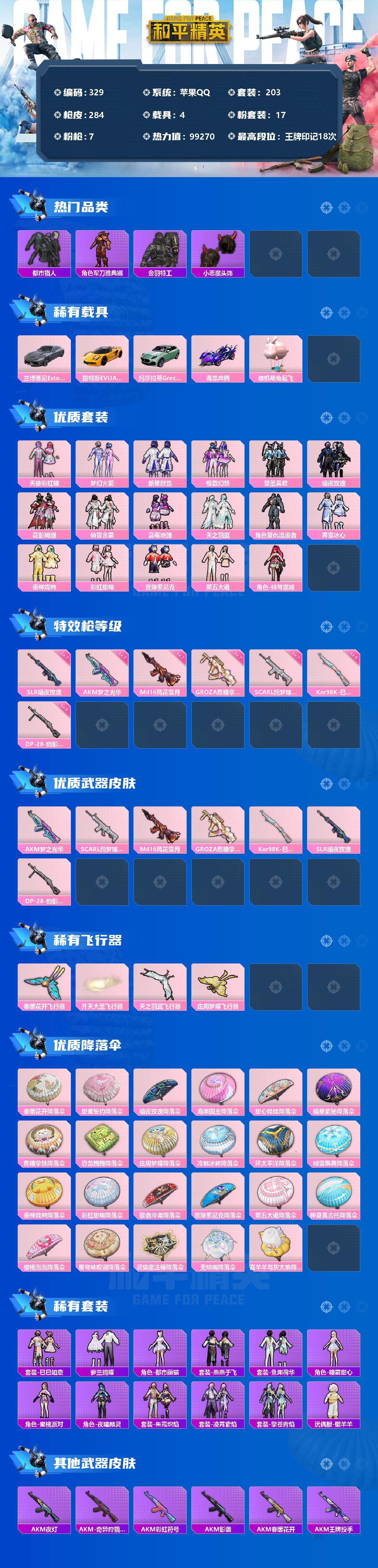 4载具-203套装-284呛皮-203套装/呛械7/装备362/载具4/战备213/王牌印记18/热力值99270/七级akm-梦之光华/七级scar-l-纯梦嫁纱/七级m416-风花雪月/七级groza-焦糖拿铁/五级kar98k-巳巳如意/七级slr-暗夜玫瑰/五级dp-28-豹影疾电/粉装-梦幻火箭/粉装-音爆索尼克/套装-浪漫天命/都市猎人/奇异狩猎者/军刀雅典娜/金羽特工/套装-龟仙人/套装-粉红小猪/角色-mar