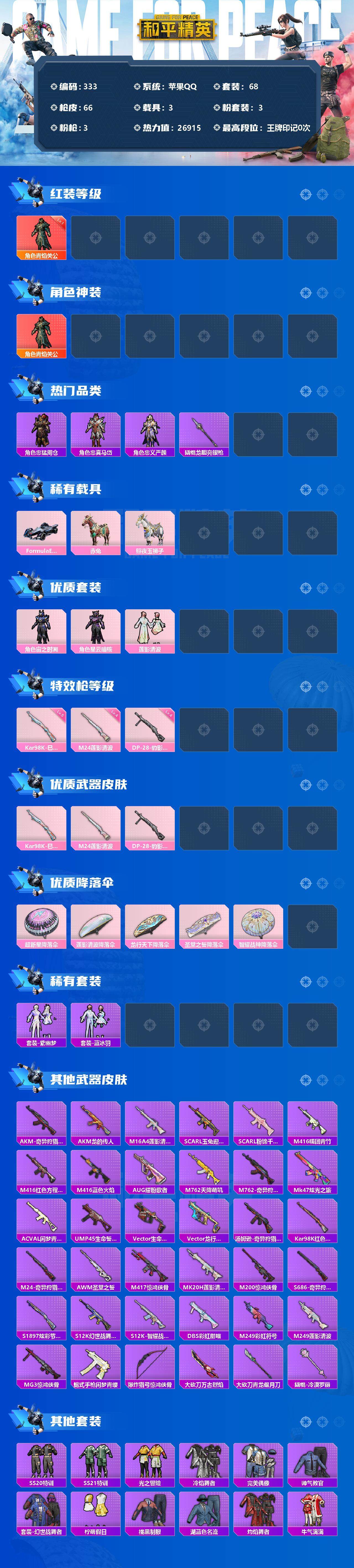 3载具-68套装-66呛皮-68套装/呛械3/装备77/载具3/战备67/热力值26915/五级kar98k-巳巳如意/四级m24-莲影清波/四级dp-28-豹影疾电/青焰关公/角色-青焰关公/奇异狩猎者/忠猛周仓/忠真马岱/忠义严颜/套装-龟仙人/大砍刀-青龙偃月刀/撬棍-龙胆亮银呛/fmula e gen2幽光蓝/赤兔/照夜玉狮子/宙之时溯/星云暗核/莲影清波/kar98k-巳巳如意/m24-莲影清波/dp-
