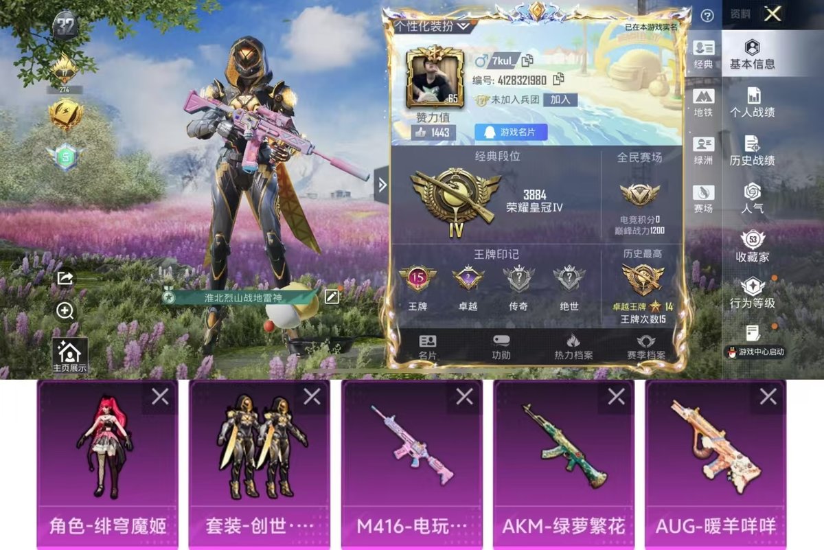 _2300456-实名:可修改时装数:568呛械数:187战备数:132热门装扮:呆萌铁蟹创世·救赎绯穹魔姬稀有呛皮:akm绿萝繁花m416电玩时刻groza-镜光银凌kar98k-巳巳如意aug-暖羊咩咩dp-28-豹影疾电mg-36-沧焰双生