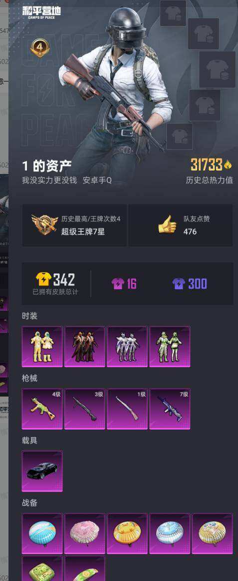 [14484184]安卓【公主号/垂柳戏鸭/碧影闪光/满级青春物语/玛莎拉蒂quattropte/4粉装-4特效呛-1载具】 手q31733热力值-4印记-61套装-100呛皮 【稀有载具】:玛莎拉蒂quattropte(夜幕蓝) 【特效呛等级】:scar-l-青春物语七级,ump45-恐龙拽拽四级,kar98k-巳巳如意一级,dp-28-豹影疾电三级 【优质套装】:粉装-碧影闪光,粉装-紫电风暴,粉装-炙焰牛王,粉装-垂柳戏鸭 【优质武器皮肤】:scar-l-青春物语,ump45-恐龙拽拽,kar98k-巳巳如意,dp-28-豹影疾电 【稀有武器皮肤】:akm-彩虹符号,akm-恐龙拽拽,akm-王牌投手,akm-生命誓言,akm-破晓战魂,akm-萌趣颜团子,akm-龙的传人,m16a4-幻世战舞者,m16a4-红色方程式,scar-l-玉兔迎春,scar-l-碧影闪光,scar-l-红色方程式,m416-糯团青竹,m416-红色方程式,m416-绿野极光,groza-异彩先驱,groza-恐龙拽拽,aug-天降萌叽,aug-耀粉歌者,q-彩虹符号,q-飞驰魅影,m762-天降萌叽,m762-瑞龙福将,mk47-妙红点点,g36c-冷魅冰骑,蜜獾-娇憨猪猪,uzi-啾咪啾咪,uzi-天降萌叽,uzi-娇憨猪猪,uzi-红色方程式,ump45-生命誓言,ump45-蓝色火焰,ump45-诡娃娃,vect-生命誓言,汤姆逊-天降萌叽,汤姆逊-异彩先驱,汤姆逊-炫彩节奏,mp5k-异彩先驱,p90-飞驰魅影,kar98k-炫彩节奏,kar98k-蓝莓炮弹,kar98k-飞驰魅影,awm-垂柳戏鸭,awm-恐龙拽拽,sks-炫彩节奏,sks-糯团青竹,vss-碧影闪光,mini14-异彩先驱,win94-瑞龙福将,slr-娇憨猪猪,莫辛纳甘-炙焰牛王,amr-妙红点点,s686-生命誓言,s686-红色方程式,s1897-炫彩节奏,s1897-碧影闪光,s1897-飞驰魅影,s12k-瑞龙福将,s12k-垂柳戏鸭,s12k-娇憨猪猪,s12k-幻世战舞者,m249-妙红点点,m249-彩虹符号,mg3-妙红点点,mg3-幻世战舞者,mg3-瑞龙福将 【其他套装】:套装-ss17特训,套装-ss18特训,套装-ss19特训,套装-ss20特训,套装-