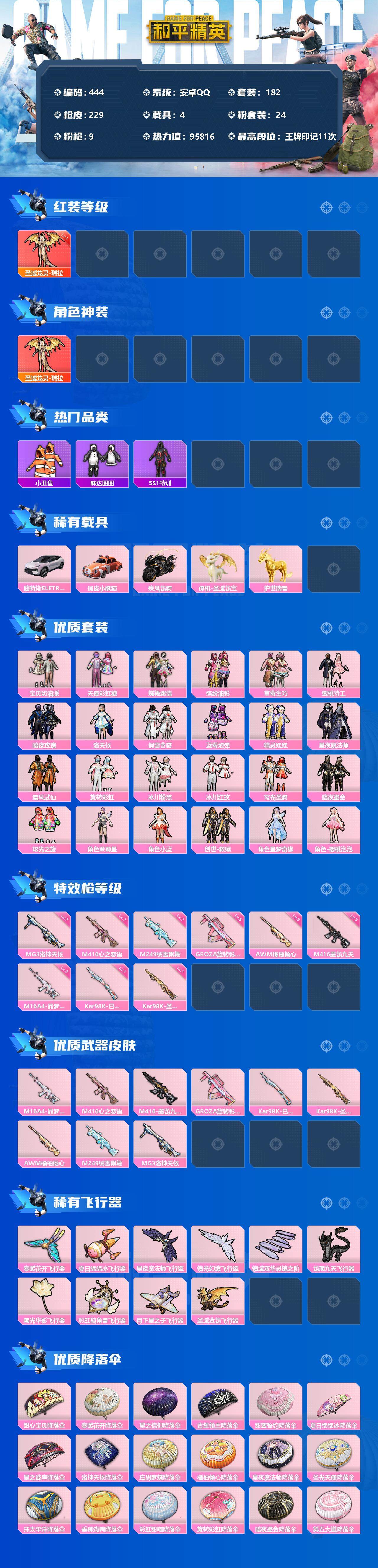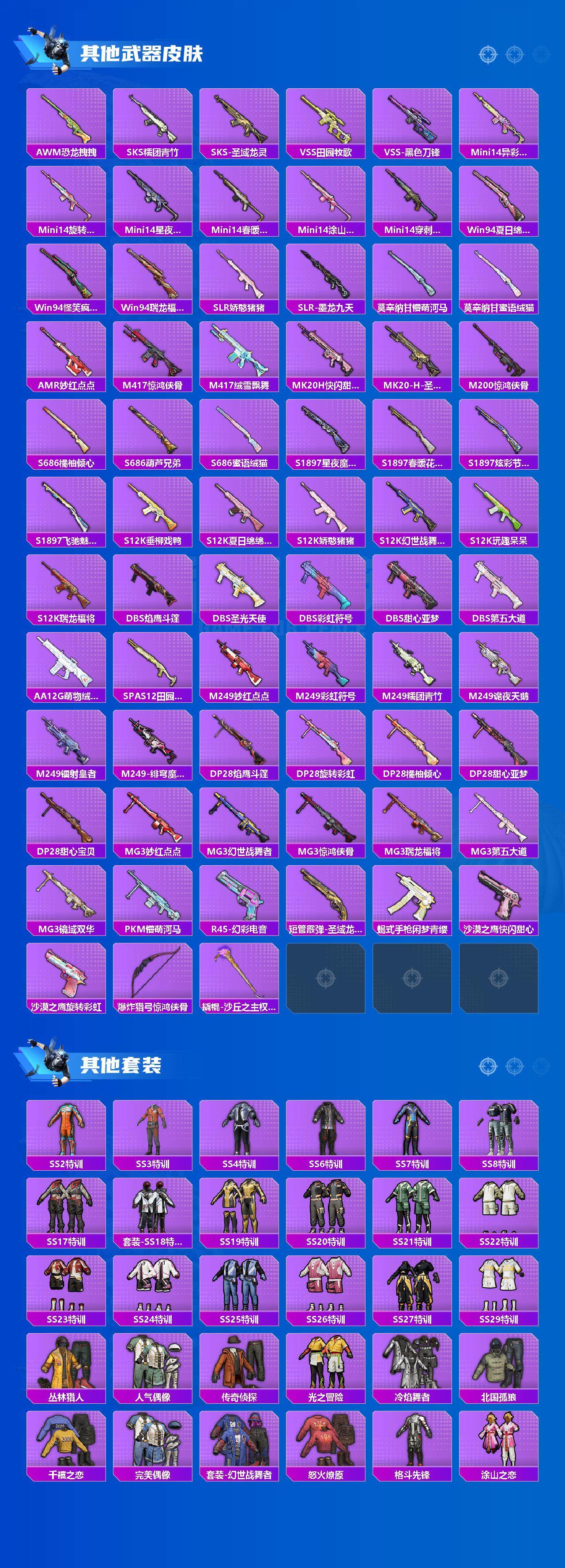 4载具-182套装-229呛皮-182套装/呛械9/装备370/载具4/战备219/王牌印记11/热力值95816/三级m16a4-晶梦幻蝶/七级m416-心之恋语/三级m416-墨龙九天/五级groza-旋转彩虹/kar98k-巳巳如意/一级kar98k-圣域龙灵/三级awm-橘柚倾心/七级m249-绒雪飘舞/七级mg3-洛神天依/一级圣域龙灵-瑞拉/圣域龙灵-瑞拉/粉装-缤纷油彩/小丑鱼/胖达圆圆/ss1特训/套装-龟仙