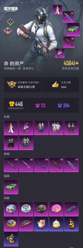 [14484724]安卓【小号/小丑鱼/百万伏特背包/7粉装-5特效呛-1载具】 手q-45887热力值-5王牌印记-103套装-127呛皮 【热门品类】:套装-小丑鱼 【粉色载具】:兰博基尼aventad svj(翡翠绿) 【粉色套装】:粉装-数码大师,粉装-银龙傲海,粉装-骨龙祭渊,粉装-山涧鹿灵,粉装-吟月归客,粉装-蓝莓炮弹,角色-萨利娅 【粉色呛皮等级】:akm-梦之光华七级,m416-五爪金龙七级,kar98k-巳巳如意二级,slr-暗夜玫瑰六级,dp-28-豹影疾电五级 【粉色呛皮】:akm-梦之光华,m416-五爪金龙,kar98k-巳巳如意,slr-暗夜玫瑰,dp-28-豹影疾电 【粉色降落伞】:极限特训降落伞,百万伏特降落伞,星之彼岸降落伞,暗夜玫瑰降落伞,蓝莓炮弹降落伞,未来领航者降落伞,幻彩电音降落伞 【稀有套装】:角色-夜瞳黯灵 【稀有呛皮】:akm-冰凉西瓜,akm-彩虹符号,akm-百万伏特,akm-萌趣颜团子,akm-虎虎生威,akm-霓虹街区,m16a4-幻世战舞者,scar-l-暗夜玫瑰,scar-l-玉兔迎春,scar-l-红色方程式,m416-糯团青竹,m416-红色方程式,groza-异彩先驱,groza-春暖花开,groza-林间仙鹿,groza-蓝莓炮弹,aug-天降萌叽,aug-青春冒险家,q-彩虹符号,q-电玩视界,m762-天降萌叽,m762-瑞龙福将,mk47-洛神天依,mk47-百万伏特,mk47-青春冒险家,g36c-时空追击者,g36c-暗夜玫瑰,ac-val-天降萌叽,ac-val-快闪甜心,uzi-天降萌叽,uzi-炫彩节奏,uzi-生命誓言,uzi-金玉无双,ump45-时空追击者,ump45-春暖花开,ump45-生命誓言,ump45-金玉无双,vect-暗夜玫瑰,vect-生命誓言,vect-金玉无双,汤姆逊-奇异狩猎者,汤姆逊-异彩先驱,汤姆逊-林间仙鹿,野牛-青春冒险家,mp5k-异彩先驱,p90-快闪甜心,p90-巳巳如意,kar98k-欢乐麻酱,kar98k-炫彩节奏,kar98k-王子的夏天,kar98k-电玩视界,kar98k-金玉无双,m24-奇异狩猎者,sks-时空追击者,sks-炫彩节奏,sks-迅猛狂鲨,sks-金玉无双,mini14-异彩先驱,min