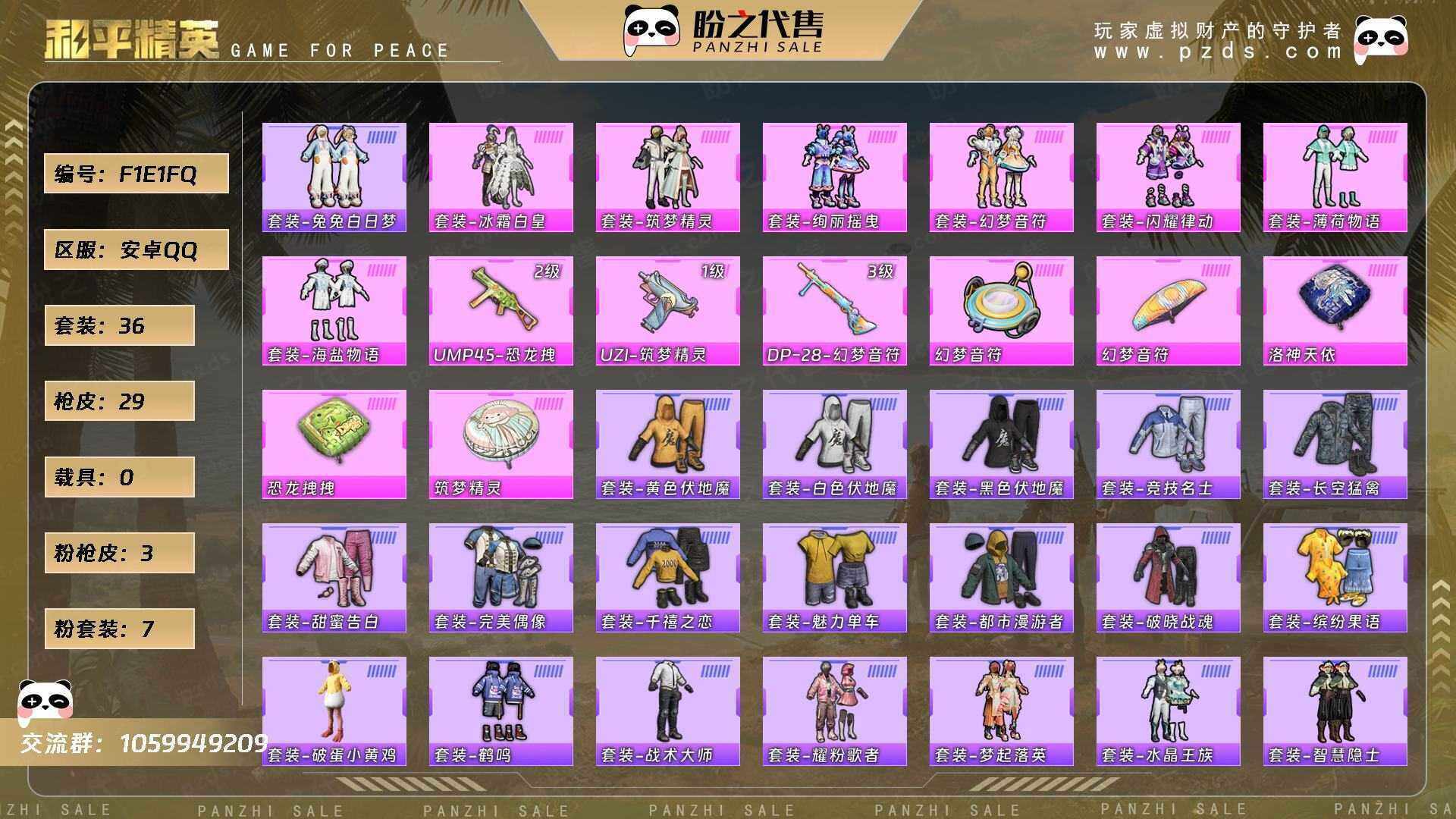 [14485235]安卓 手q-7粉装-3特效呛-0载具-1粉色飞行器-12595热力值-0王牌印记-36套装-29呛皮 【粉色套装】:粉装-冰霜白皇,粉装-海盐物语,粉装-薄荷物语,粉装-幻梦音符,粉装-绚丽摇曳,粉装-闪耀律动,粉装-筑梦精灵 【粉色呛皮等级】:uzi-筑梦精灵一级,ump45-恐龙拽拽二级,dp-28-幻梦音符三级 【粉色呛皮】:uzi-筑梦精灵,ump45-恐龙拽拽,dp-28-幻梦音符 【粉色飞行器】:幻梦音符飞行器 【粉色降落伞】:洛神天依降落伞,恐龙拽拽降落伞,幻梦音符降落伞,筑梦精灵降落伞 【稀有呛皮】:akm-筑梦精灵,groza-恐龙拽拽,groza-紫翼圣骑,aug-幻梦音符,q-彩虹符号,q-洛神天依,q-飞驰魅影,m762-天降萌叽,m762-橘柚倾心,m762-瑞龙福将,g36c-绮梦青鸾,p90-筑梦精灵,p90-飞驰魅影,kar98k-飞驰魅影,sks-幻梦音符,mini14-筑梦精灵,mk14-童趣迷兔,s1897-绮梦青鸾,s1897-飞驰魅影,dp-28-甜心亚梦,dp-28-紫翼圣骑 【其他套装】:套装-ss19特训,套装-千禧之恋,套装-完美偶像,套装-炫蓝之夏,套装-甜蜜告白,套装-白色伏地魔,套装-破晓战魂,套装-破蛋小黄鸡,套装-竞技名士,套装-缤纷果语,套装-耀粉歌者,套装-都市漫游者,套装-长空猛禽,套装-魅力单车,套装-鹤鸣,套装-黄色伏地魔,套装-黑色伏地魔,套装-梦起落英,套装-团圆交子,套装-极速竞梦,套装-飞驰魅影,套装-音速流光,套装-雪兔飞飞,套装-兔兔白日梦,套装-水晶王族,套装-智慧隐士,套装-虚音幻奏,套装-恶魔喵喵 【营地id】:918695039