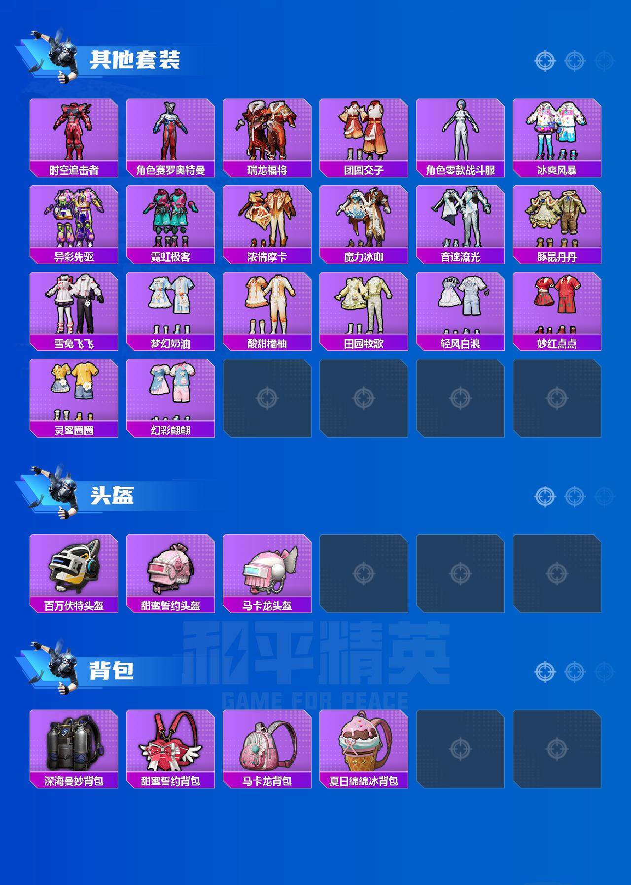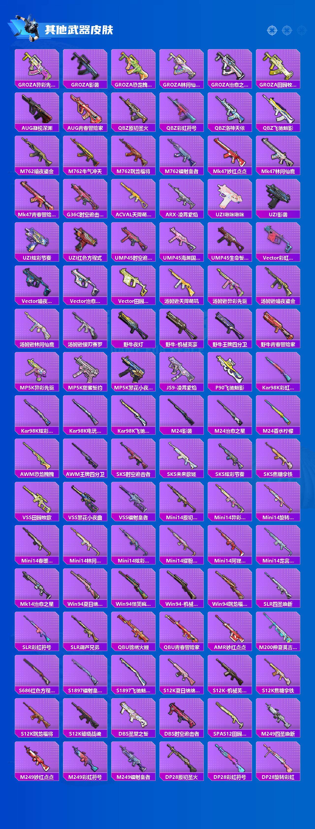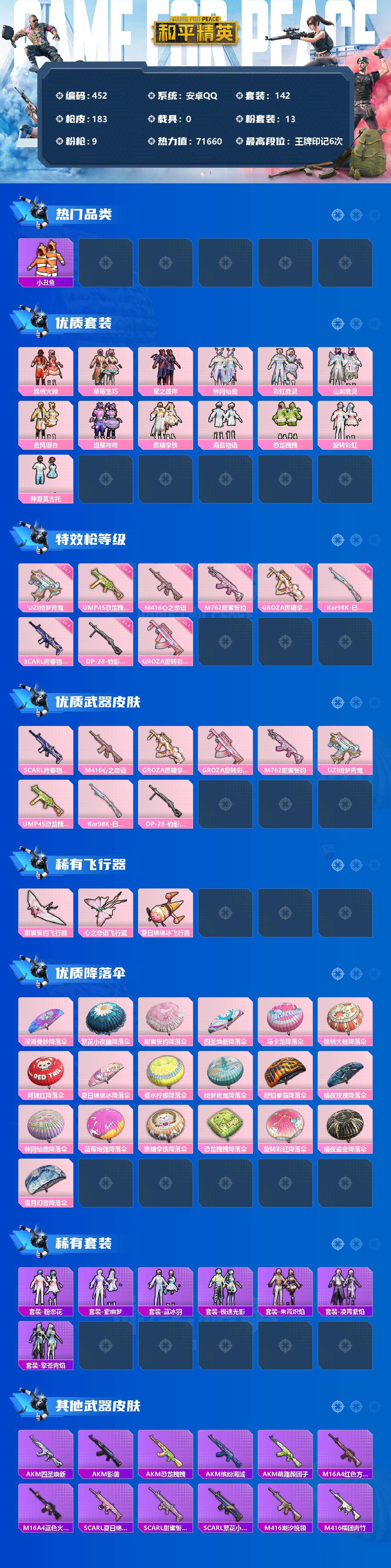 0载具-142套装-183呛皮-142套装/呛械9/装备261/战备113/王牌印记6/热力值71660/四级scar-l-青春物语/七级m416-心之恋语/五级groza-焦糖拿铁/groza-旋转彩虹/七级m762-甜蜜誓约/七级uzi-绮梦青鸾/七级ump45-恐龙拽拽/五级kar98k-巳巳如意/四级dp-28-豹影疾电/套装-浪漫天命/小丑鱼/锦绣火鲤/草莓生巧/星之彼岸/林间仙鹿/彩虹鹿灵/山涧鹿灵/金风银杏/流