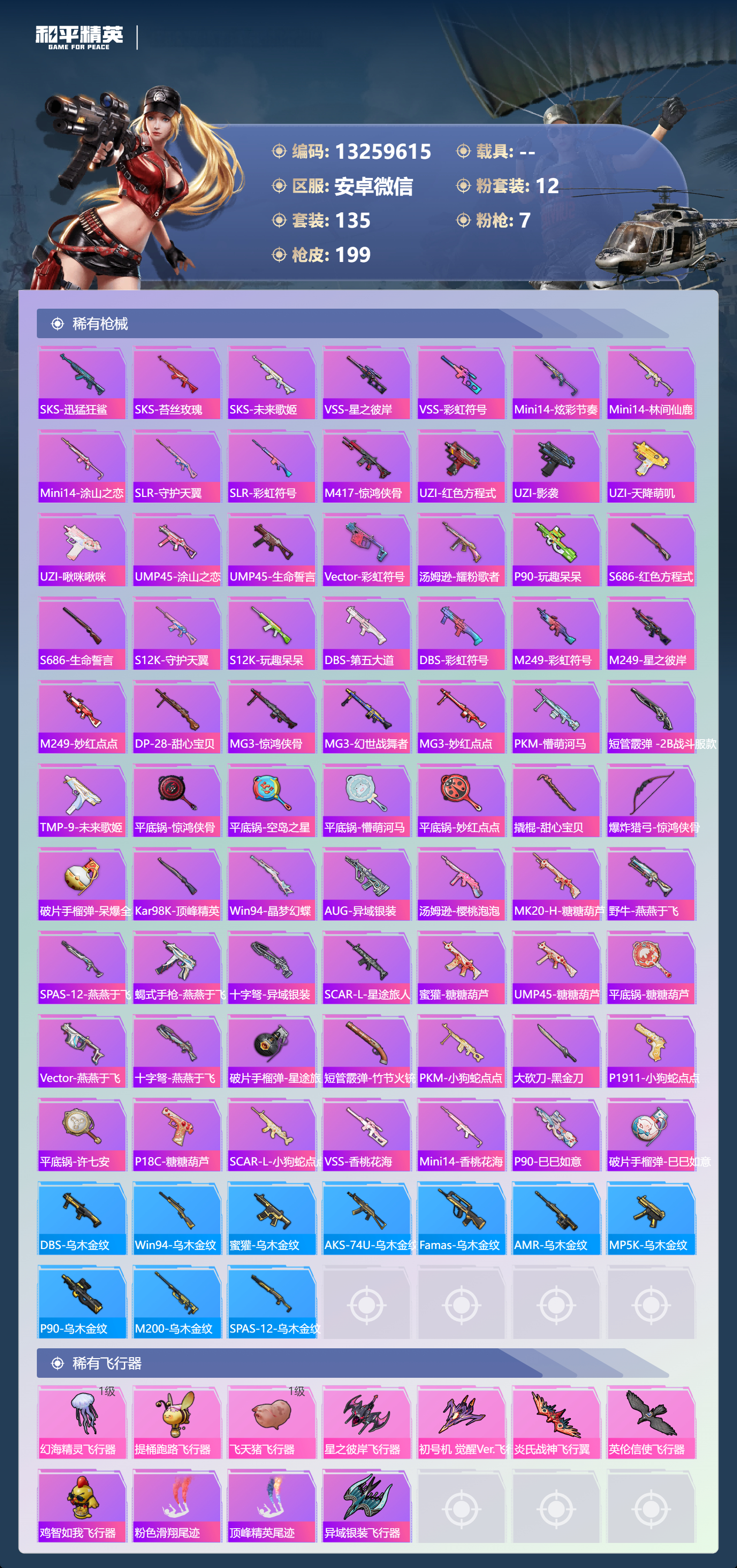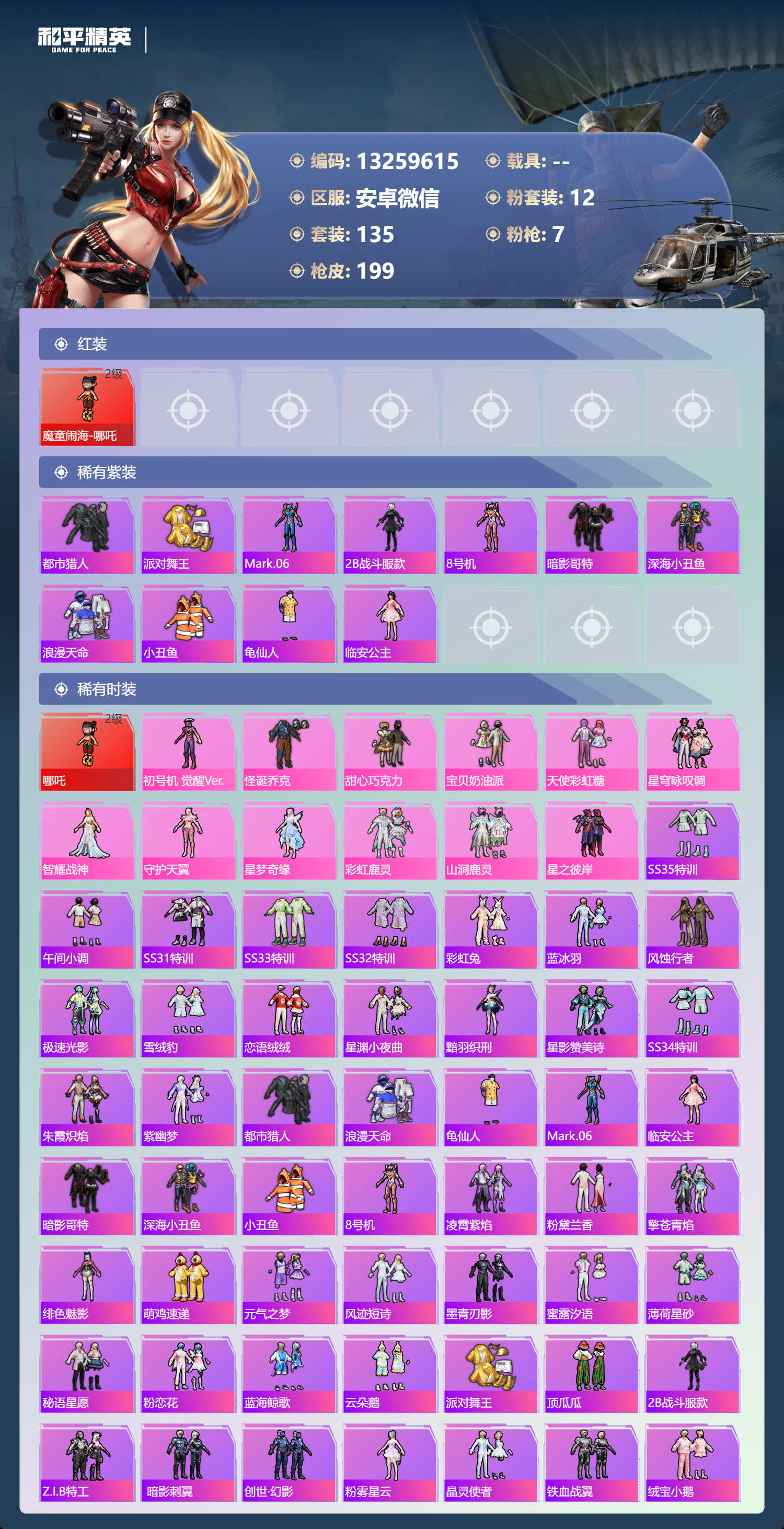 0载具-135套装-199呛皮-【2级 哪吒 巧克力紫螳螂 7升级呛小丑都市哥特金鞋小丑鱼】安卓微信-7王牌印记-1红装-12粉装-7特效呛-63829热力值-135套装-199呛皮-3卓越印记-2传奇印记