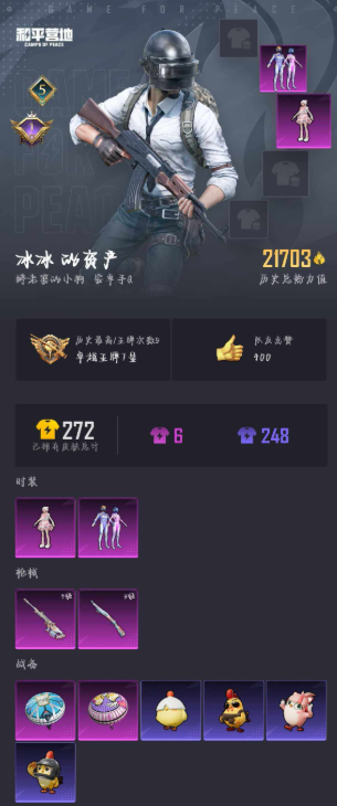 [14485593]安卓 手q-2粉装-2特效呛-0载具-0粉色飞行器-21703热力值-5王牌印记-57套装-86呛皮 【热门品类】:粉装-梦幻火箭 【粉色套装】:粉装-梦幻火箭,角色-羊梦糖心 【粉色呛皮等级】:kar98k-巳巳如意五级,amr-智耀战神四级 【粉色呛皮】:kar98k-巳巳如意,amr-智耀战神 【粉色降落伞】:梦幻火箭降落伞,异瞳寒姬降落伞 【稀有套装】:套装-雏菊兔兔,套装-萝兰蝴蝶,套装-小熊娃娃,套装-粉恋花,套装-紫幽梦,套装-蓝冰羽,角色-紫俏灵猫 【稀有呛皮】:akm-灼热熔岩,akm-破晓战魂,akm-龙的传人,m16a4-幻世战舞者,scar-l-炫彩节奏,scar-l-玉兔迎春,scar-l-红色方程式,m416-红色方程式,m416-蓝色火焰,groza-彩虹符号,groza-影袭,groza-荧海星豚,aug-耀粉歌者,q-神秘黑猫,m762-天降萌叽,m762-彩虹符号,g36c-星穹咏叹调,uzi-天降萌叽,uzi-红色方程式,ump45-蓝色火焰,vect-生命誓言,kar98k-彩虹符号,kar98k-梦幻火箭,kar98k-红色方程式,mini14-梦幻火箭,s686-彩虹符号,s686-生命誓言,s686-红色方程式,s1897-炫彩节奏,s1897-神秘黑猫,s12k-玩趣呆呆,s12k-破晓战魂,s12k-幻世战舞者,dbs-彩虹符号,dbs-幻彩电音,m249-破晓战魂,dp-28-彩虹符号,mg3-幻世战舞者 【其他套装】:套装-ss19特训,套装-ss20特训,套装-ss21特训,套装-ss22特训,套装-ss29特训,套装-光之冒险,套装-冷焰舞者,套装-幻世战舞者,套装-战地督导,套装-探宝勇士,套装-旭日情侣,套装-森林游猎者,套装-牛气冲天,套装-特战装甲,套装-特殊使命,套装-猛禽,套装-玉兔迎春,套装-甜蜜告白,套装-白色伏地魔,套装-破晓战魂,套装-破蛋小黄鸡,套装-竞技名士,套装-绯格组合,套装-缤纷果语,套装-超能勇士,套装-长空猛禽,套装-青玉碎影,套装-魅力单车,套装-黄色伏地魔,套装-黑色伏地魔,套装-龙的传人,套装-贵族骑装 【稀有头盔】:梦幻火箭头盔(3级),梦幻火箭头盔(1级) 【稀有背包】:梦幻火箭背包(3级),梦幻火箭背包(1级),深海小丑鱼背包(1级),神秘黑猫背