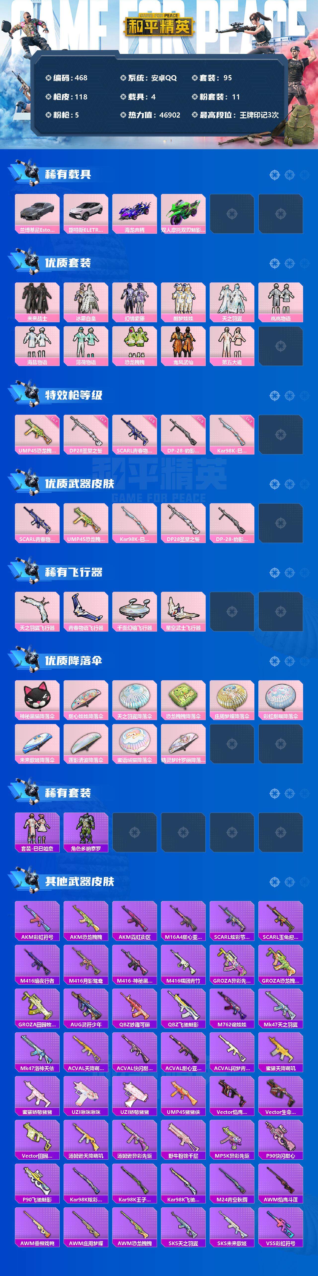 4载具-95套装-118呛皮-95套装/呛械5/装备161/载具4/战备103/王牌印记3/热力值46902/五级scar-l-青春物语/七级ump45-恐龙拽拽/二级kar98k-巳巳如意/七级dp-28-圣堂之誓/五级dp-28-豹影疾电/套装-浪漫天命/套装-红红火火/兰博基尼estoque银翼灰/路特斯eletre花绽灰/海龙奔腾/双人摩托-双刃魅影绿/未来战士/冰霜白皇/幻情紫藤/酣梦娃娃/天之羽翼/