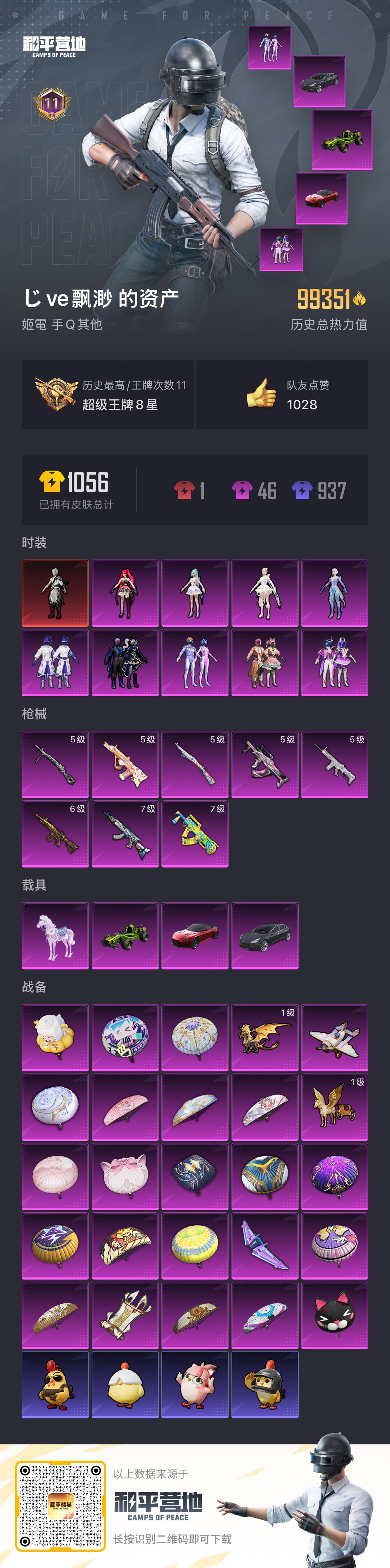 4载具-907套装-286呛皮-实名: 可修改 时装数: 907 载具数: 4 呛械数: 286 战备数: 209 神级装扮: 墨龙九天-敖渊 热门装扮: 奇异狩猎者梦幻火箭新101浪漫波比极致幻想草莓生巧新星烈龙暗夜玫瑰s1赛事上衣潮萌小黄鸭大橘为重激萌罗小黑罗小黑神秘黑猫派对舞王鸢尾晶梦冰域雷