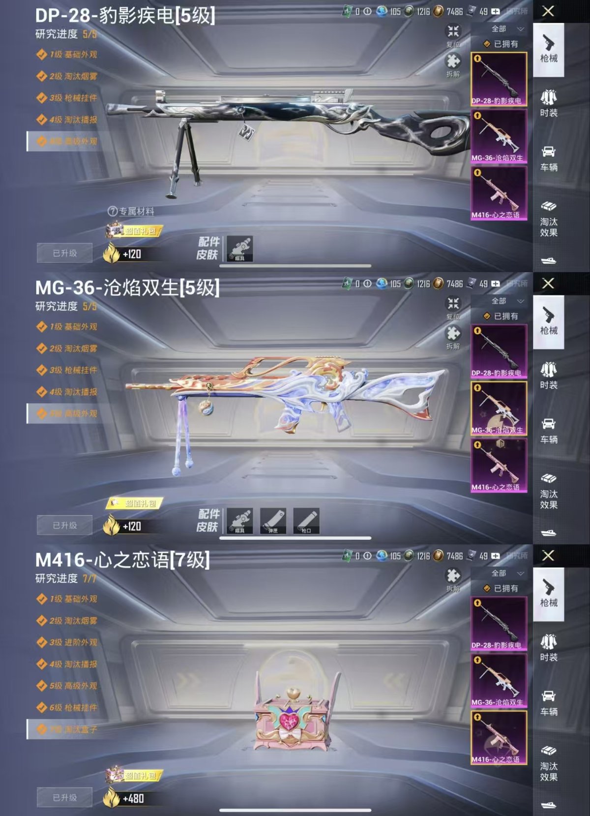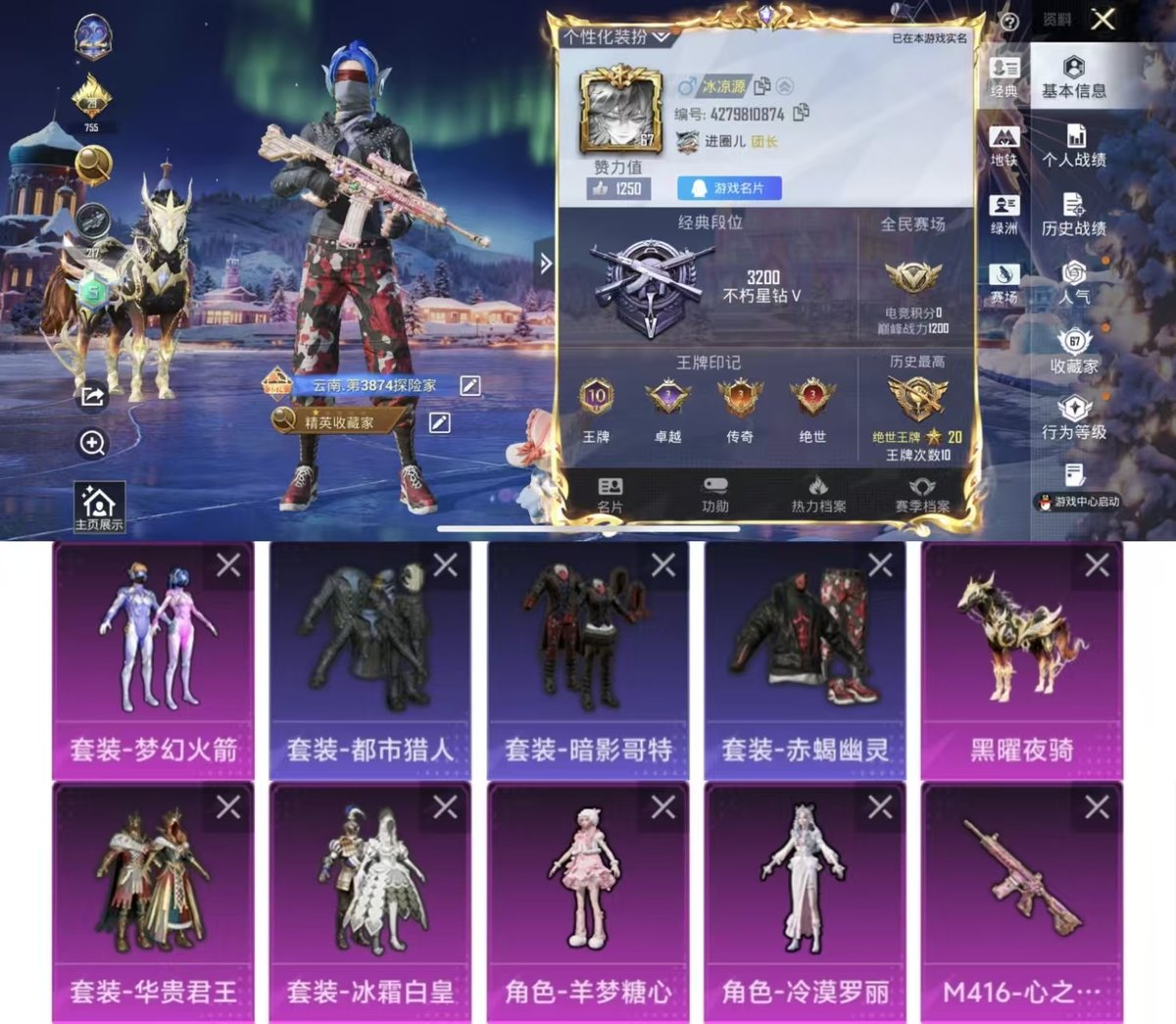 _2300515-实名:可修改时装数:750载具数:1呛械数:210战备数:163热门装扮:梦幻火箭新101呆萌铁蟹迅捷狂鲨鹰眼刺客好奇恐龙都市猎人恒星战甲冰霜白皇华贵君王仓鼠灰灰蔷薇魔法师赤蝎幽灵冷漠罗丽羊梦糖心载具:黑曜夜骑稀有呛皮:m416心之恋语dp-28-豹影疾电mg-36-沧焰双生