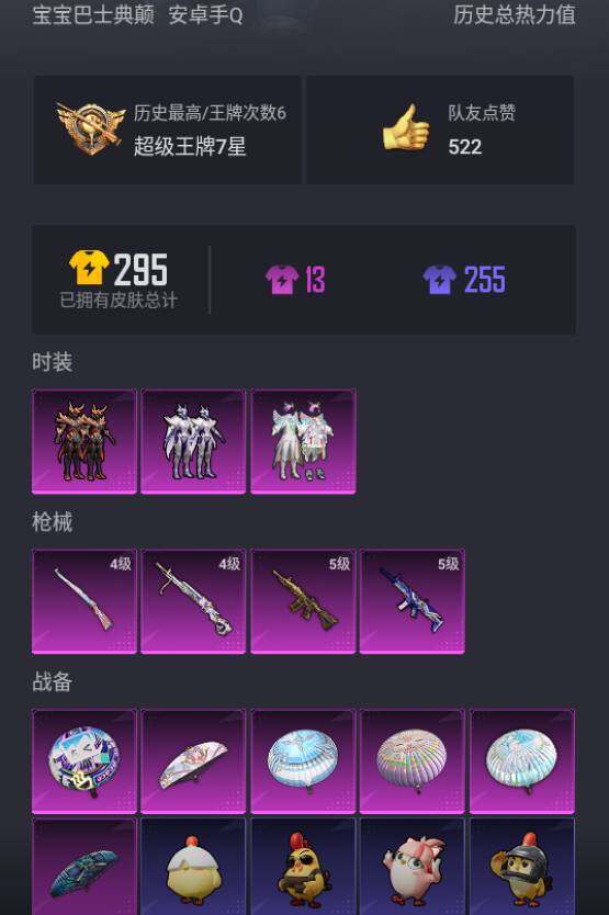 [14485819]安卓 【公主号 山涧鹿灵/】手q-3粉装-4特效呛-0载具-0粉色飞行器-28111热力值-6王牌印记-58套装-95呛皮 【热门品类】:套装-龟仙人 【粉色套装】:粉装-山涧鹿灵,粉装-赤焰黑爵,粉装-紫电风暴 【粉色呛皮等级】:scar-l-青春物语五级,m416-五爪金龙五级,kar98k-巳巳如意四级,dp-28-圣堂之誓四级 【粉色呛皮】:scar-l-青春物语,m416-五爪金龙,kar98k-巳巳如意,dp-28-圣堂之誓 【粉色降落伞】:暗夜玫瑰降落伞,林间仙鹿降落伞,天之羽翼降落伞,冷魅冰骑降落伞,精灵梦叶罗丽降落伞,幻彩电音降落伞 【稀有套装】:套装-龟仙人 【稀有呛皮】:akm-冰凉西瓜,akm-破晓战魂,akm-龙的传人,m16a4-幻世战舞者,m16a4-甜心亚梦,scar-l-炫彩节奏,scar-l-玉兔迎春,scar-l-红色方程式,m416-糯团青竹,m416-红色方程式,groza-异彩先驱,groza-懵萌河马,groza-春暖花开,aug-耀粉歌者,aug-青春冒险家,q-飞驰魅影,m762-牛气冲天,m762-能量风暴,m762-镭射皇者,g36c-懵萌河马,ac-val-天降萌叽,ac-val-甜心亚梦,蜜獾-娇憨猪猪,uzi-娇憨猪猪,ump45-涂山之恋,ump45-炫光之旅,ump45-生命誓言,ump45-蓝色火焰,ump45-诡娃娃,vect-彩虹符号,汤姆逊-天降萌叽,汤姆逊-异彩先驱,mp5k-异彩先驱,p90-筑梦精灵,p90-飞驰魅影,p90-巳巳如意,kar98k-彩虹符号,kar98k-炫彩节奏,kar98k-飞驰魅影,m24-青空秋雨,awm-圣堂之誓,awm-恐龙拽拽,mini14-异彩先驱,mini14-林间仙鹿,mini14-炫彩节奏,slr-娇憨猪猪,莫辛纳甘-懵萌河马,m417-惊鸿侠骨,m200-惊鸿侠骨,s1897-炫彩节奏,s1897-碧影闪光,s1897-飞驰魅影,s12k-香水柠檬,s12k-娇憨猪猪,s12k-幻世战舞者,dbs-彩虹符号,dbs-甜心亚梦,m249-冷魅冰骑,dp-28-甜心亚梦,mg3-幻世战舞者,mg3-惊鸿侠骨,pkm-懵萌河马,p1911-冰封烈焰,战术弩-江南烟雨,爆炸猎弓-惊鸿侠骨 【其他套装】:套装-ss14特训,套装-s