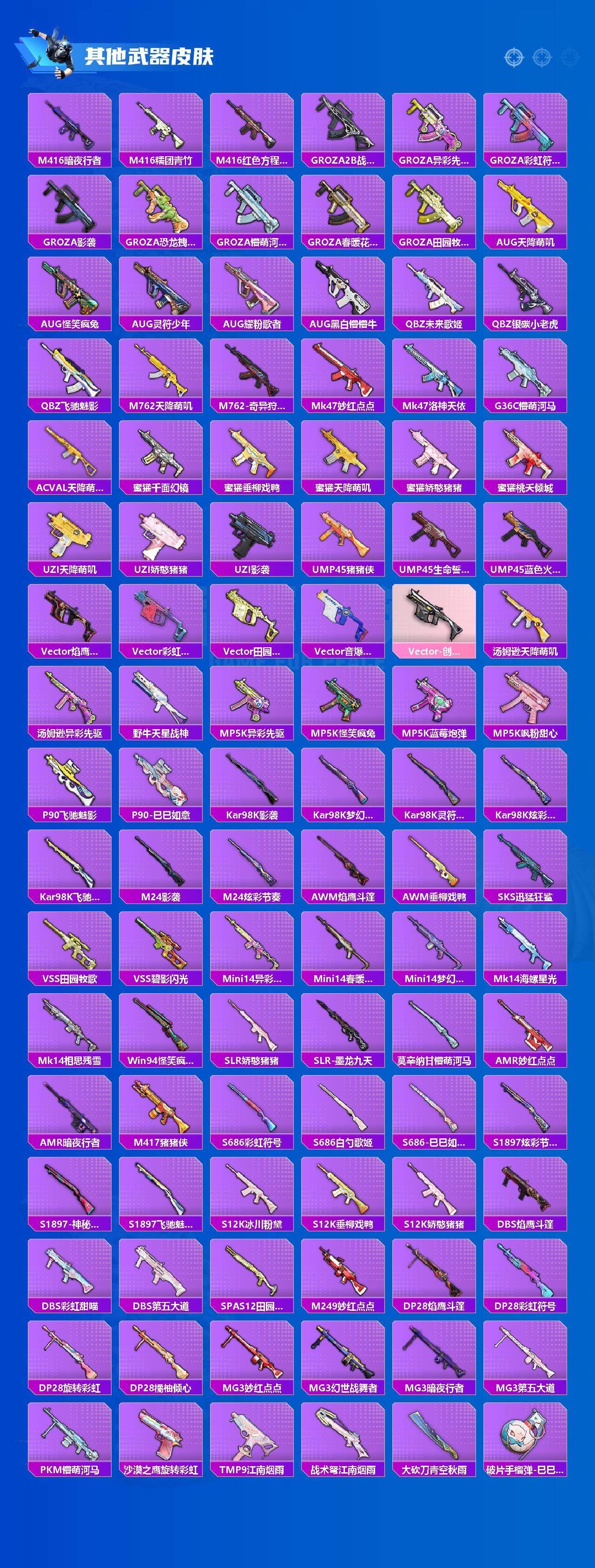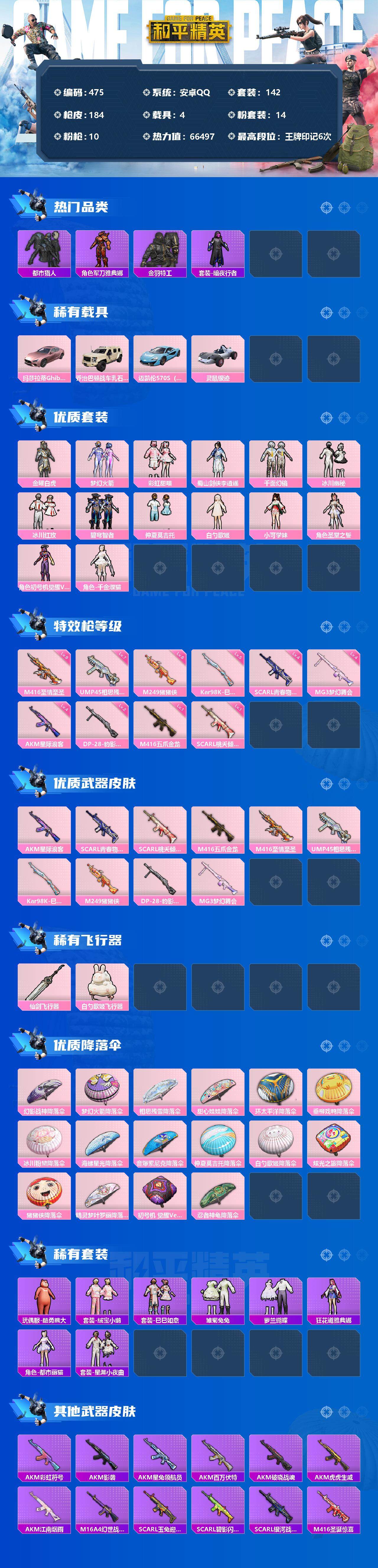 4载具-142套装-184呛皮-142套装/呛械10/装备230/载具4/战备101/王牌印记6/热力值66497/四级akm-星际浪客/四级scar-l-青春物语/scar-l-桃夭倾城/m416-五爪金龙/九级m416-至情至圣/七级ump45-相思残雪/五级kar98k-巳巳如意/六级m249-猪猪侠/二级dp-28-豹影疾电/四级mg3-梦幻舞会/粉装-梦幻火箭/套装-浪漫天命/都市猎人/深海小丑鱼/军刀雅典娜/金羽