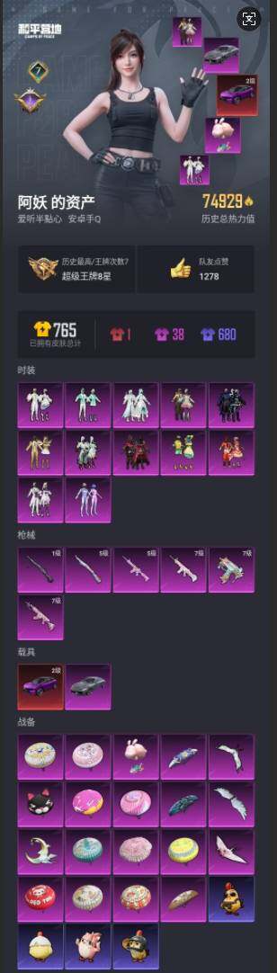 [14487126]安卓 手q【公主号 梦幻火箭 浪漫天命 胖达圆圆 浪漫波比 蝶舞迷情 金属狂野 香水柠檬 薄荷物语 路特斯电光紫二级 僚机-萌兔起飞 满级甜梦小狐 满级甜蜜誓约】-12粉装-6特效呛-2载具-4粉色飞行器-74929热力值-7王牌印记-172套装-190呛皮 【红色载具】:路特斯eletre(电光紫)二级 【热门品类】:粉装-梦幻火箭,套装-浪漫天命,套装-胖达圆圆,套装-浪漫波比,套装-粉红小猪 【粉色载具】:兰博基尼estoque(银翼灰),路特斯eletre(电光紫),僚机-萌兔起飞 【粉色套装】:粉装-蝶舞迷情,粉装-梦幻火箭,粉装-金属狂野,粉装-锦绣火鲤,粉装-迷蝶贵族,粉装-炙焰红王,粉装-香水柠檬,粉装-绮梦青鸾,粉装-暗夜玫瑰,粉装-天之羽翼,粉装-薄荷物语,粉装-寒光使者 【粉色呛皮等级】:scar-l-甜梦小狐七级,m416-电玩时刻五级,m762-甜蜜誓约七级,uzi-绮梦青鸾七级,kar98k-巳巳如意五级,dp-28-豹影疾电一级 【粉色呛皮】:scar-l-甜梦小狐,m416-电玩时刻,m762-甜蜜誓约,uzi-绮梦青鸾,kar98k-巳巳如意,dp-28-豹影疾电 【粉色飞行器】:甜蜜誓约飞行器,绮梦青鸾飞行器,相思残雪飞行器,天之羽翼飞行器 【粉色降落伞】:春暖花开降落伞,神秘黑猫降落伞,甜蜜誓约降落伞,潮汐统领降落伞,锦绣火鲤降落伞,阿狸红降落伞,香水柠檬降落伞,绮梦青鸾降落伞,暗夜玫瑰降落伞,海渊国主降落伞,蓝莓炮弹降落伞,青春物语降落伞,甜梦小狐降落伞,圣光天使降落伞 【稀有套装】:套装-燕燕于飞,套装-鱼渊荷华,套装-紫幽梦,套装-蓝冰羽,角色-猎影月神,套装-云朵鹅,套装-雪绒豹,套装-蓝海鲸歌 【稀有呛皮】:akm-夜灯,akm-彩虹符号,akm-星之彼岸,akm-春暖花开,akm-生命誓言,akm-破晓战魂,akm-筑梦精灵,akm-萌趣颜团子,akm-虎虎生威,akm-锦绣火鲤,akm-阿狸红,akm-霓虹街区,m16a4-幻世战舞者,m16a4-甜心亚梦,scar-l-兔兔白日梦,scar-l-暗夜玫瑰,scar-l-炫彩节奏,scar-l-甜蜜誓约,m416-圣诞惊喜,m416-夜灯,m416-红色方程式,m416-蓝色火焰,groza-异彩先驱,groza-彩虹符号,groza